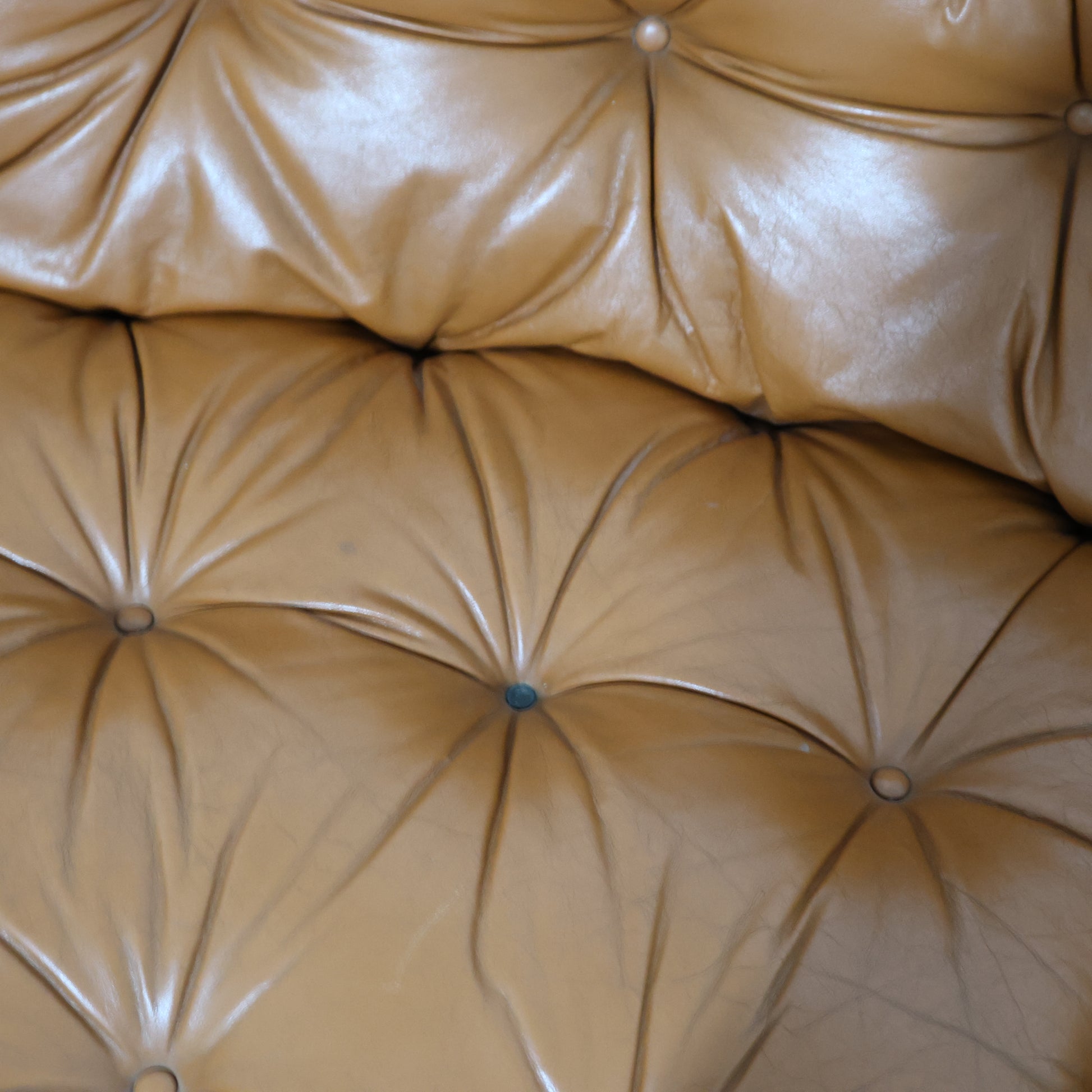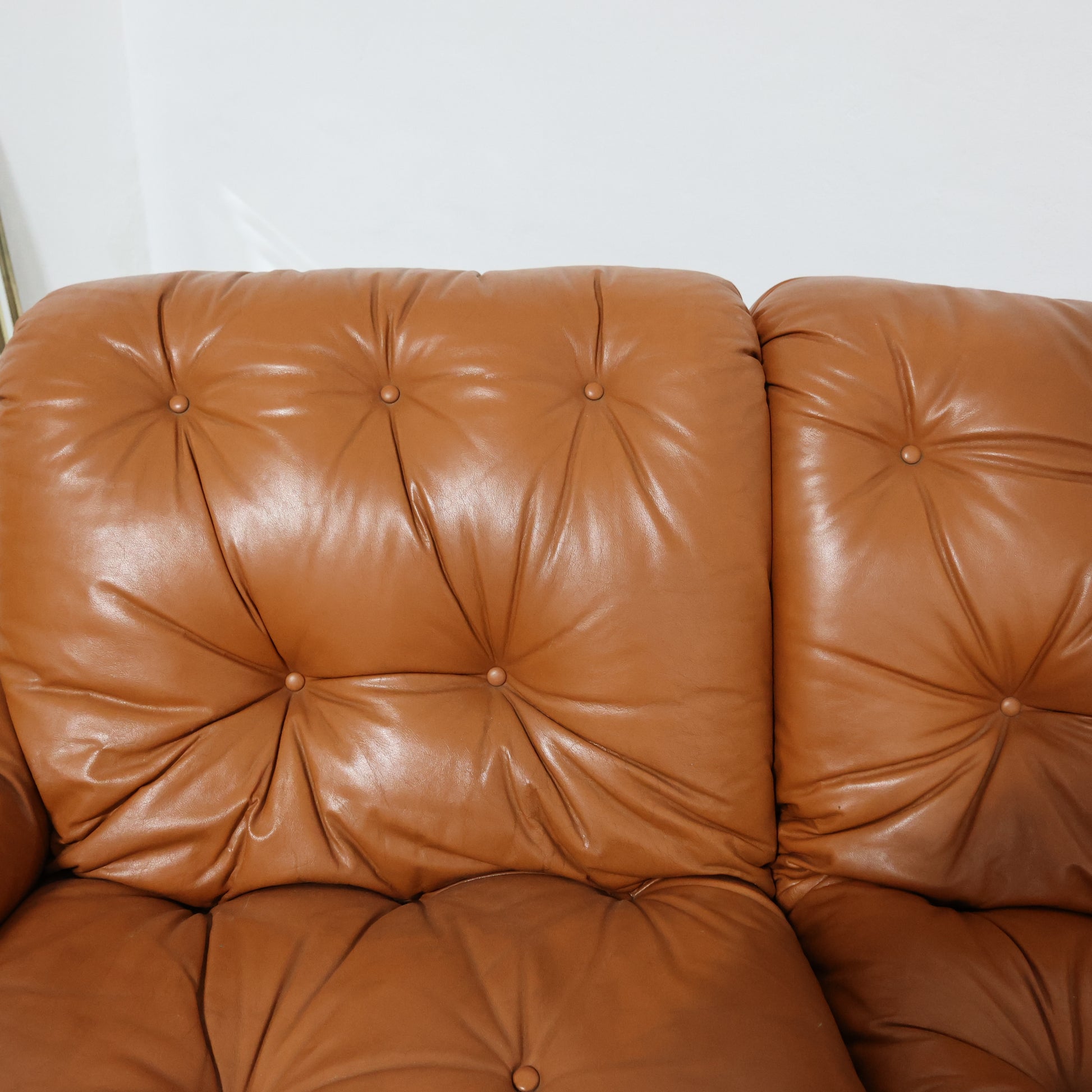 Rivestito in pelle color cuoio, il divano conserva tutto il fascino del modernariato italiano degli anni ’70, rappresentando un perfetto connubio tra design e funzionalità.