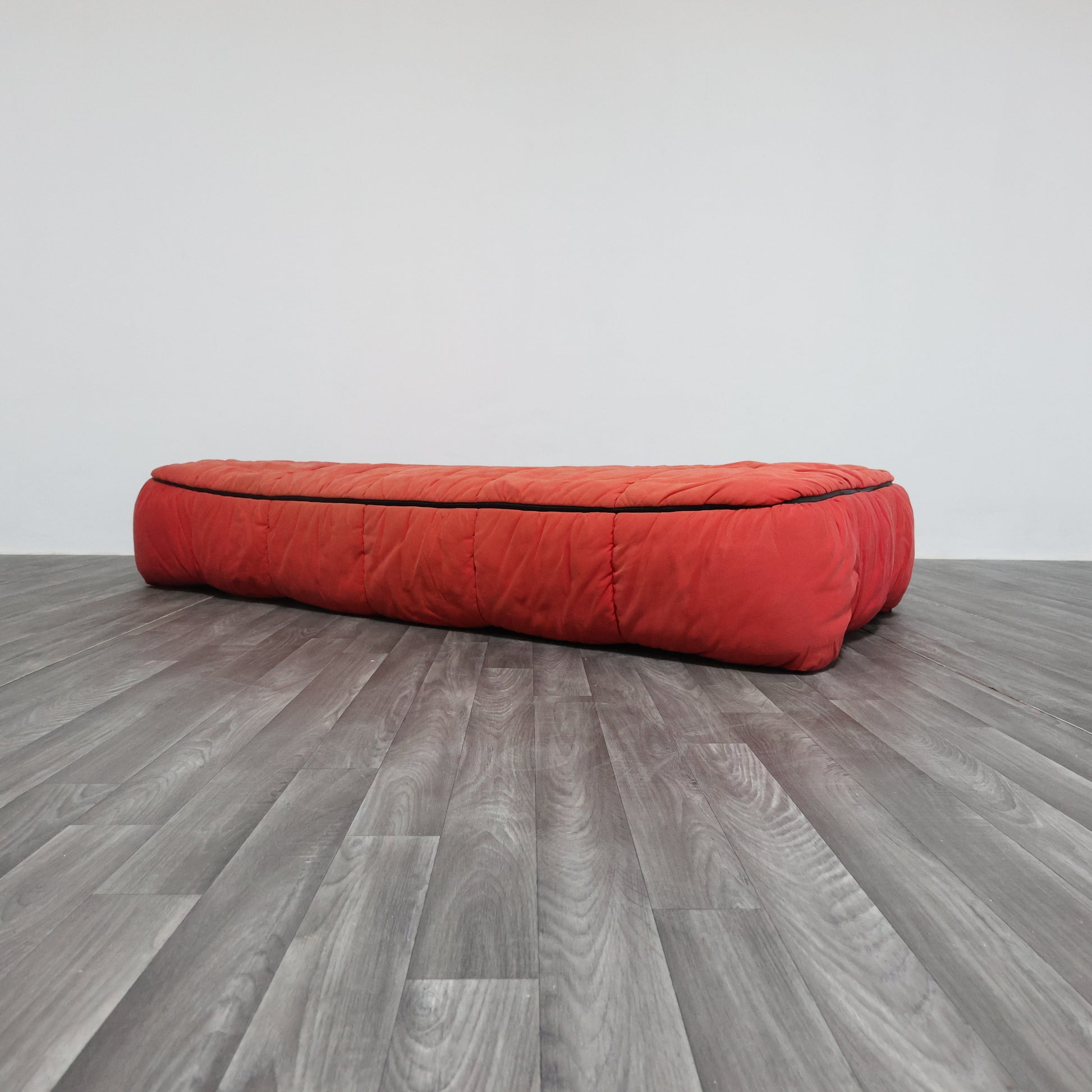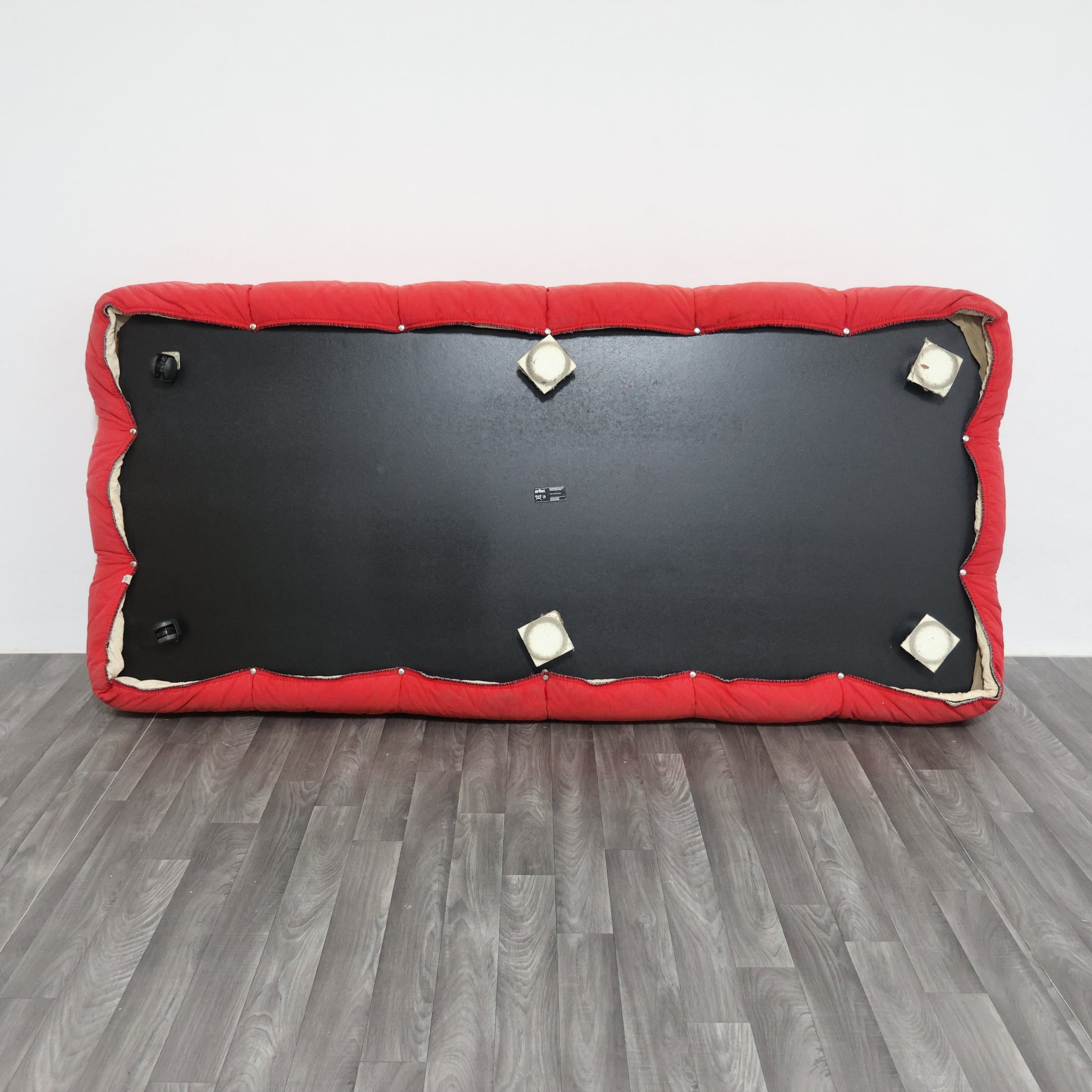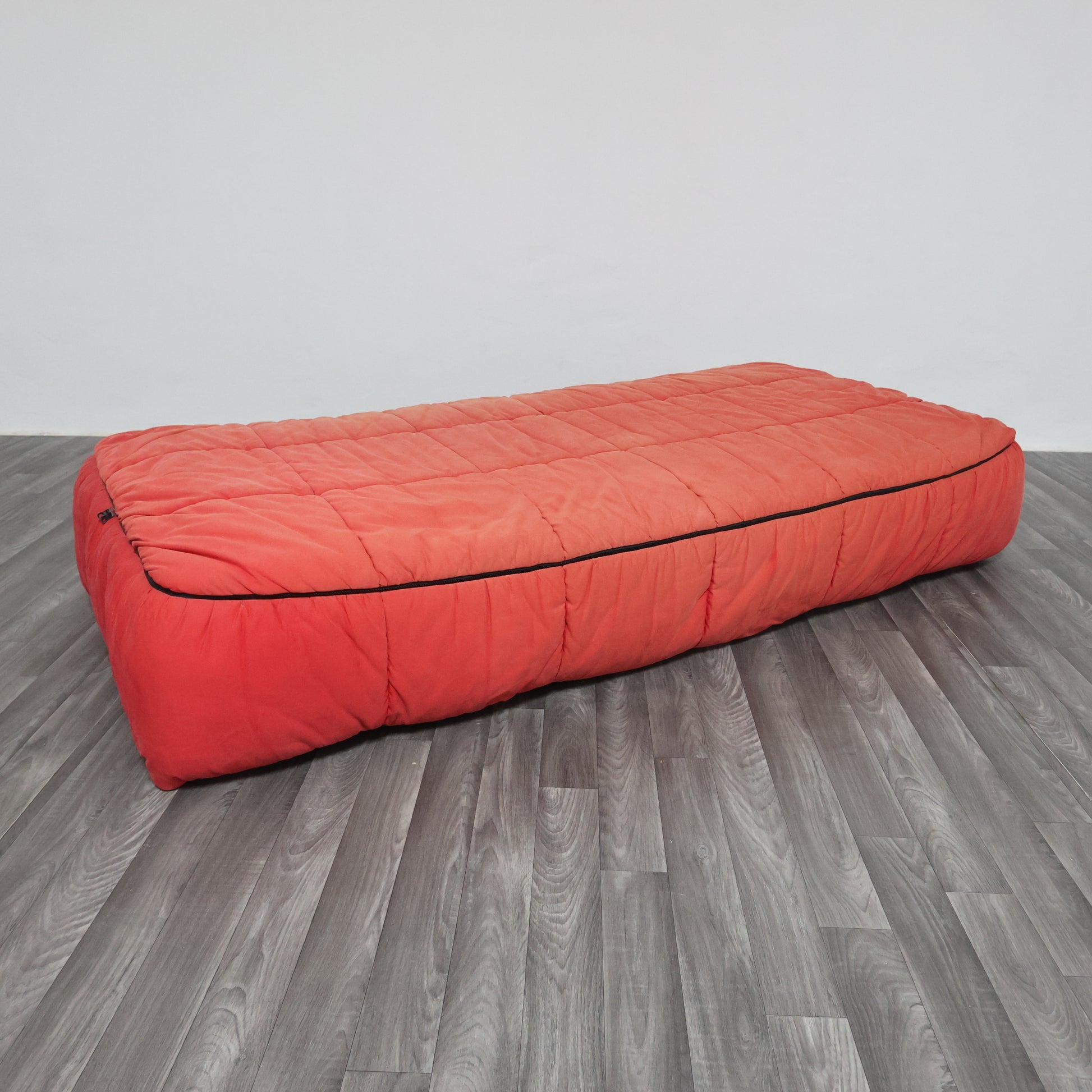Il rivestimento trapuntato imbottito, sfoderabile e lavabile, avvolge il materasso con linee morbide e contemporanee. Il colore rosso acceso lo rende un pezzo di grande impatto visivo e collezionistico.
