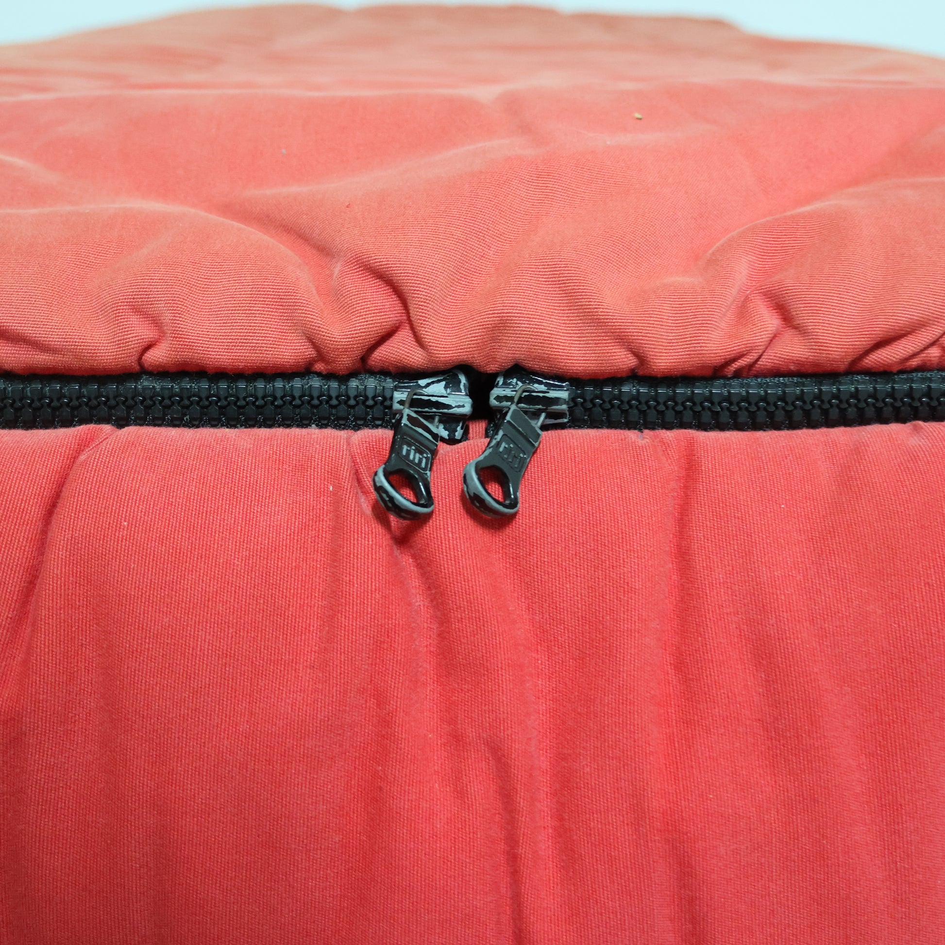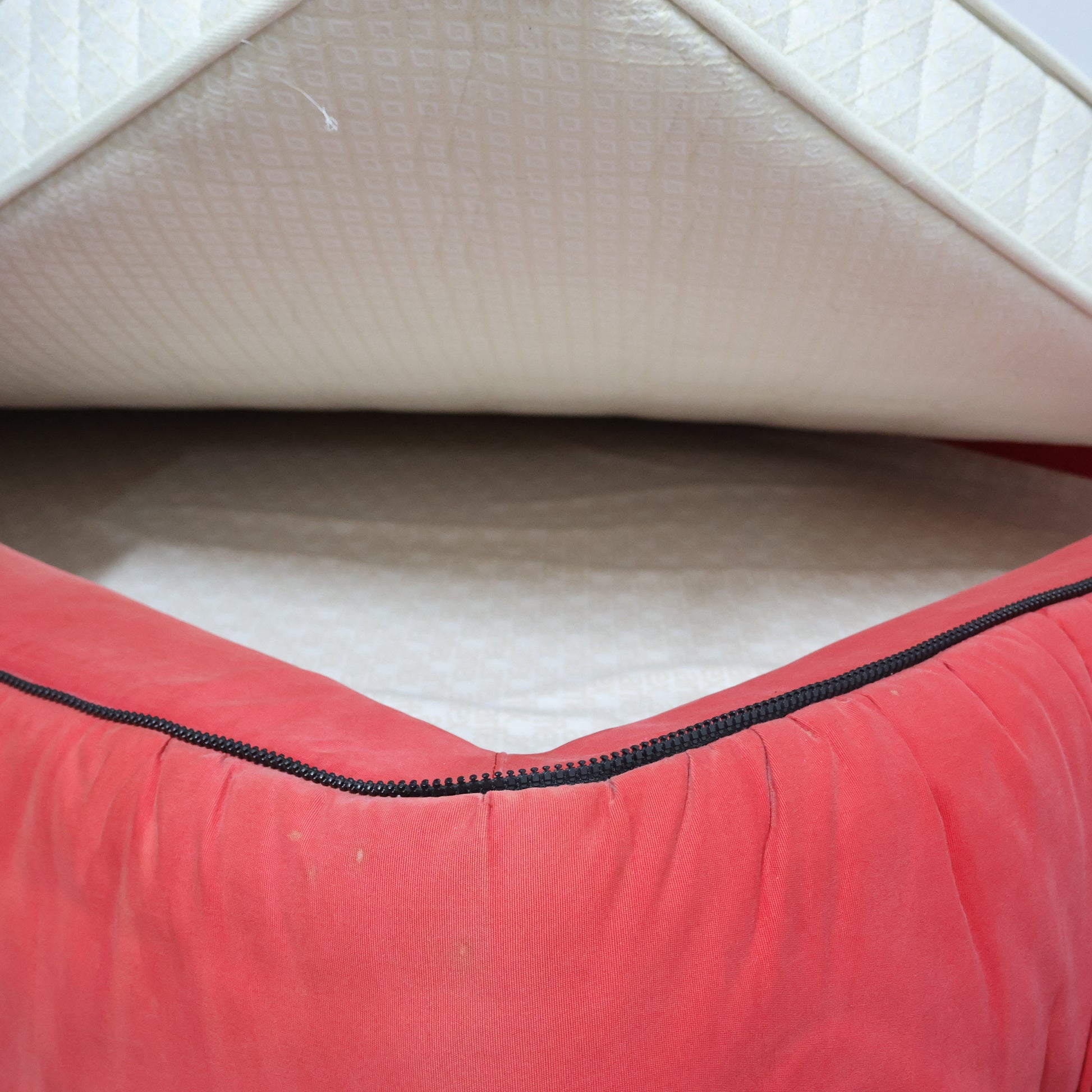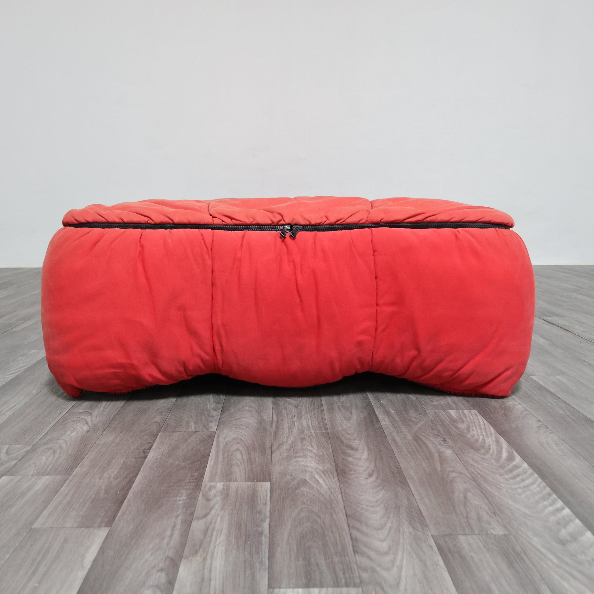 Il rivestimento trapuntato imbottito, sfoderabile e lavabile, avvolge il materasso con linee morbide e contemporanee. Il colore rosso acceso lo rende un pezzo di grande impatto visivo e collezionistico.