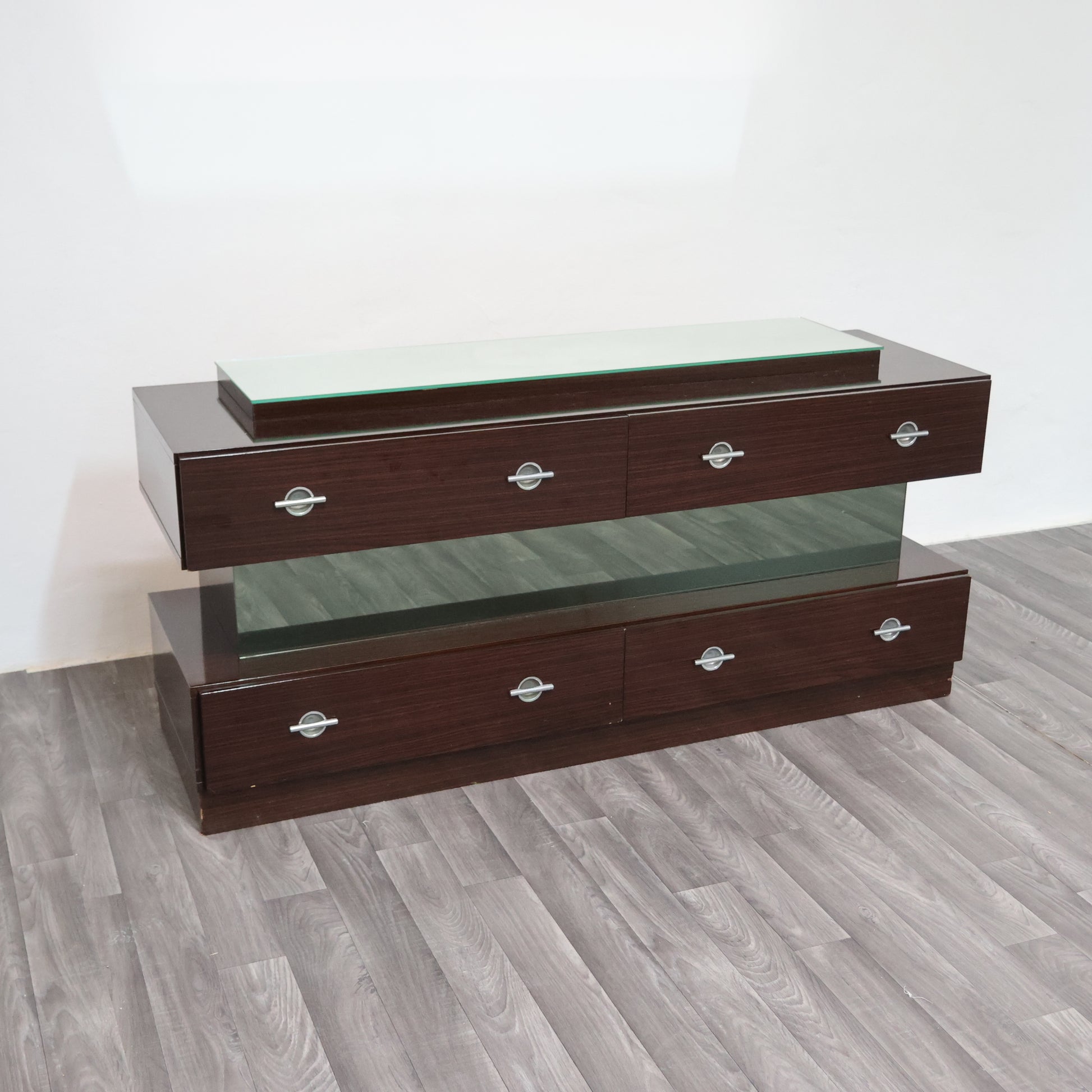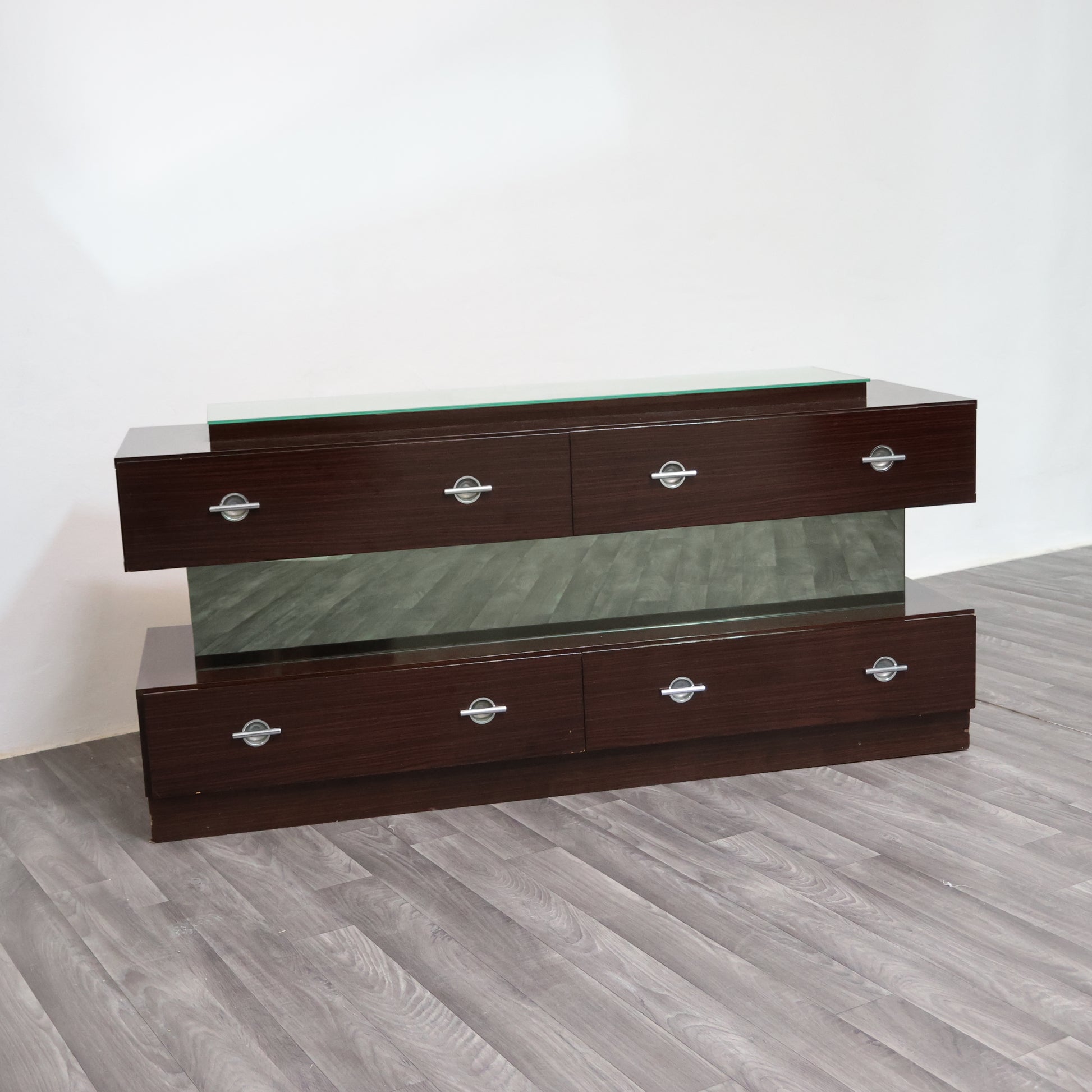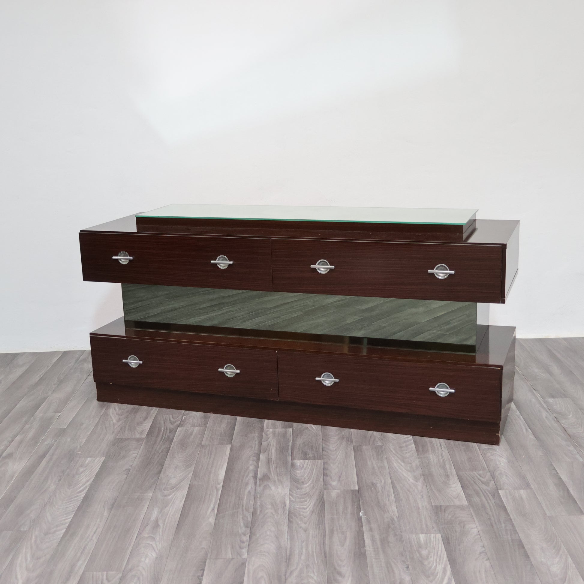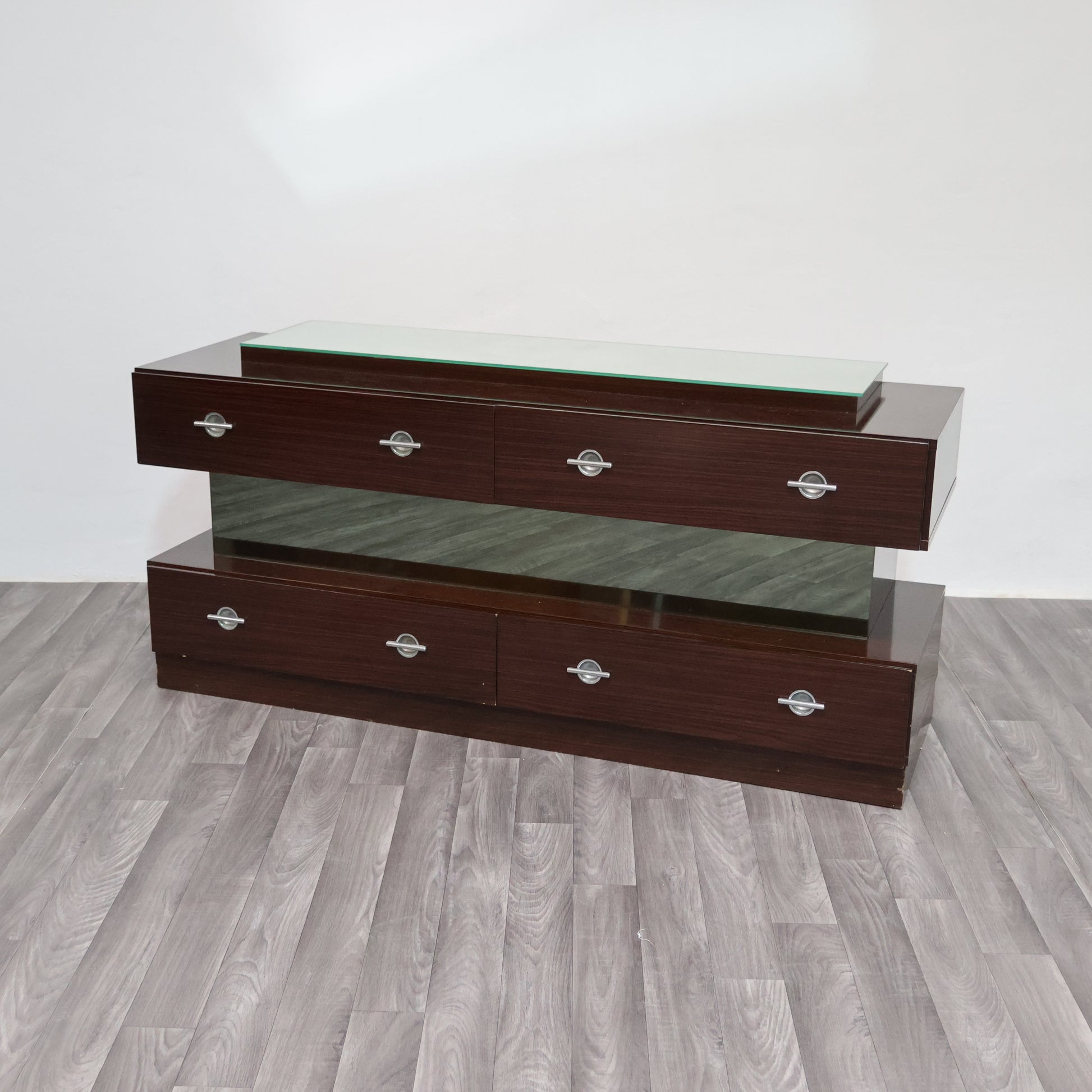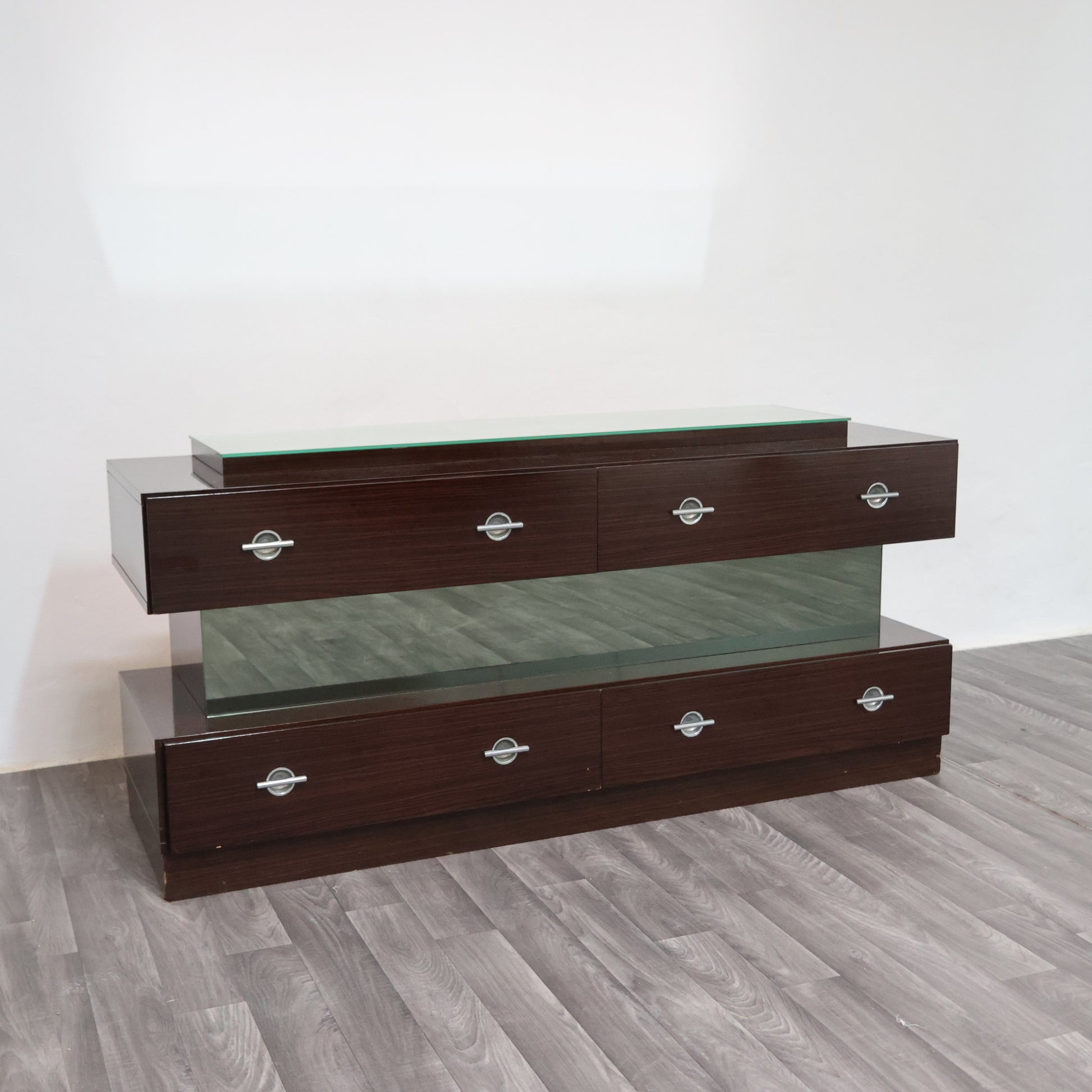 Elegante Comò in Ebano Macassar, realizzato negli anni ’80, caratterizzato da un raffinato design cubico dalle linee essenziali e contemporanee. La struttura geometrica è scandita da quattro cassetti sovrapposti, separati da una lastra frontale in specchio fumé, elemento distintivo che conferisce profondità e un’elegante sensazione di sospensione.