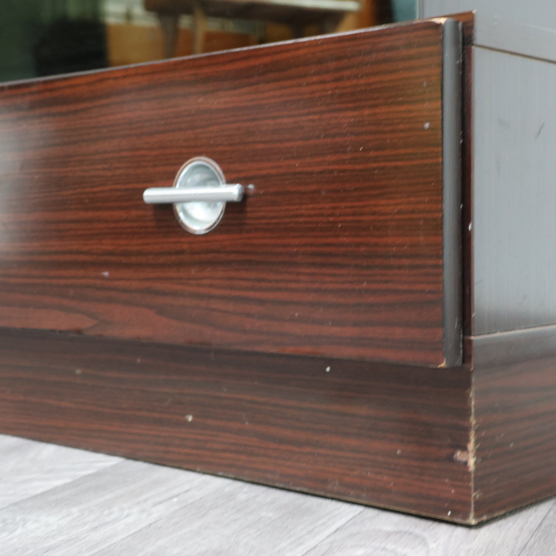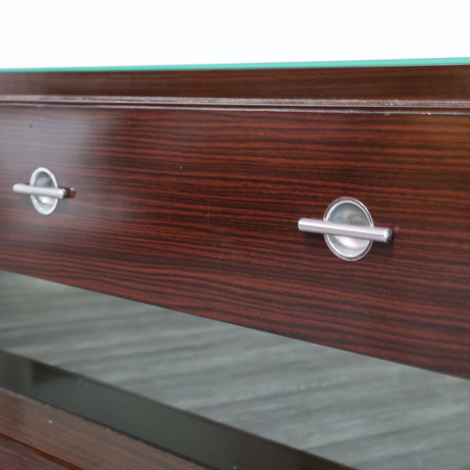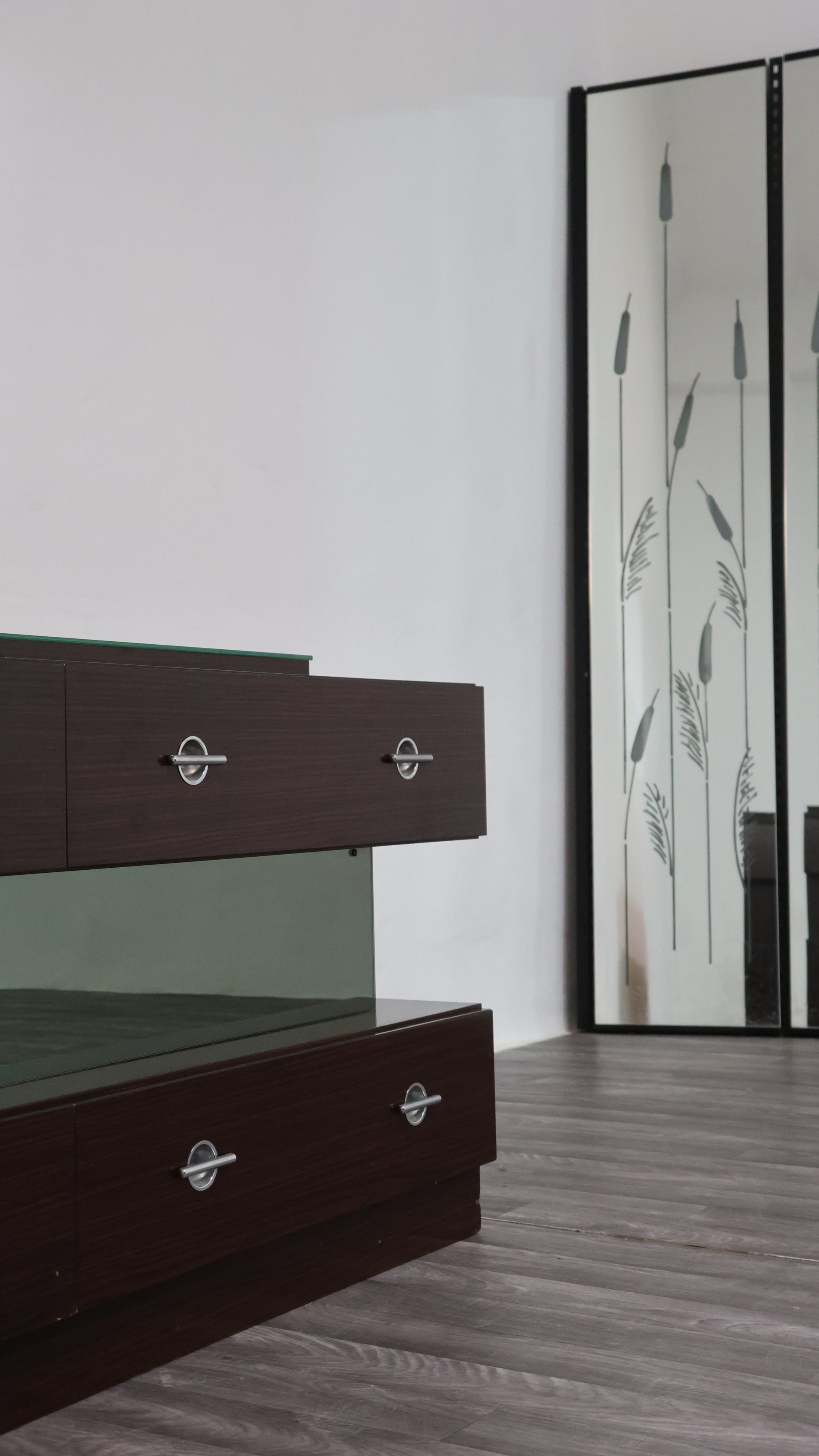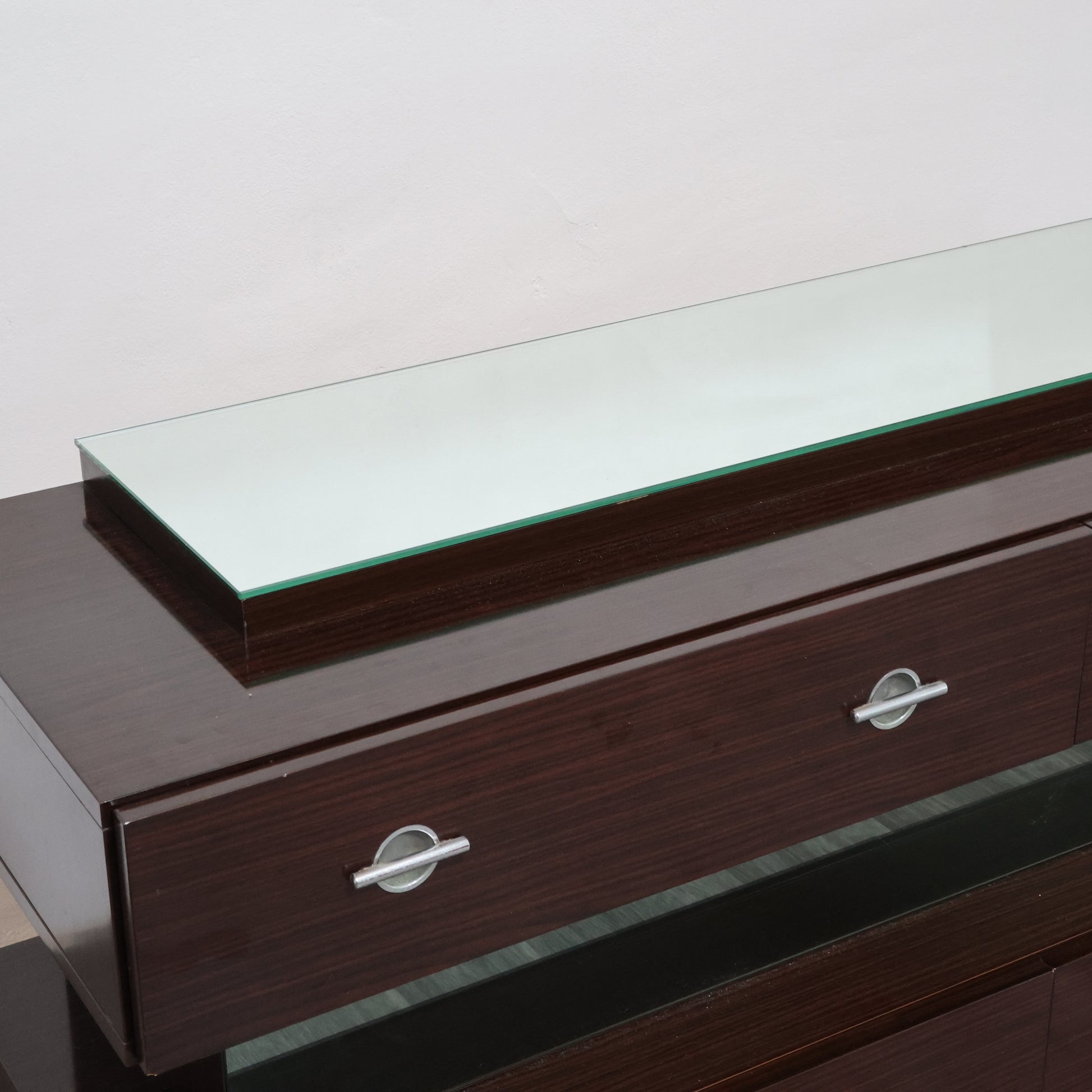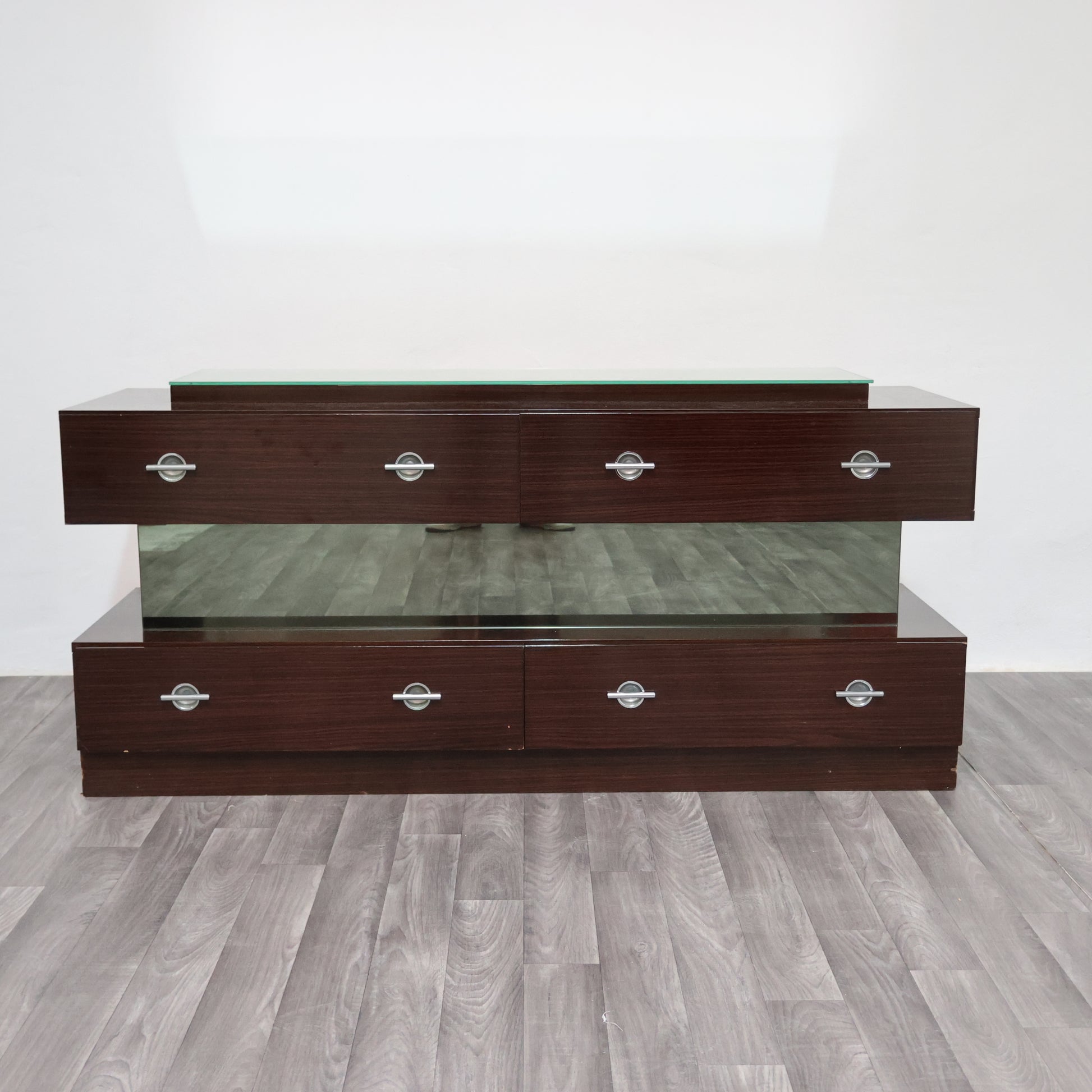 Elegante Comò in Ebano Macassar, realizzato negli anni ’80, caratterizzato da un raffinato design cubico dalle linee essenziali e contemporanee. La struttura geometrica è scandita da quattro cassetti sovrapposti, separati da una lastra frontale in specchio fumé, elemento distintivo che conferisce profondità e un’elegante sensazione di sospensione.