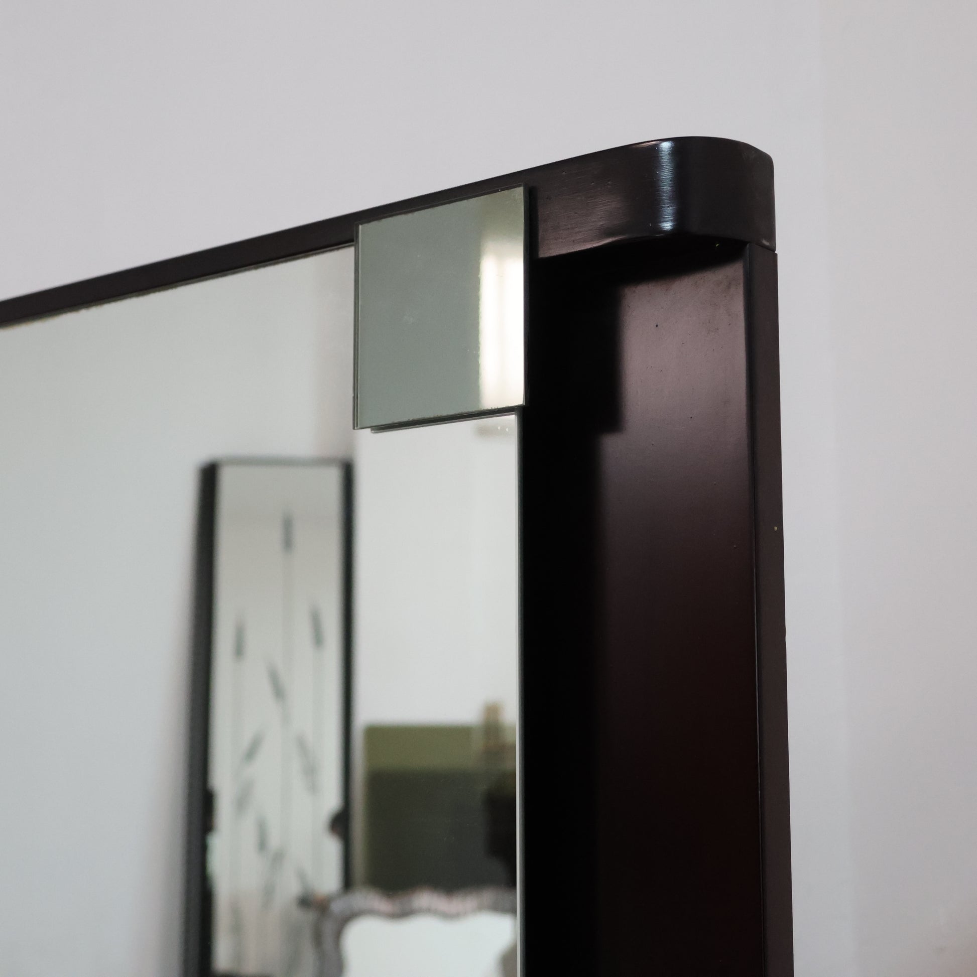 La parte superiore è completata da uno specchio da parete che può tranquilla mente essere poggiato sul comò, un piano in specchio, perfettamente integrato nella sagoma del mobile e ideale per valorizzare la texture scura e lucida dell’ebano. Le maniglie in acciaio donano un tocco modernista e bilanciano armoniosamente il disegno pulito dell’insieme.