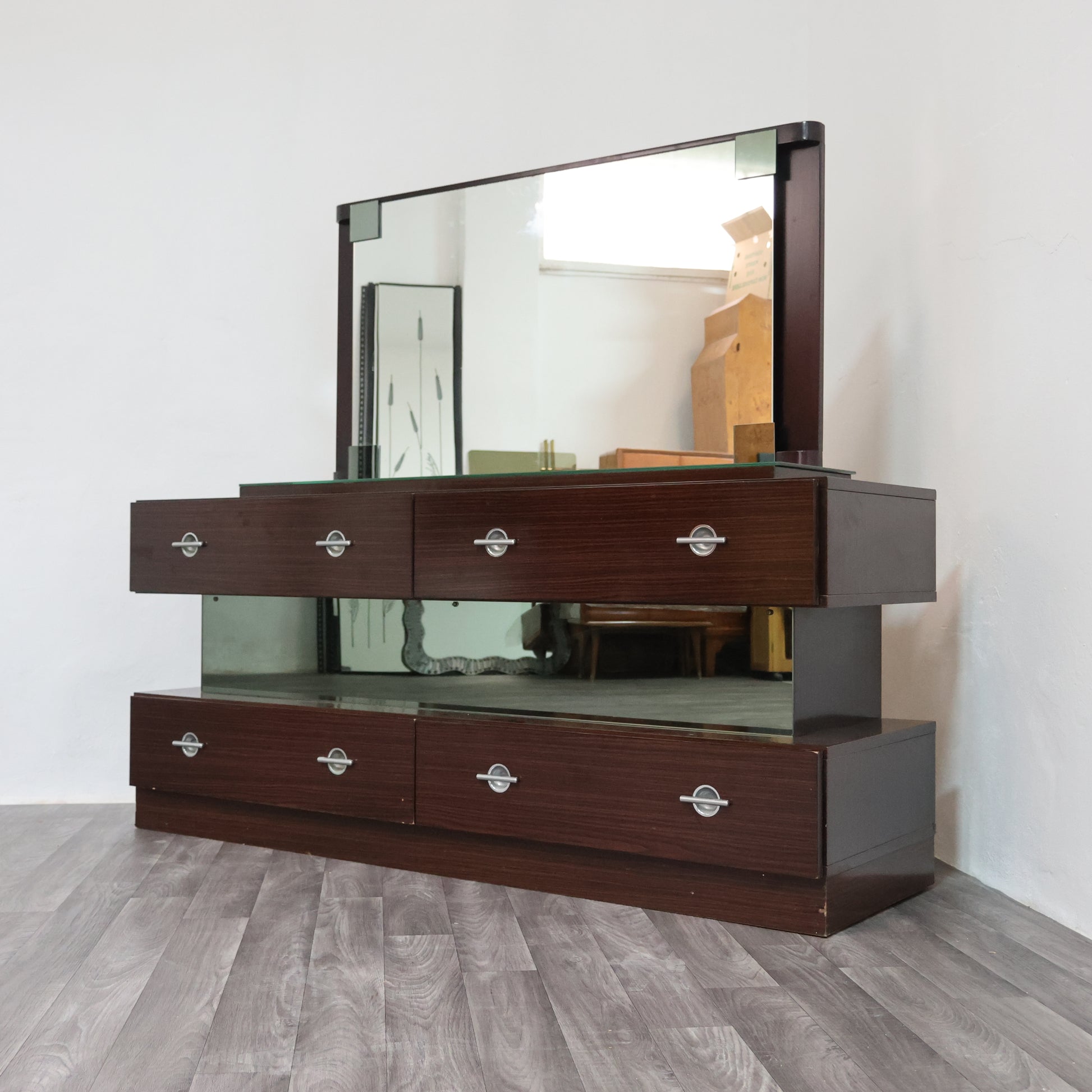 Elegante Comò in Ebano Macassar, realizzato negli anni ’80, caratterizzato da un raffinato design cubico dalle linee essenziali e contemporanee. La struttura geometrica è scandita da quattro cassetti sovrapposti, separati da una lastra frontale in specchio fumé, elemento distintivo che conferisce profondità e un’elegante sensazione di sospensione.
