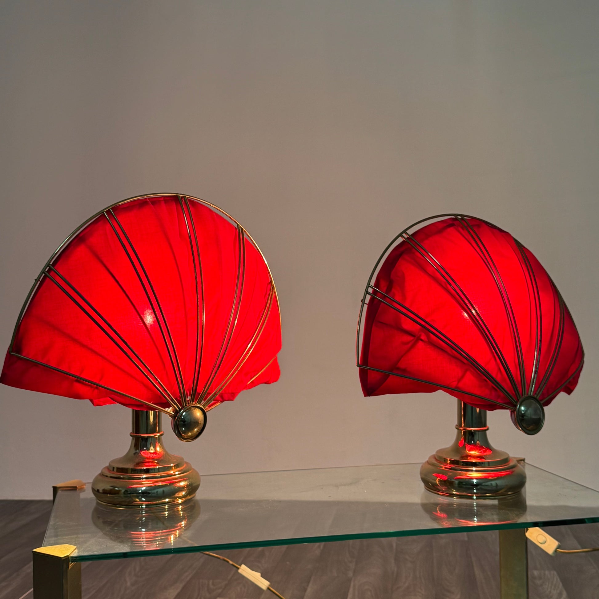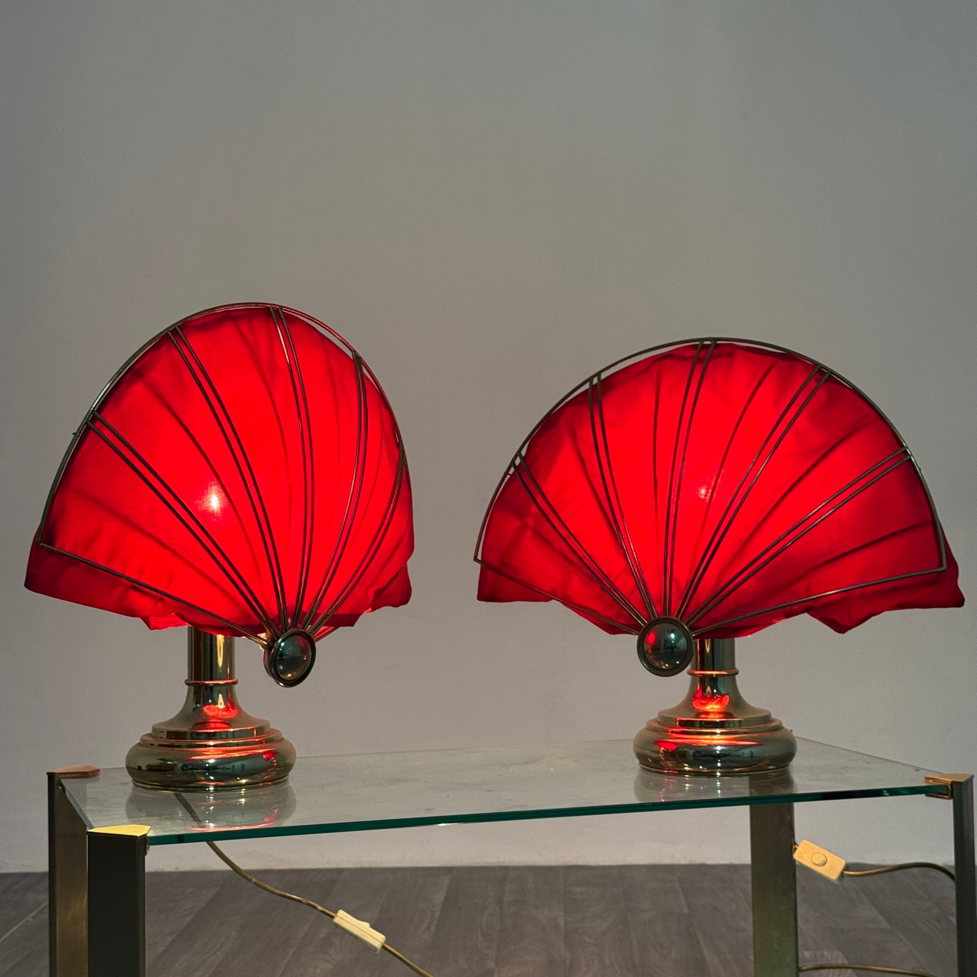 Coppia Di Lampade Da Tavolo A Ventaglio In Ottone Hollywood Regency 1970’s.