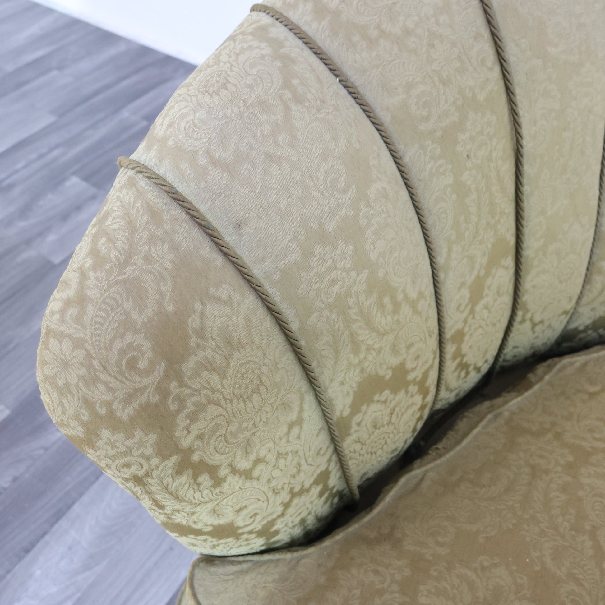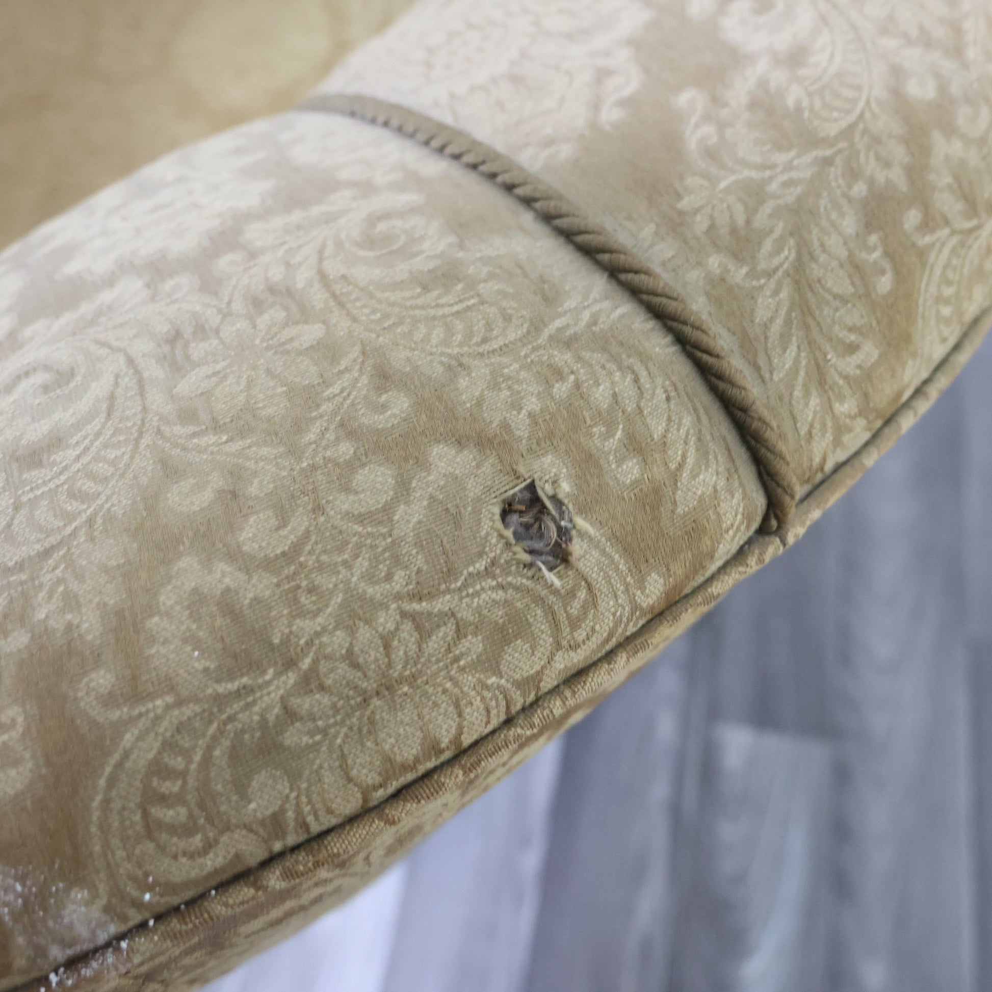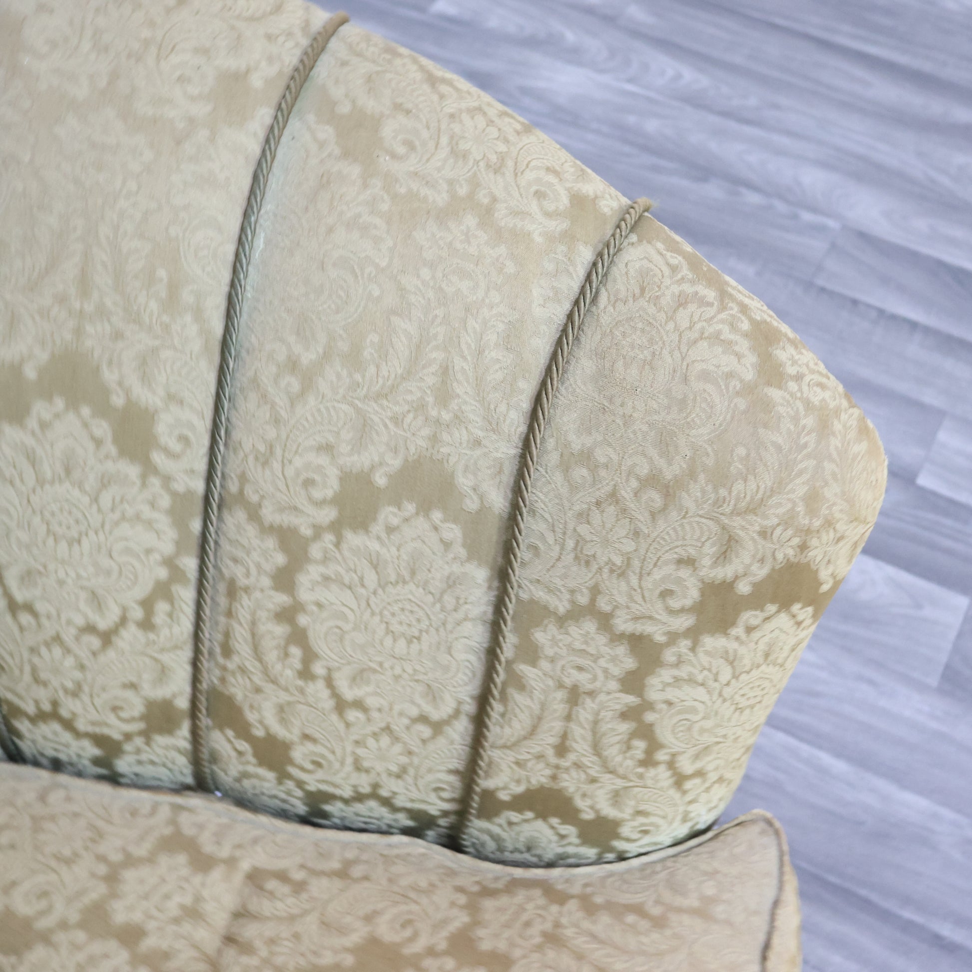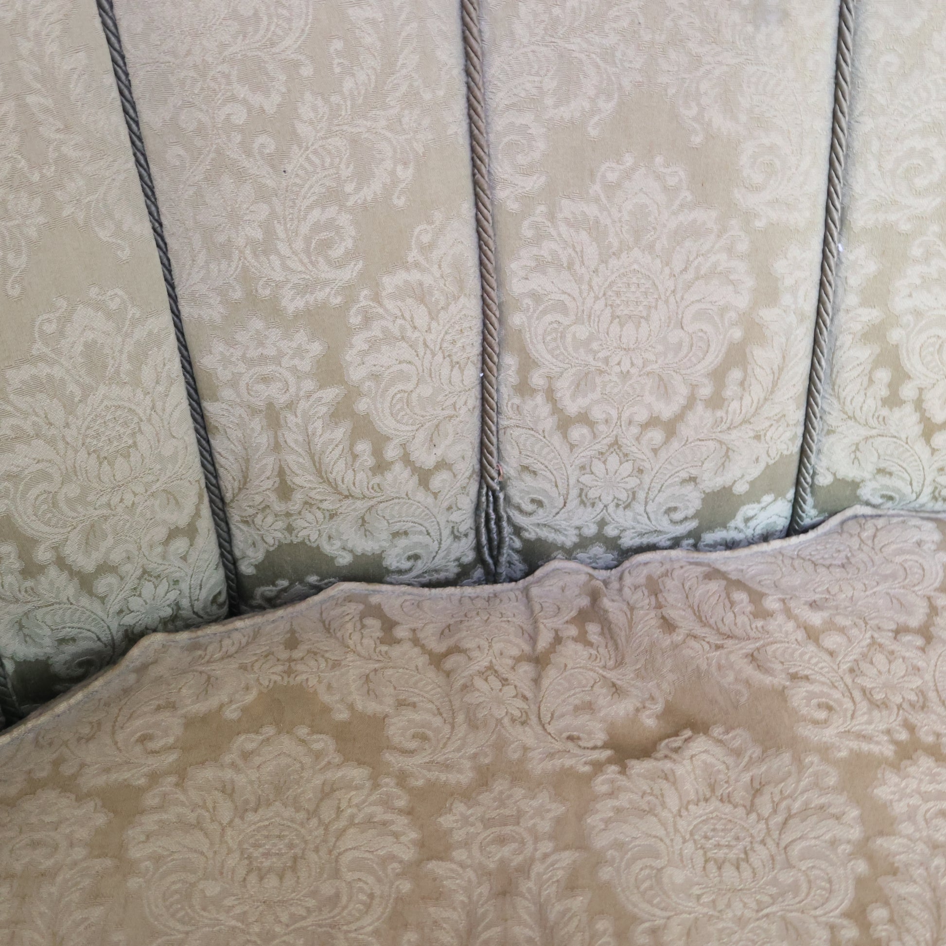 Il rivestimento originale in tessuto damascato color oro è ancora presente, ma mostra segni del tempo e richiede un intervento di restauro o reupholstery.