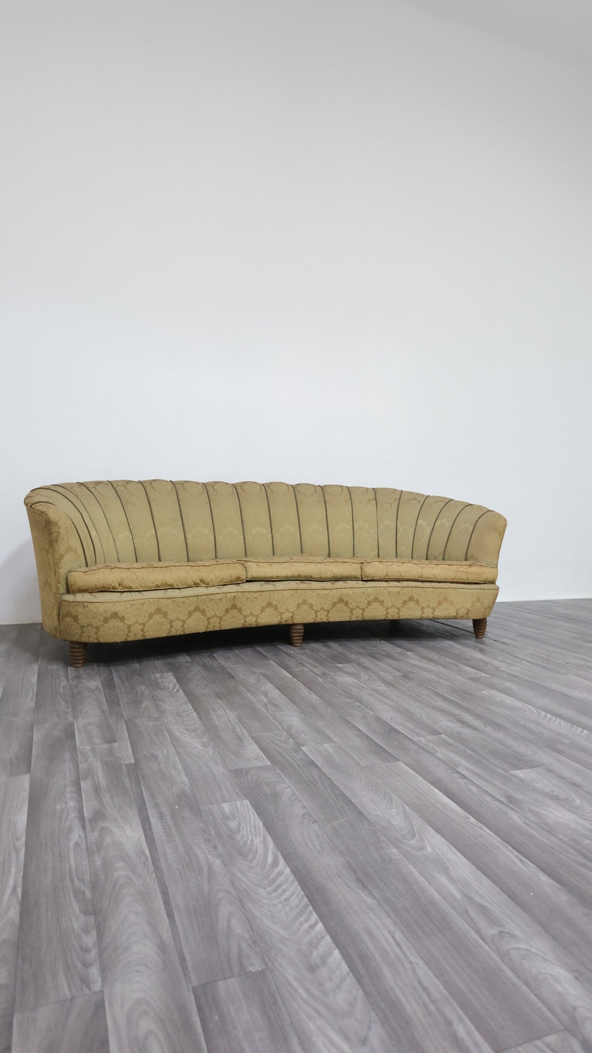 Elegante divano italiano degli anni ’50 attribuibile a Gio Ponti per Casa & Giardino. Il design si distingue per la linea sinuosa dello schienale a conchiglia, con lavorazione a canne verticali che valorizza la silhouette curva e armoniosa. Le gambe tornite in legno massello, dal profilo scultoreo, completano la struttura conferendole solidità e carattere.
