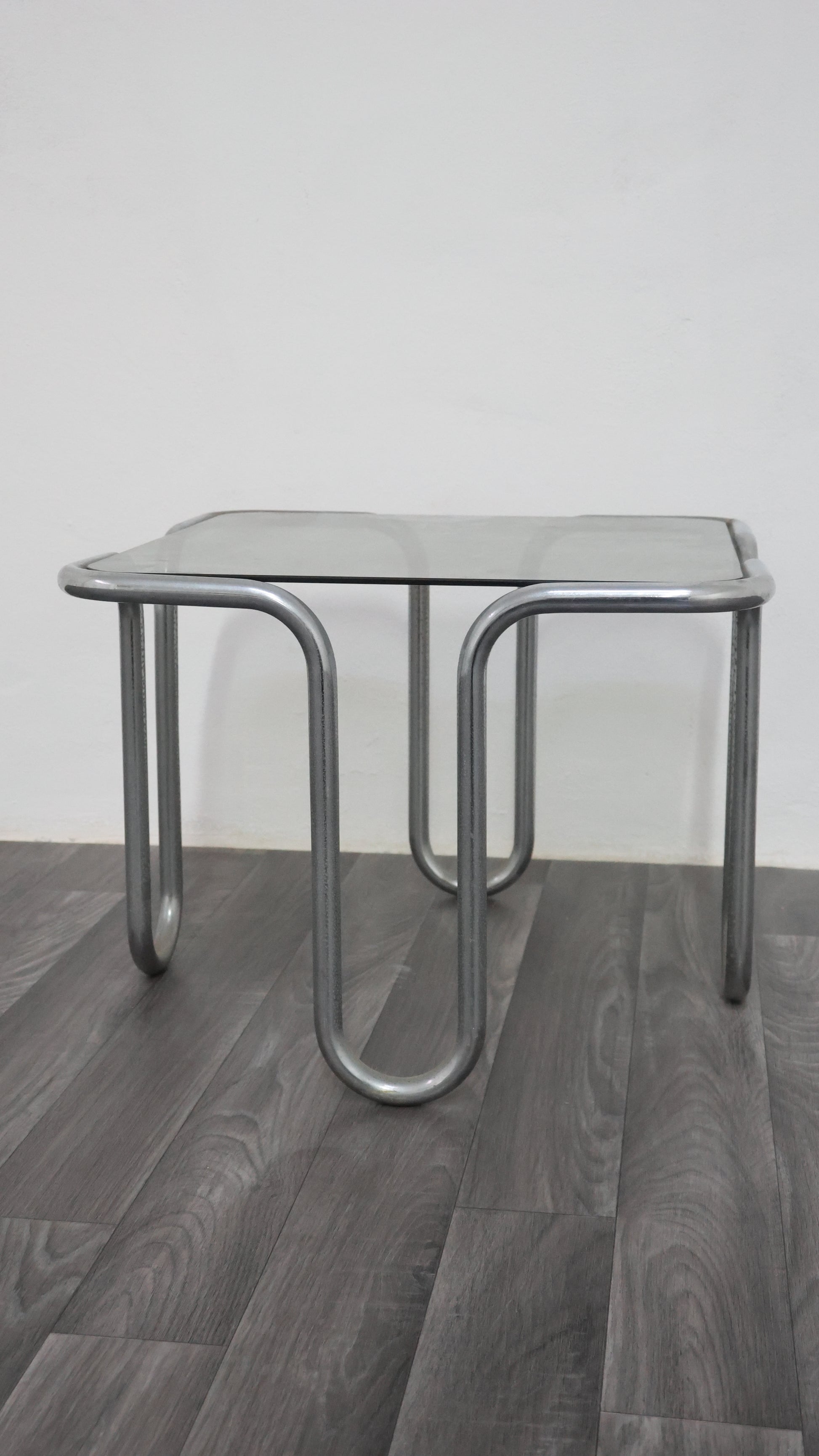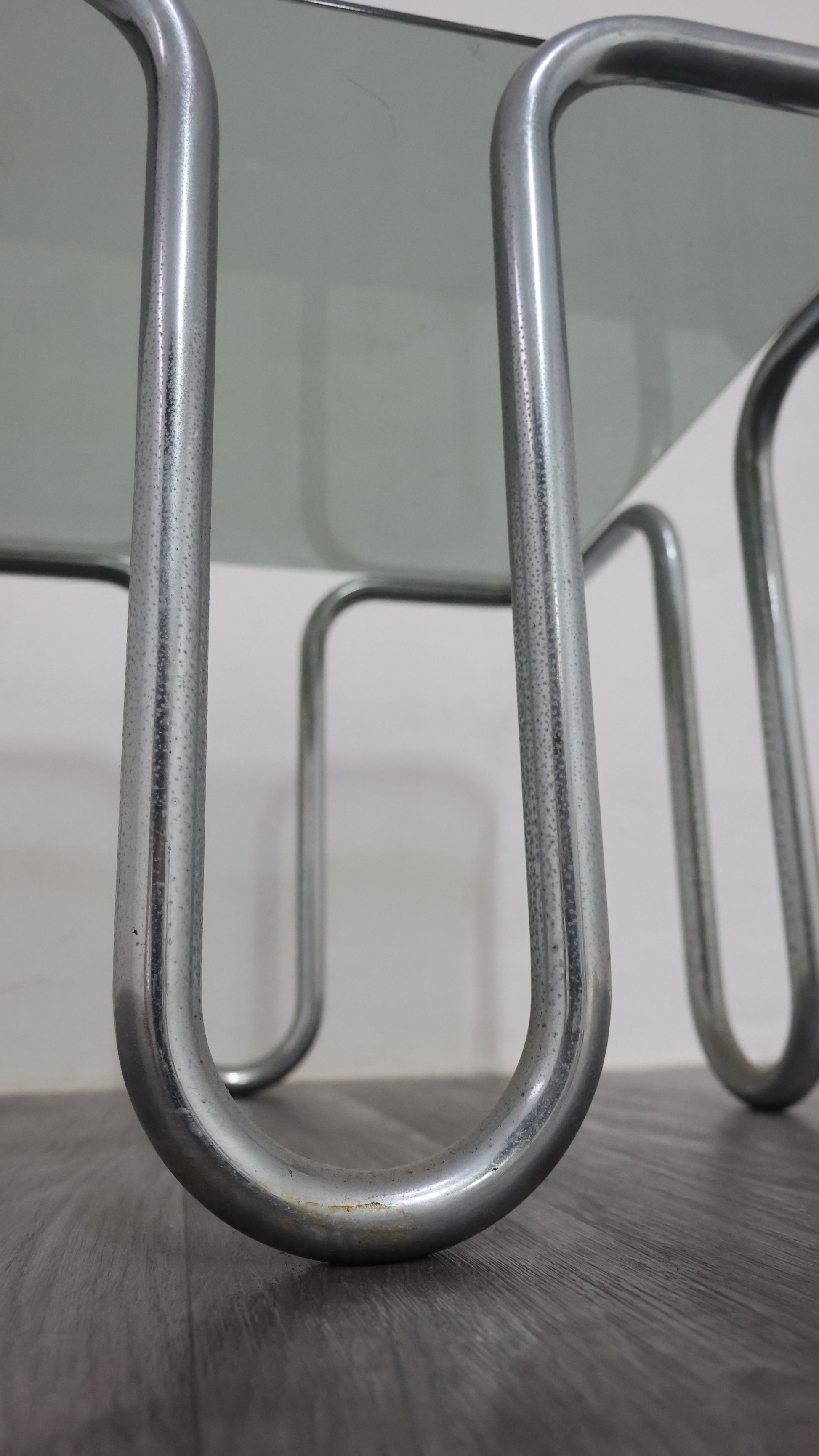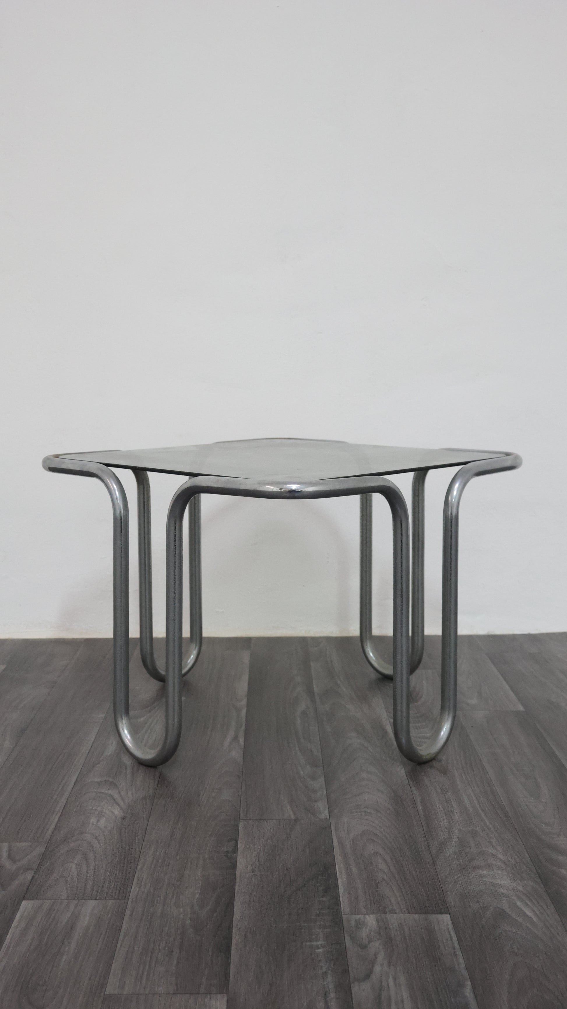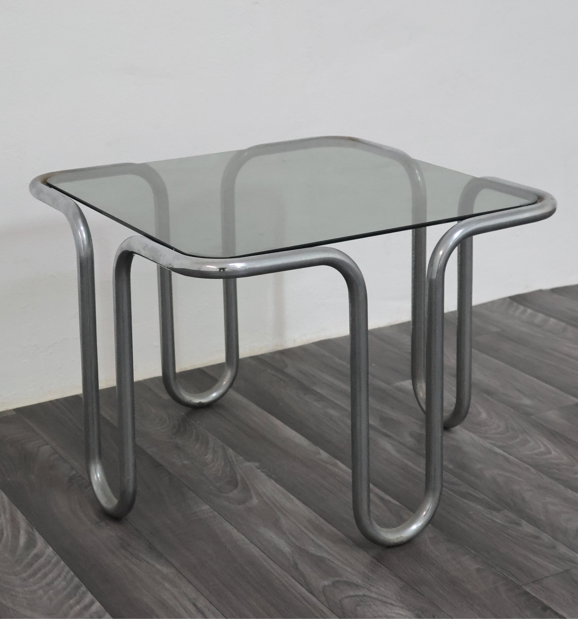 Meraviglioso tavolino da caffè interamente in acciaio cromato tubolare, con piano in cristallo fumé.