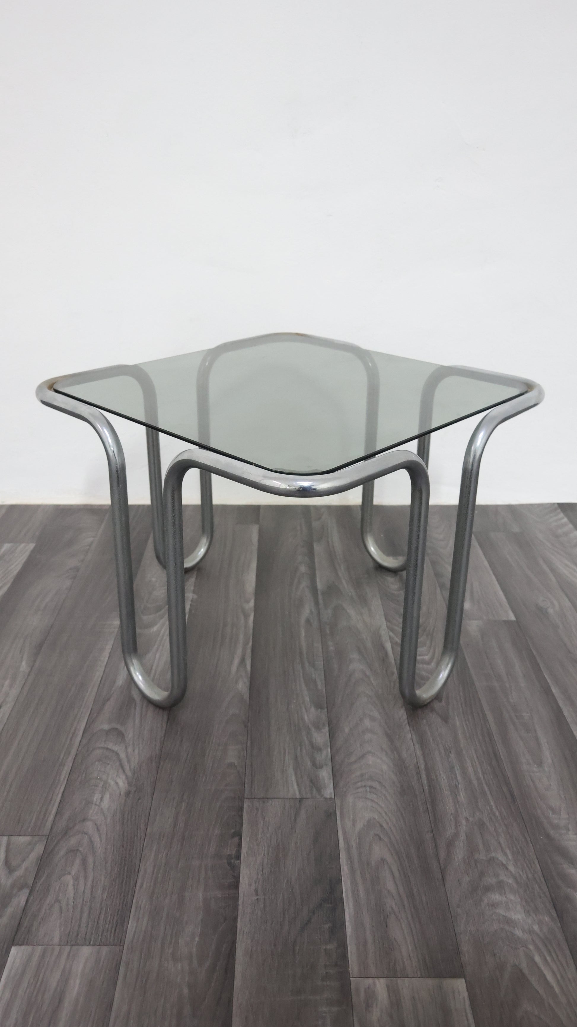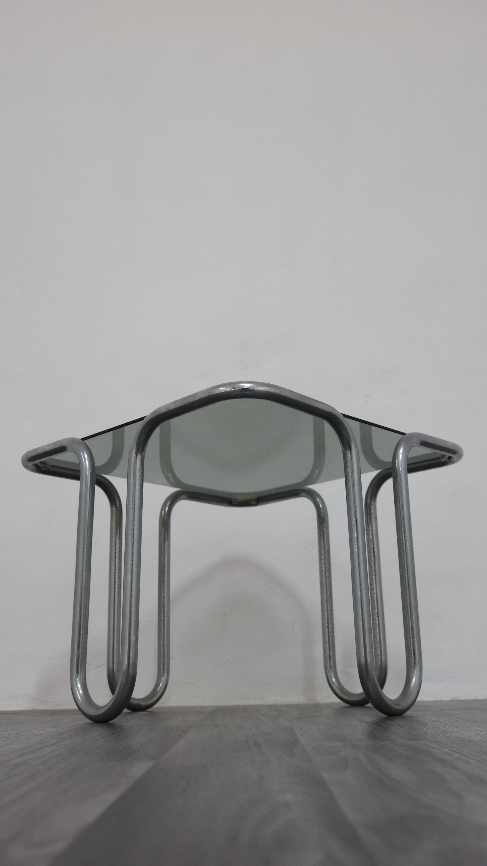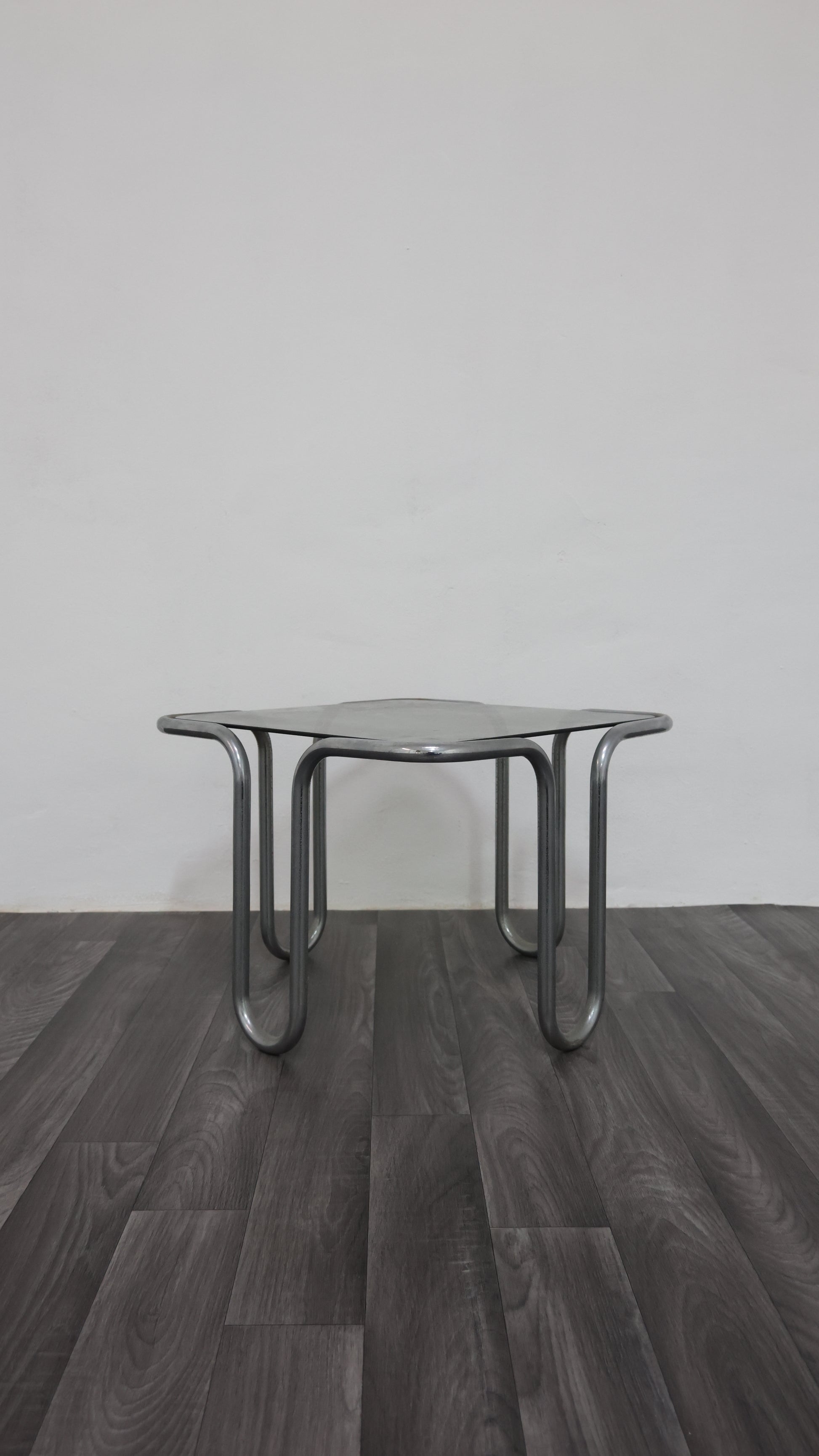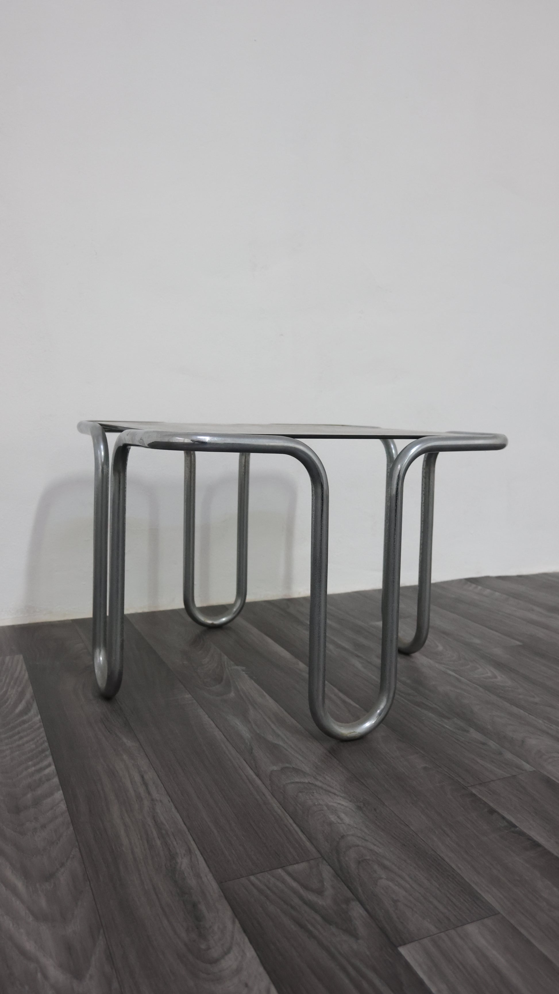 Meraviglioso tavolino da caffè interamente in acciaio cromato tubolare, con piano in cristallo fumé.