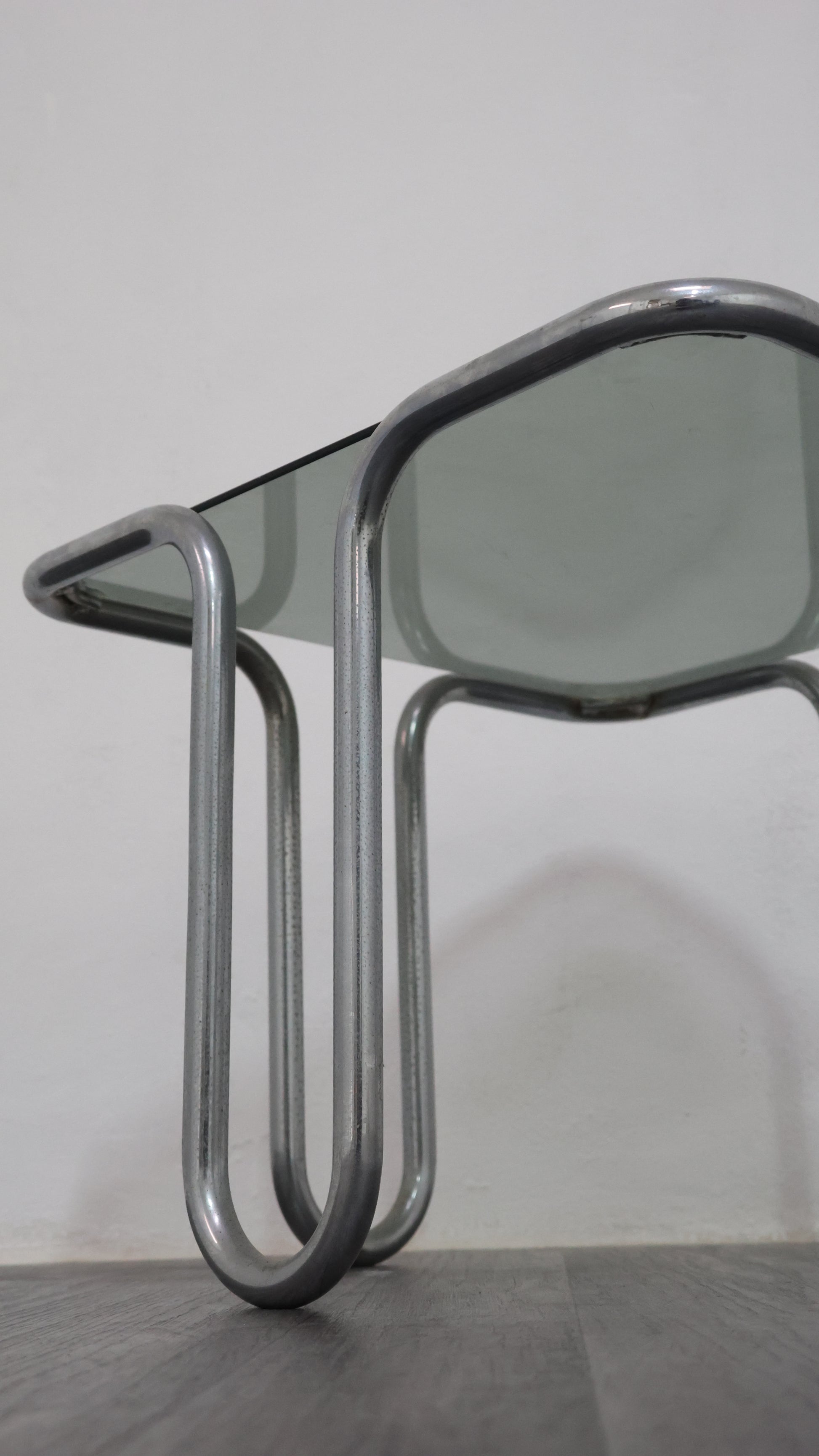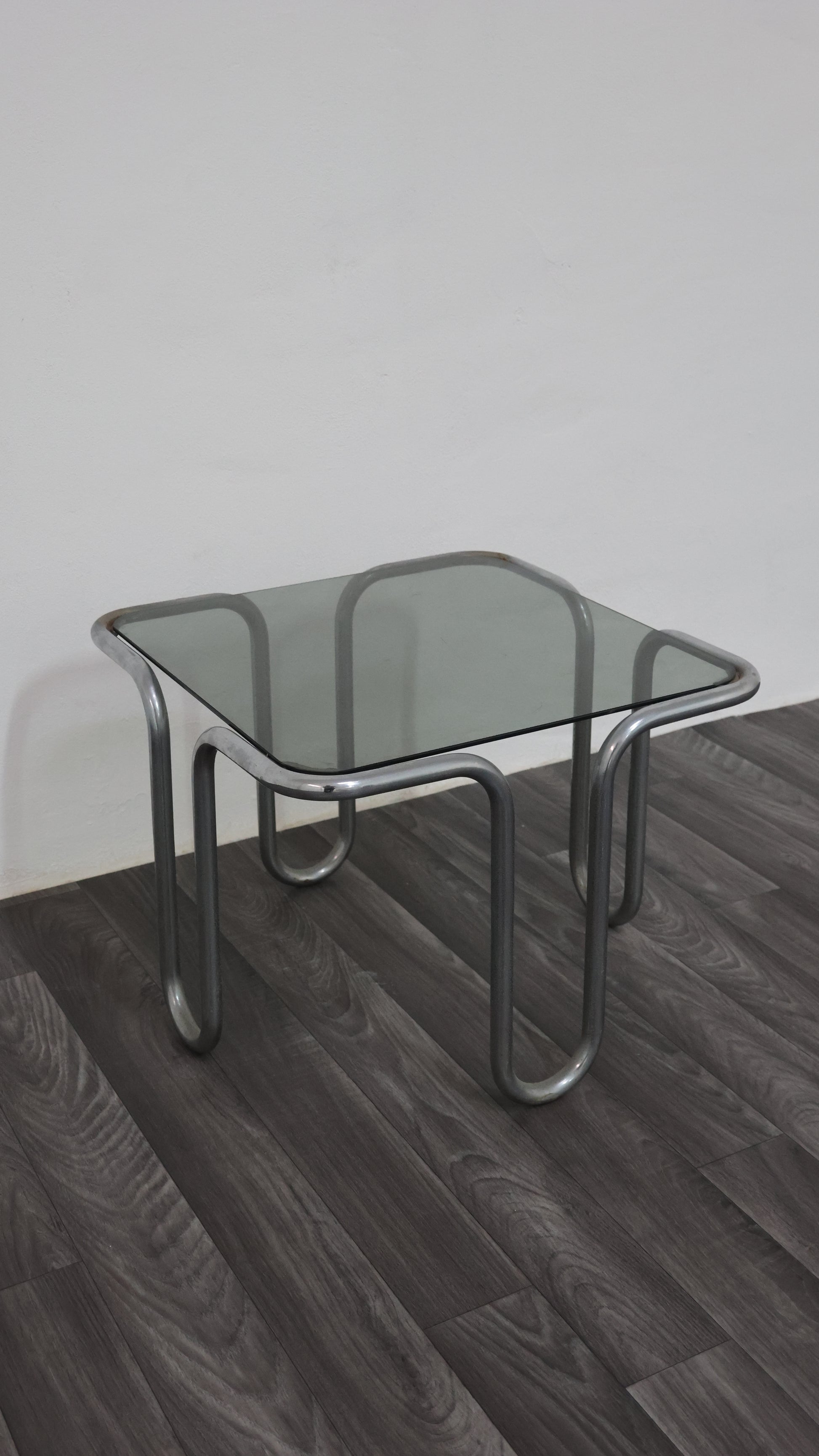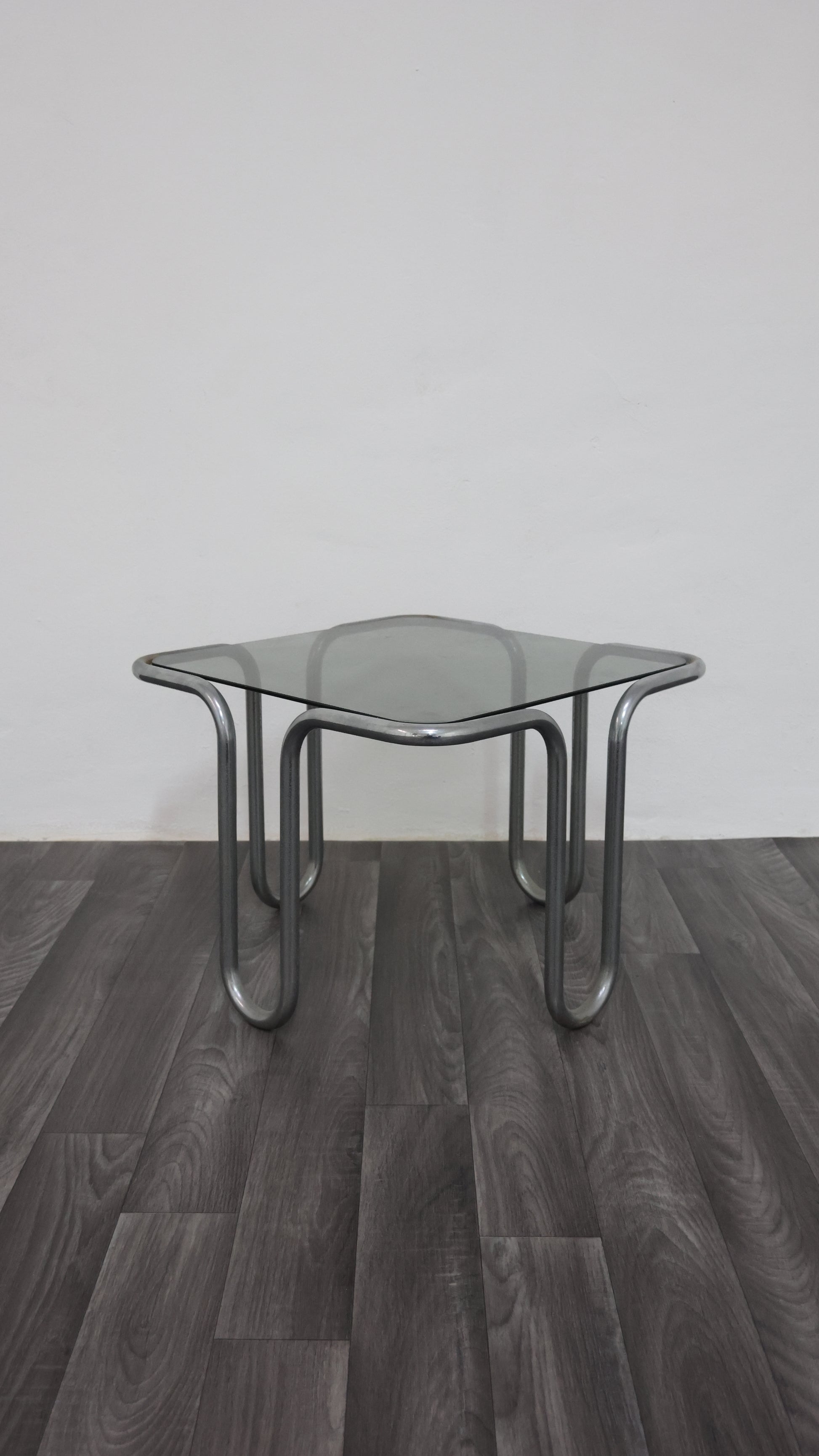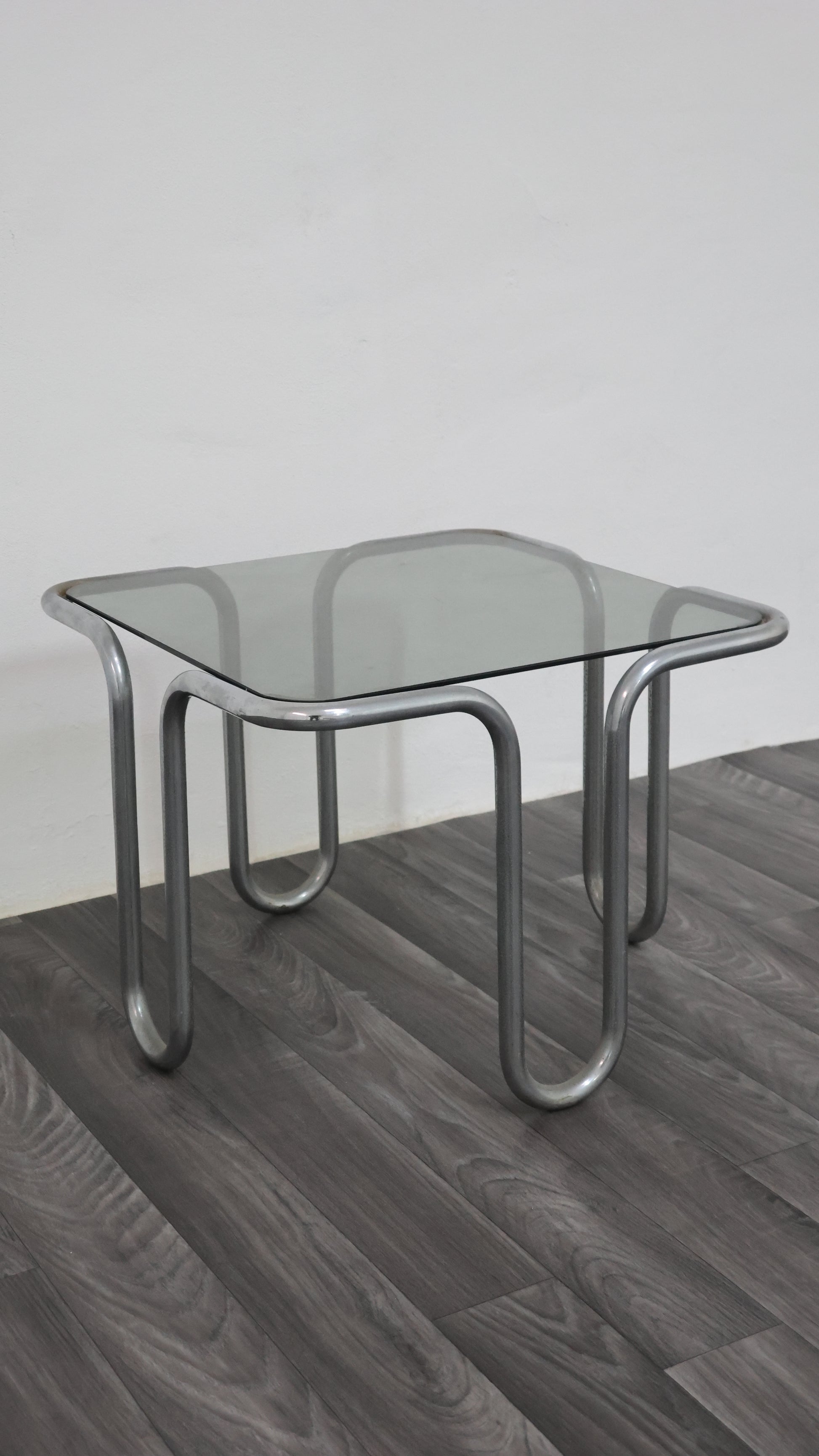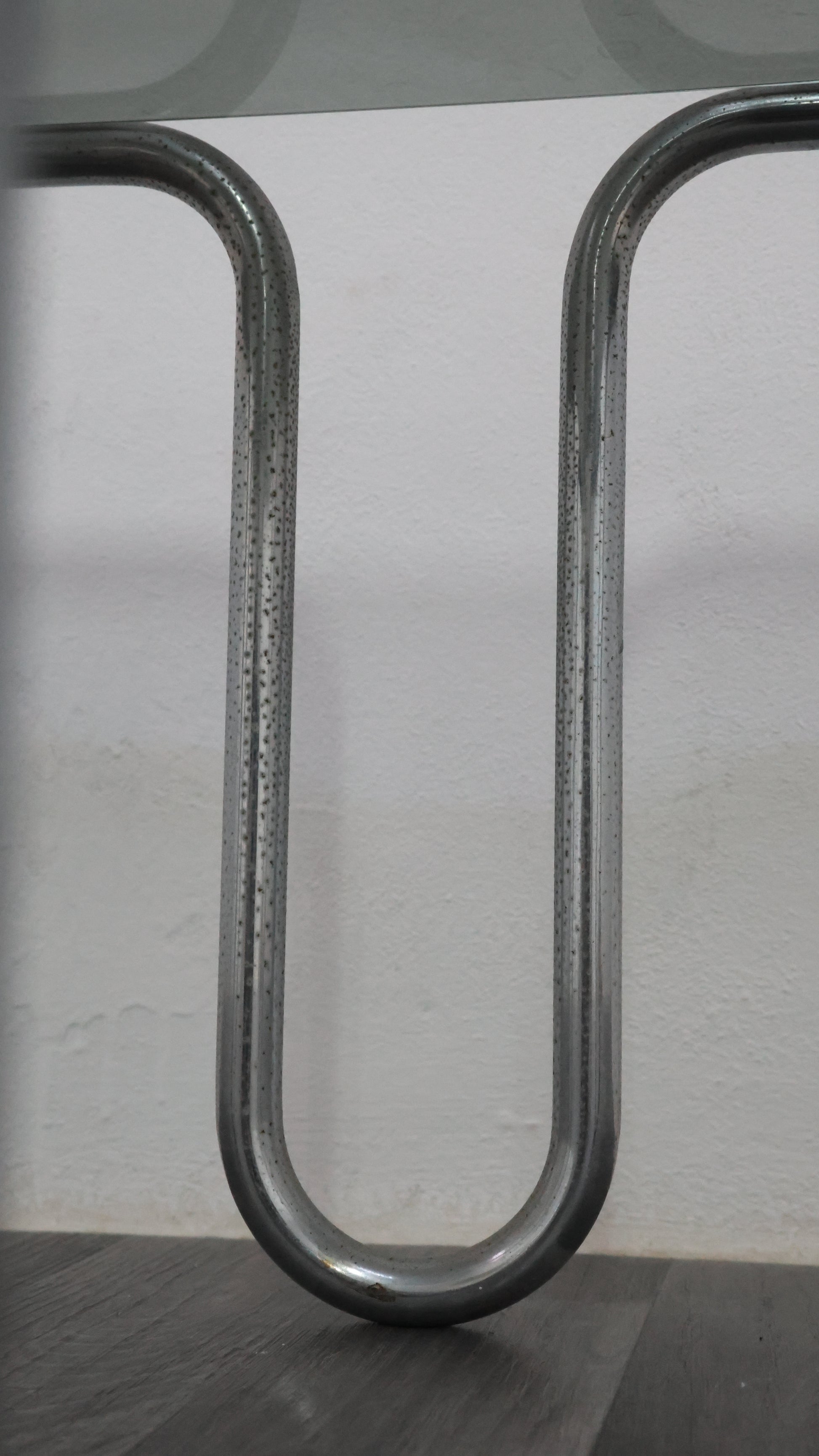 Meraviglioso tavolino da caffè interamente in acciaio cromato tubolare, con piano in cristallo fumé.