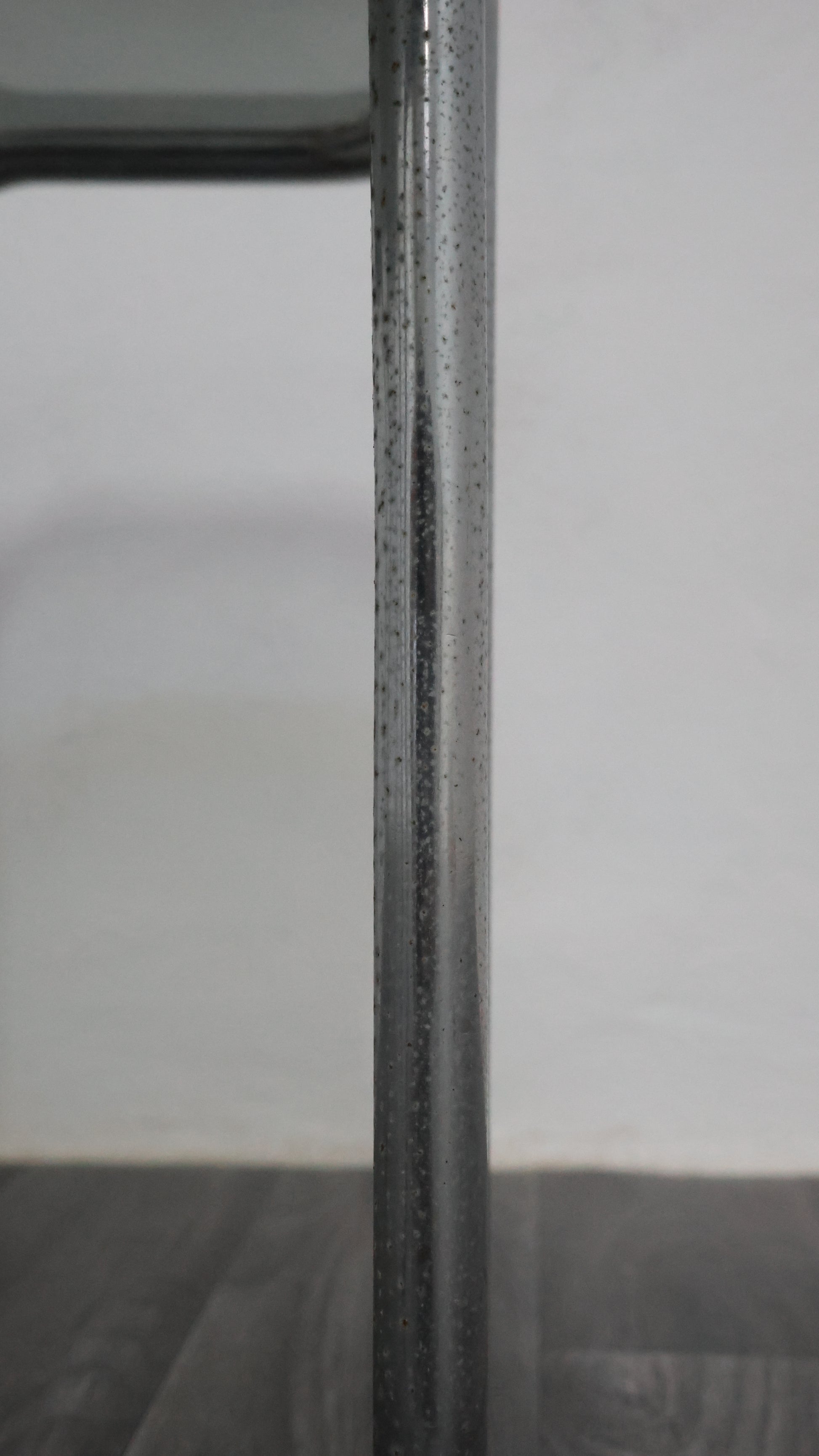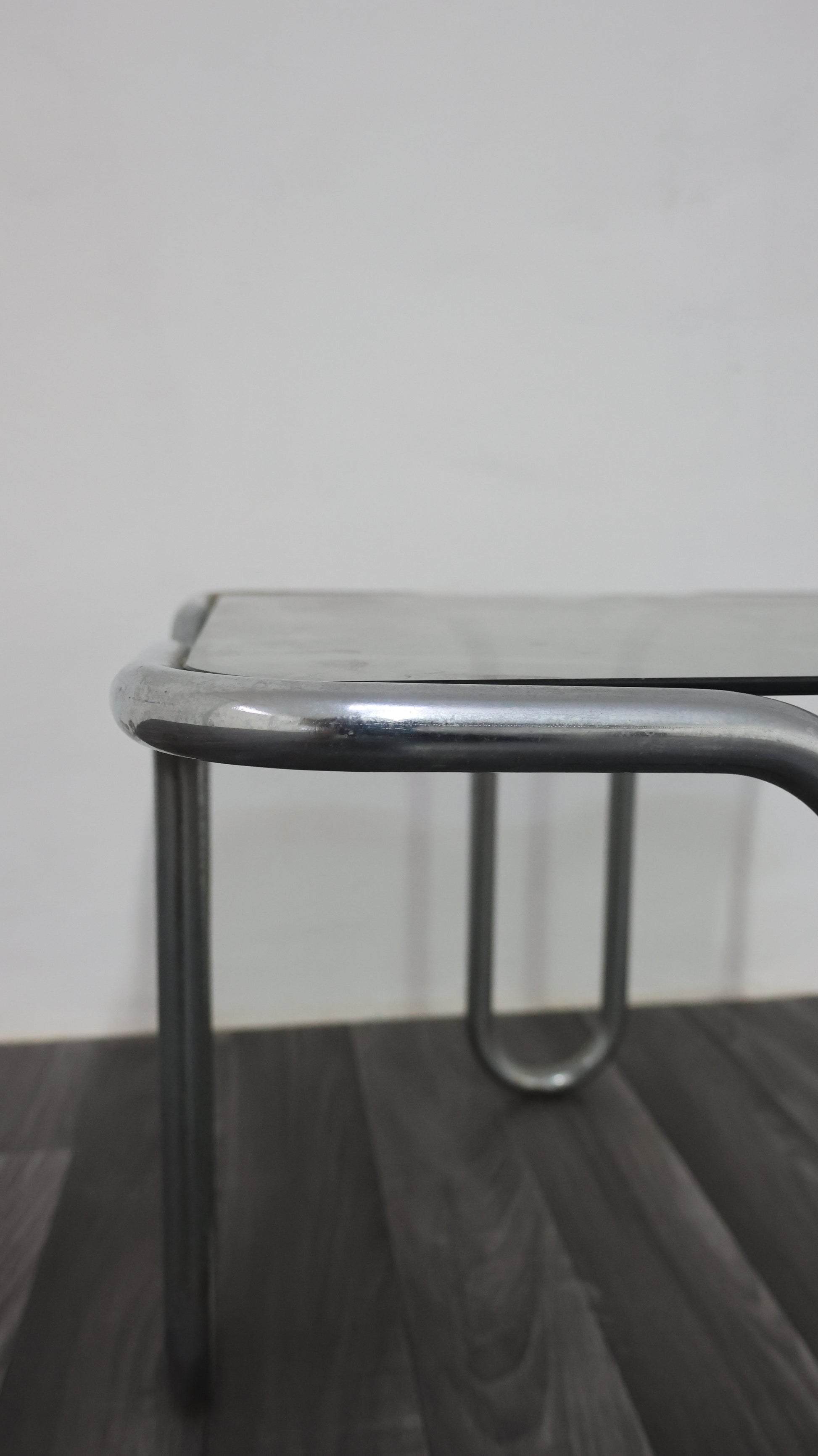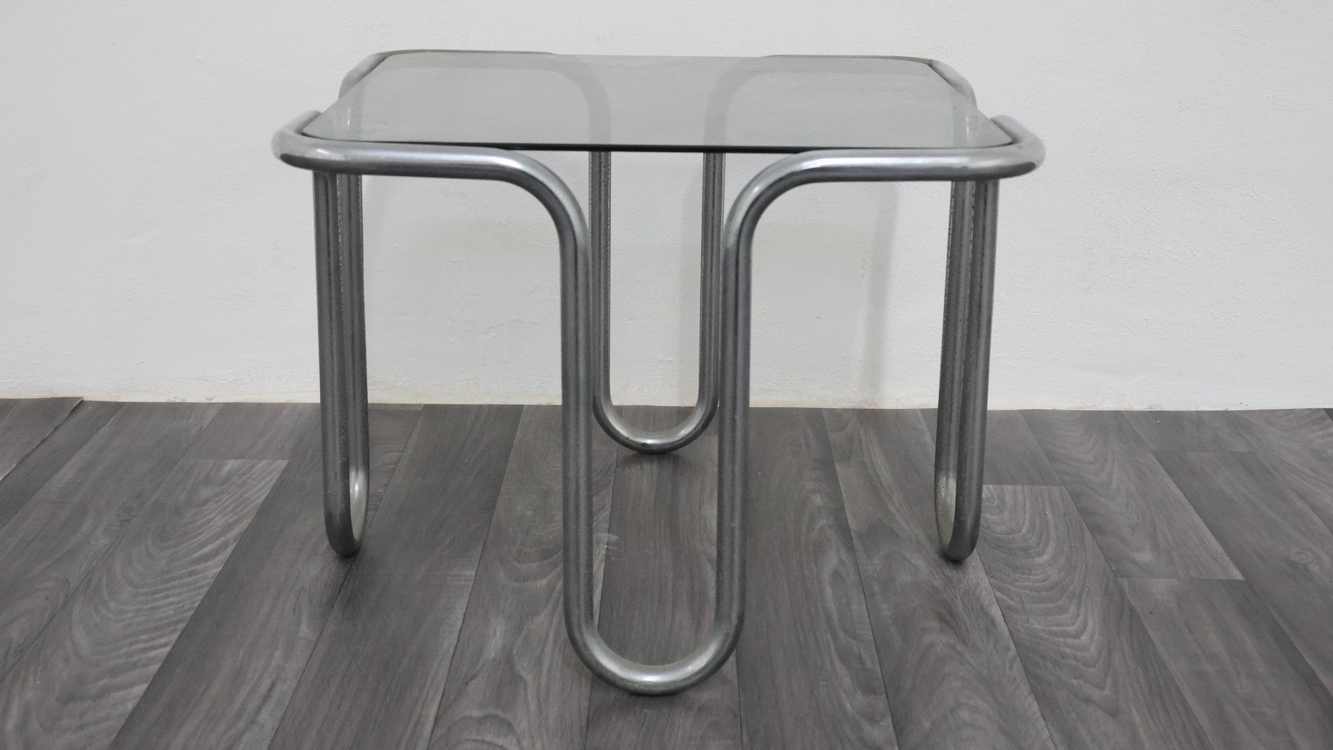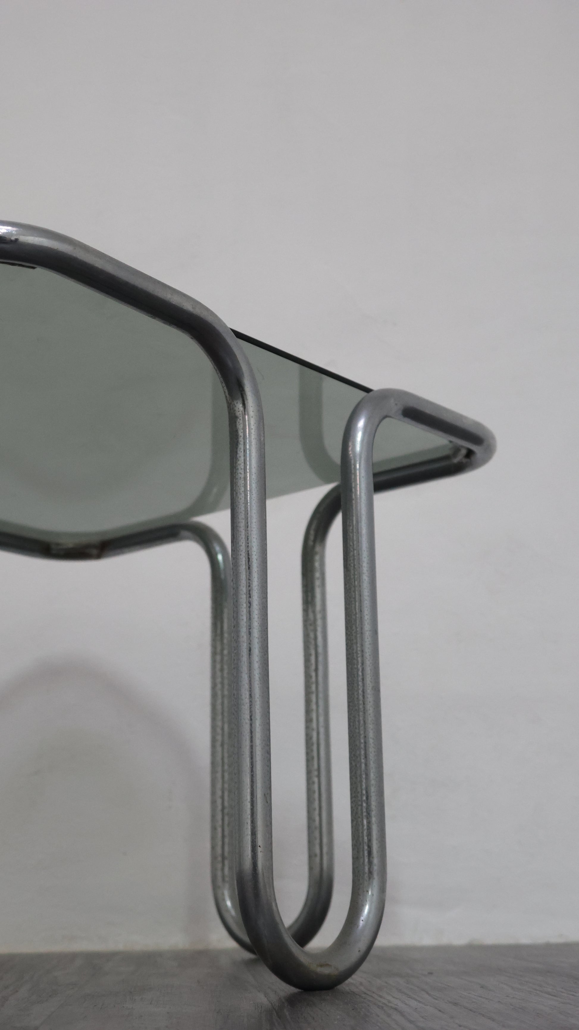 Meraviglioso tavolino da caffè interamente in acciaio cromato tubolare, con piano in cristallo fumé.