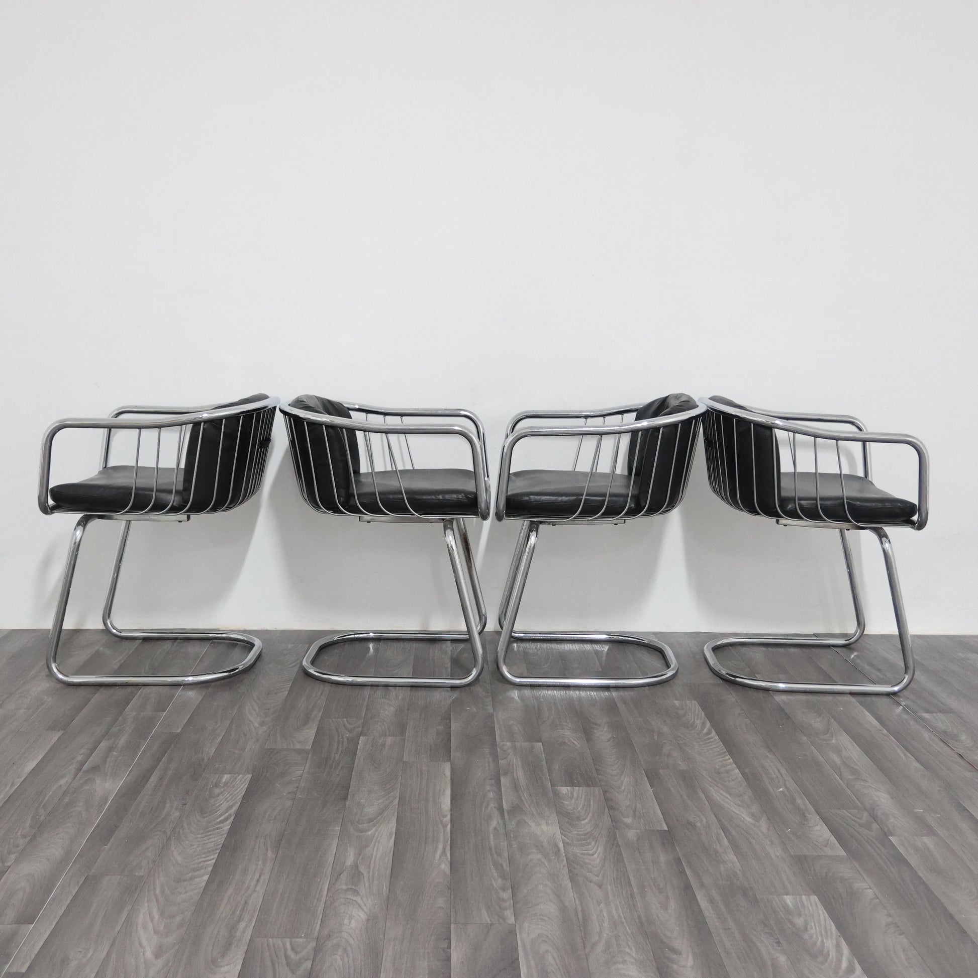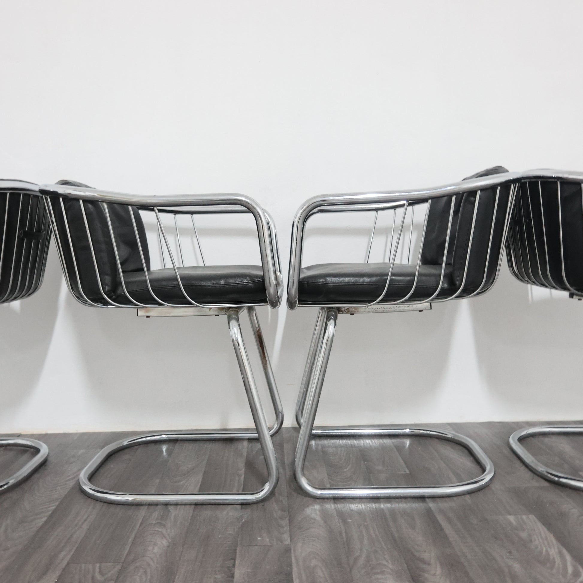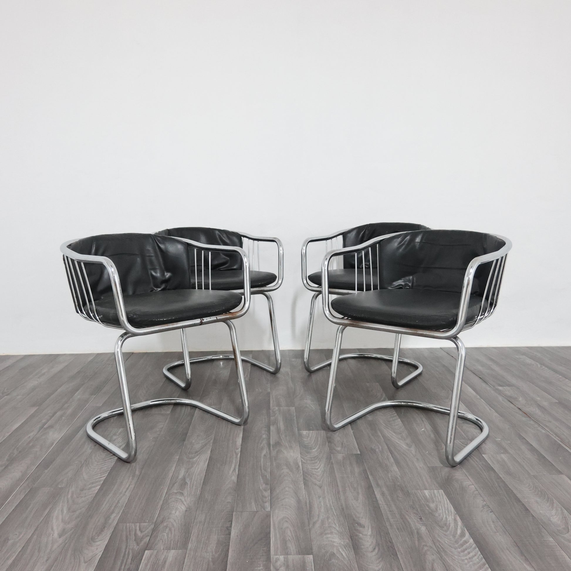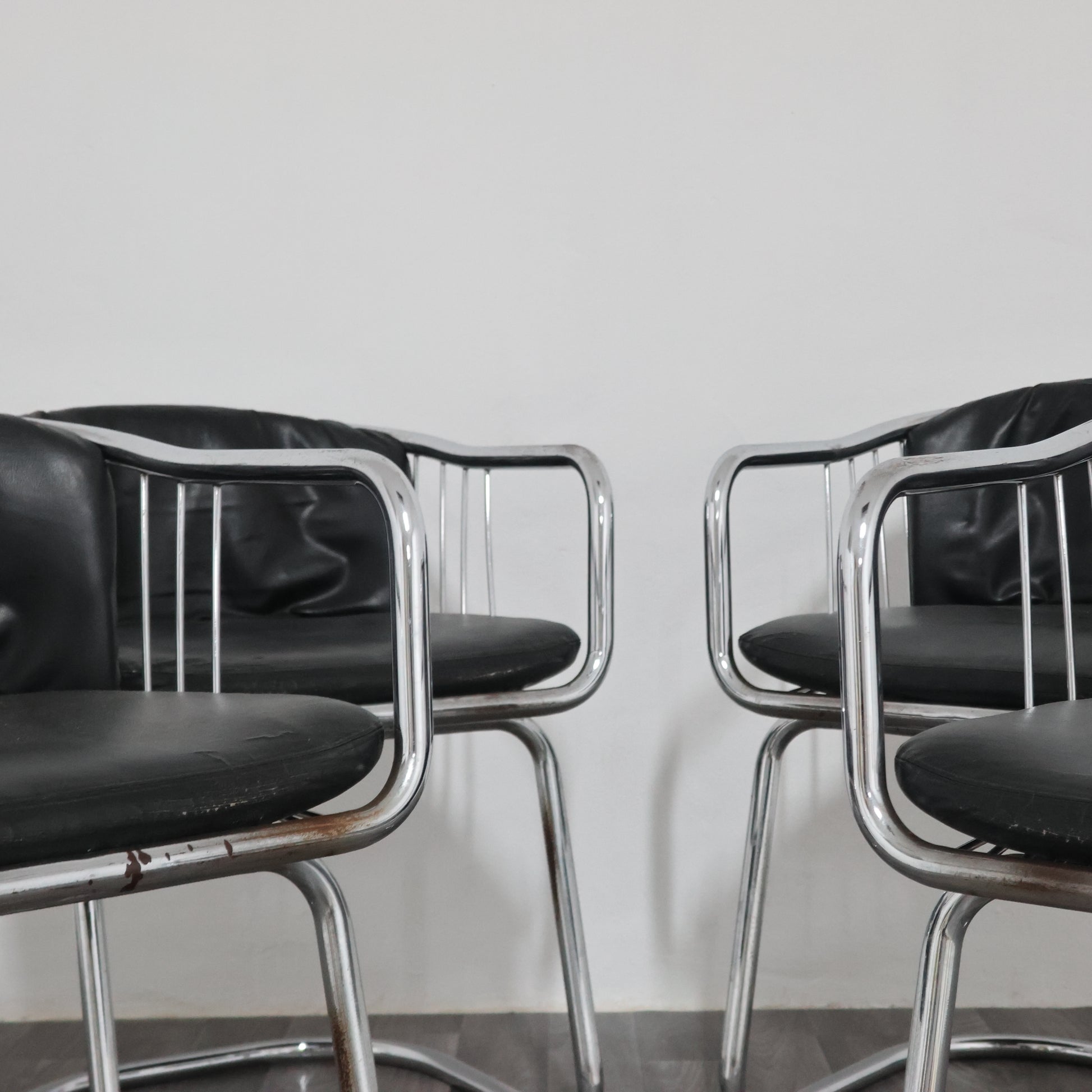 Elegante set di quattro poltroncine disegnate da Gastone Rinaldi negli anni ’70, esempio iconico del modernariato italiano. La struttura è realizzata in tubolare d’acciaio cromato, dalle linee fluide e dinamiche, con un design che unisce leggerezza e solidità.