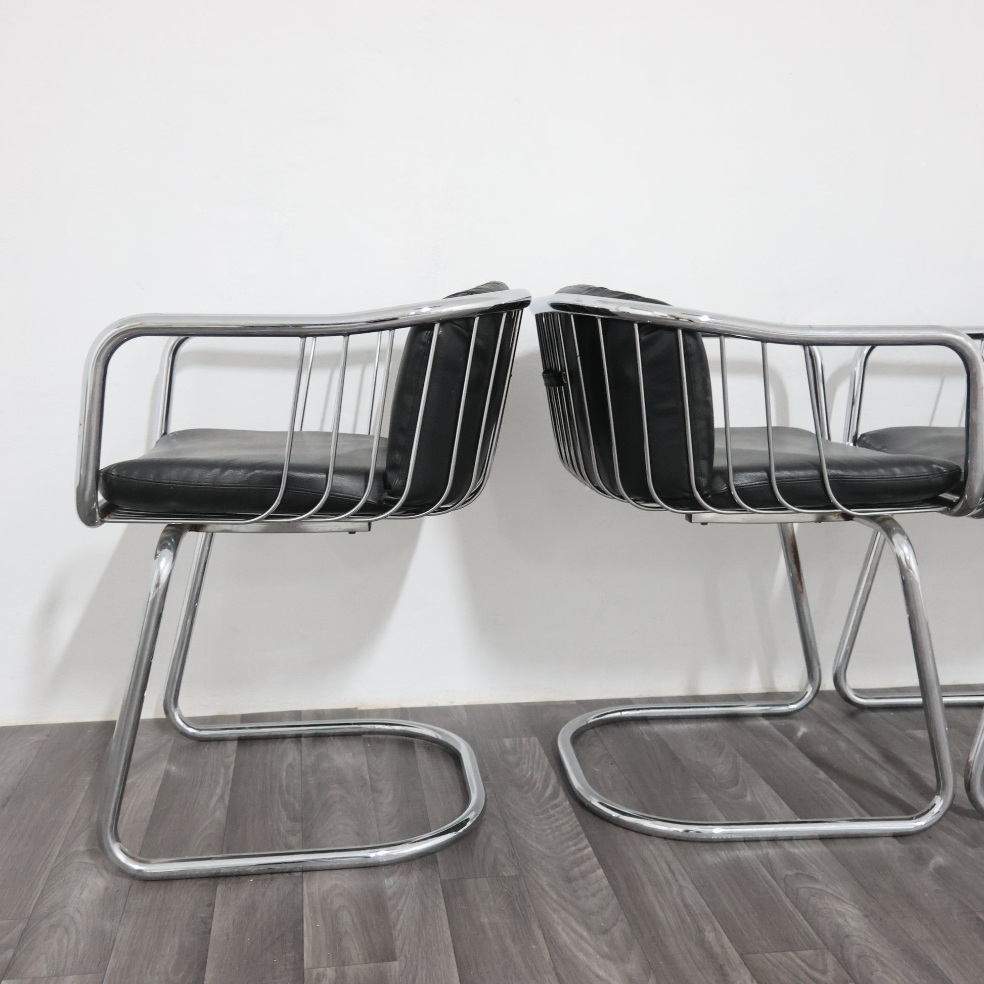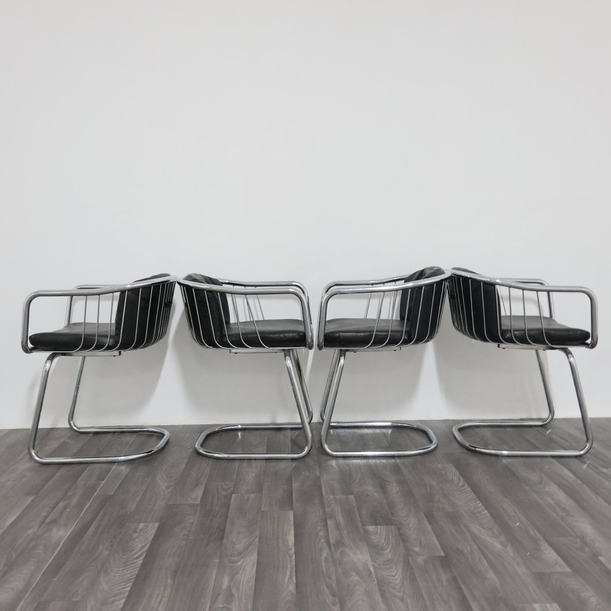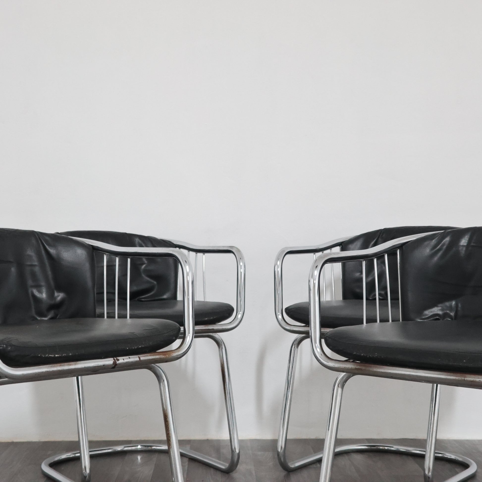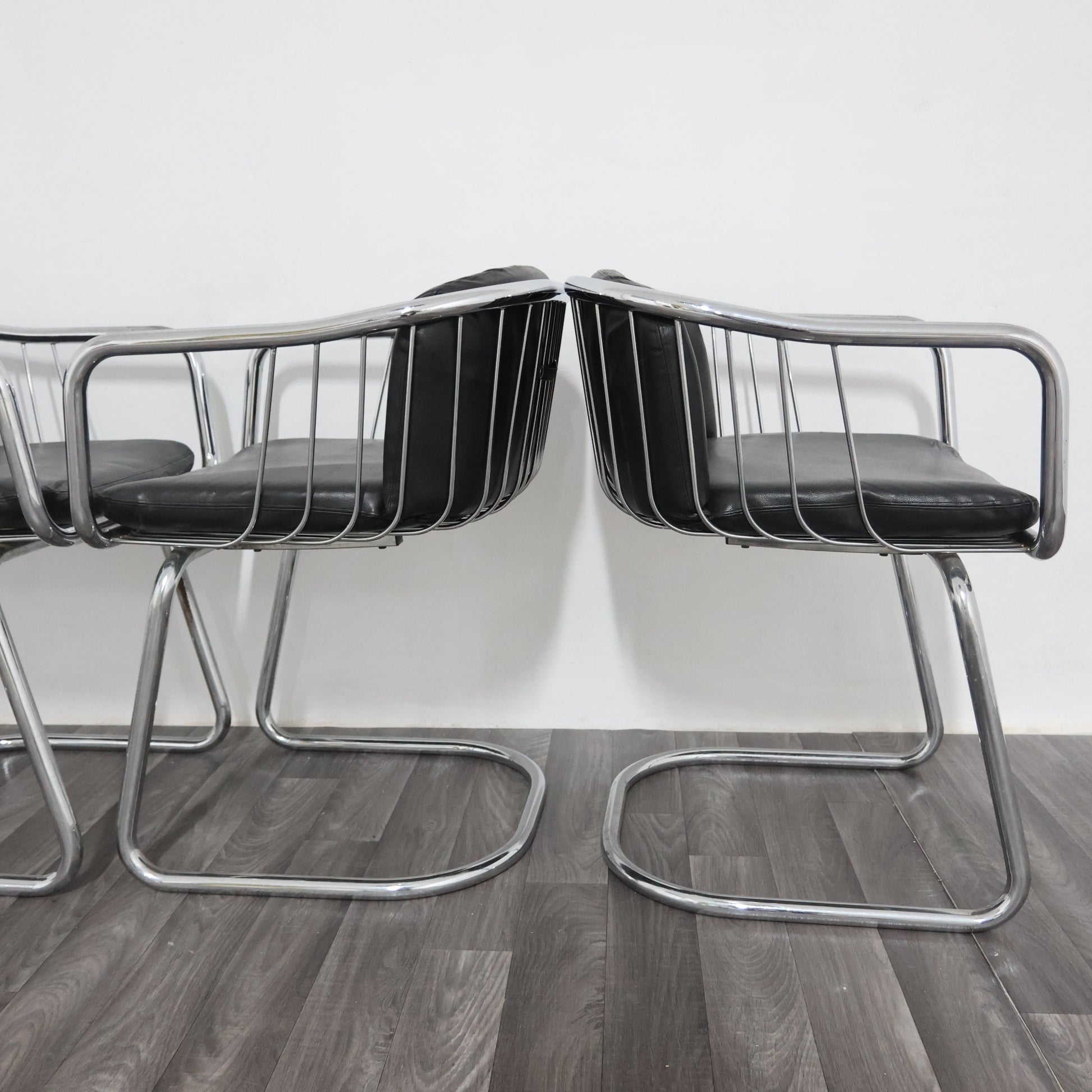 Elegante set di quattro poltroncine disegnate da Gastone Rinaldi negli anni ’70, esempio iconico del modernariato italiano. La struttura è realizzata in tubolare d’acciaio cromato, dalle linee fluide e dinamiche, con un design che unisce leggerezza e solidità.