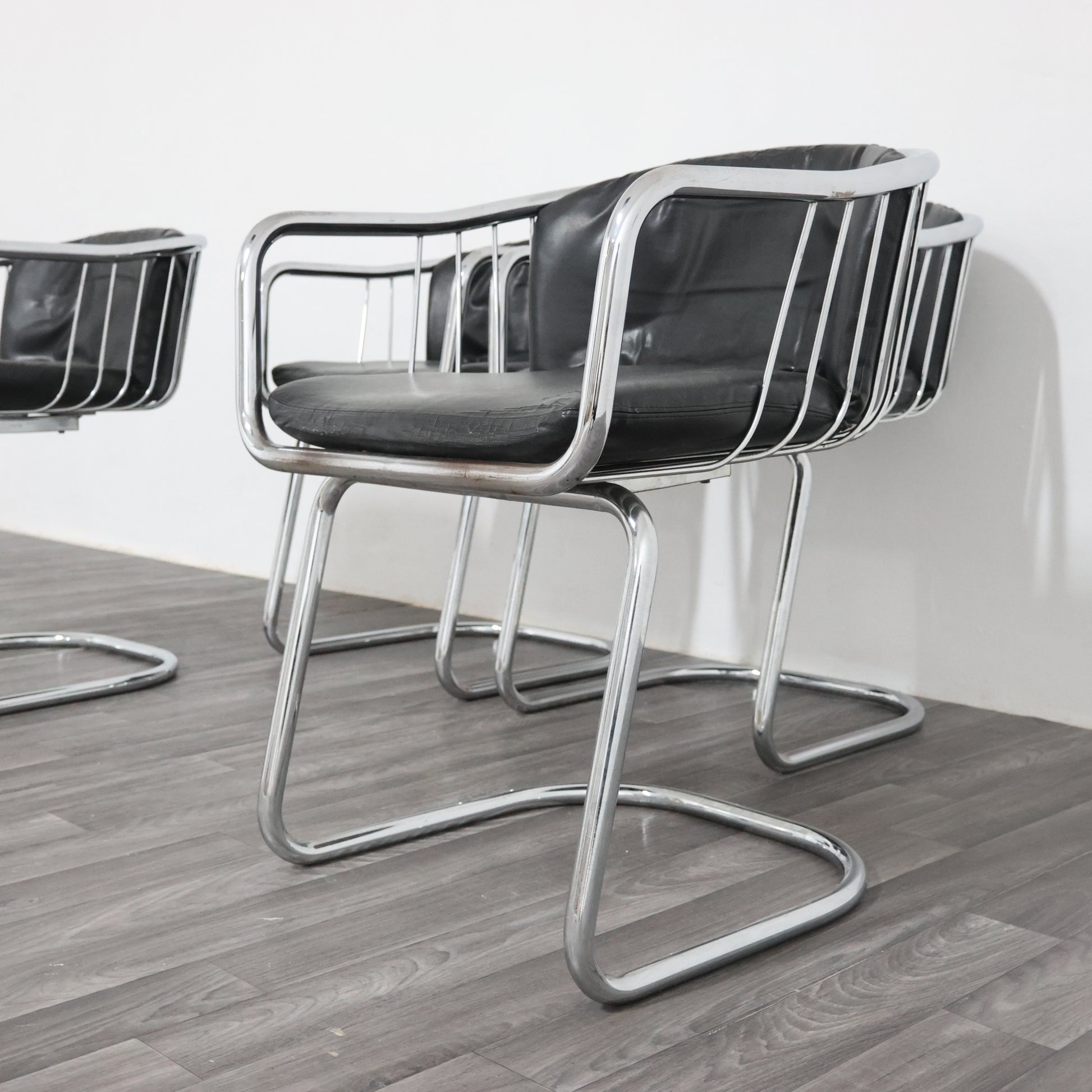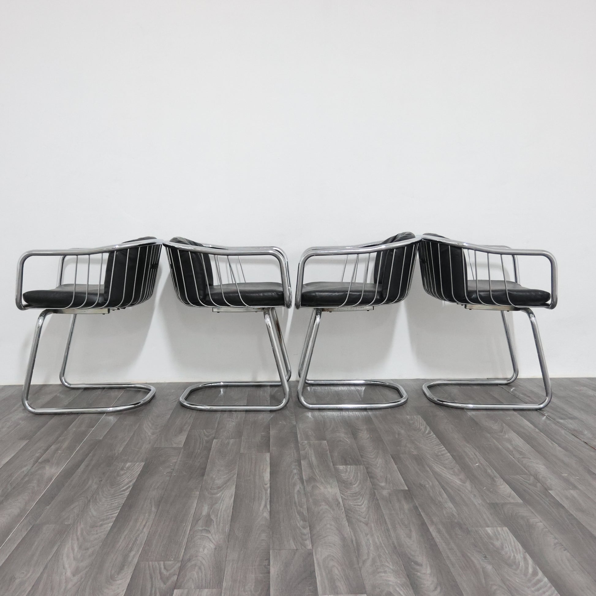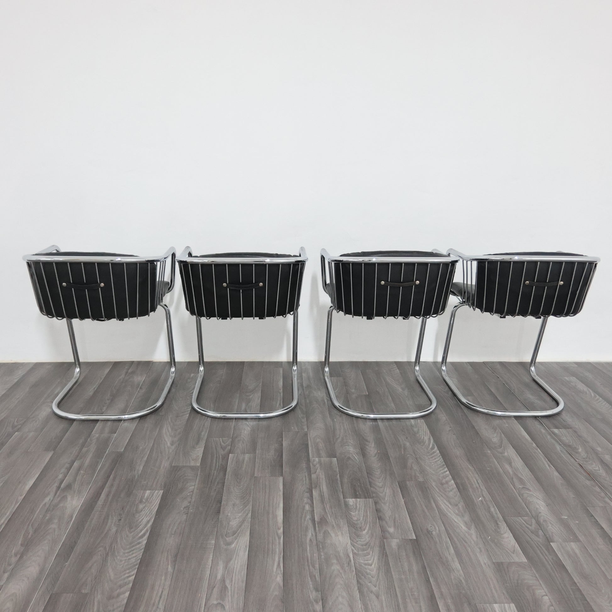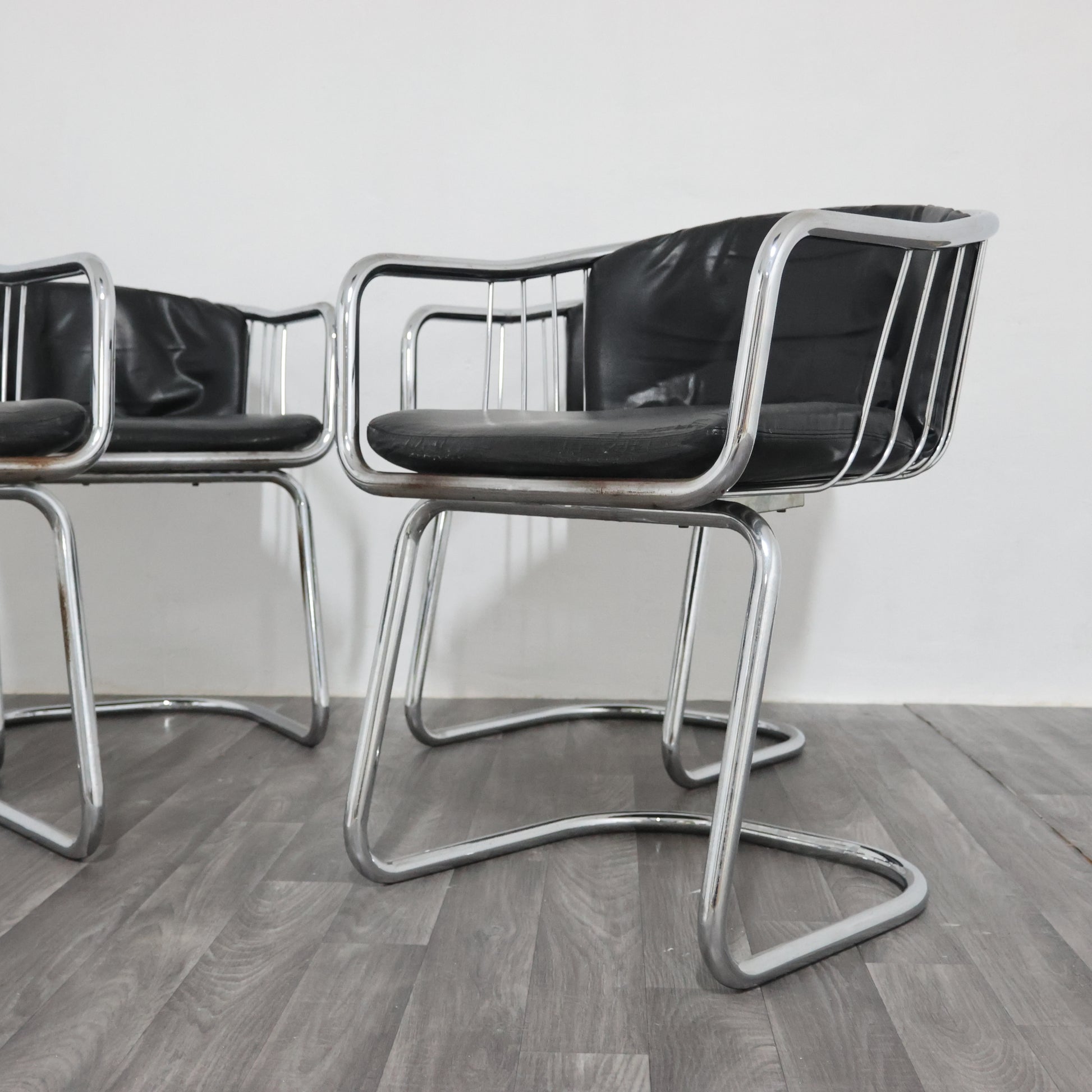 Elegante set di quattro poltroncine disegnate da Gastone Rinaldi negli anni ’70, esempio iconico del modernariato italiano. La struttura è realizzata in tubolare d’acciaio cromato, dalle linee fluide e dinamiche, con un design che unisce leggerezza e solidità.