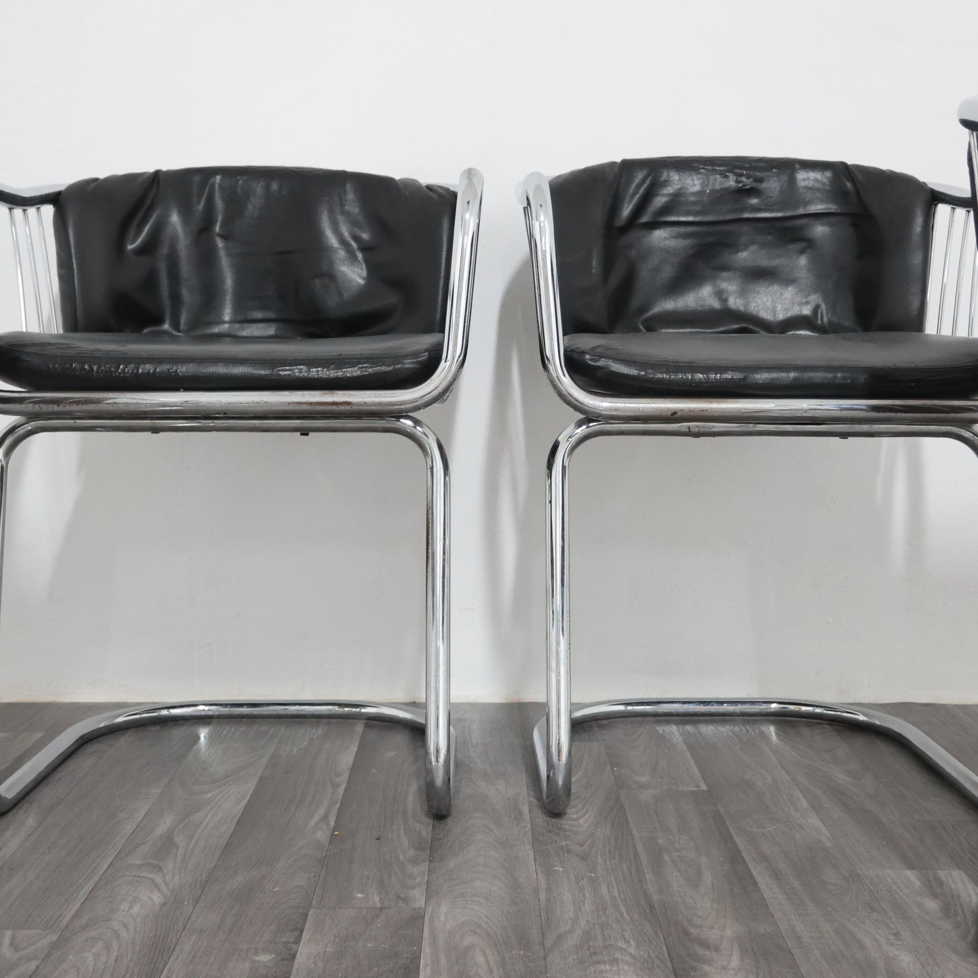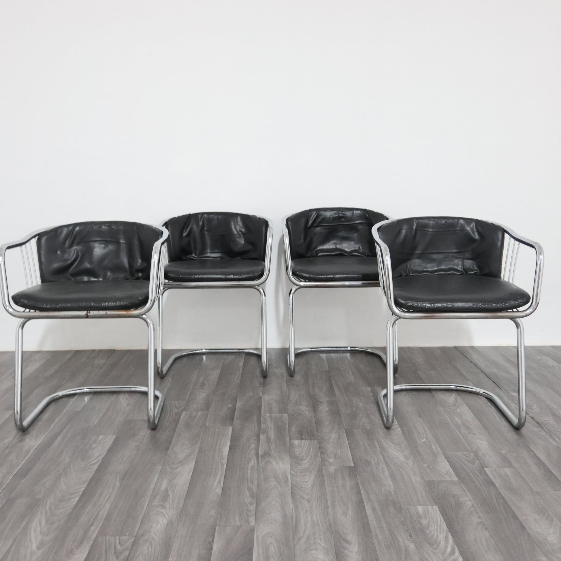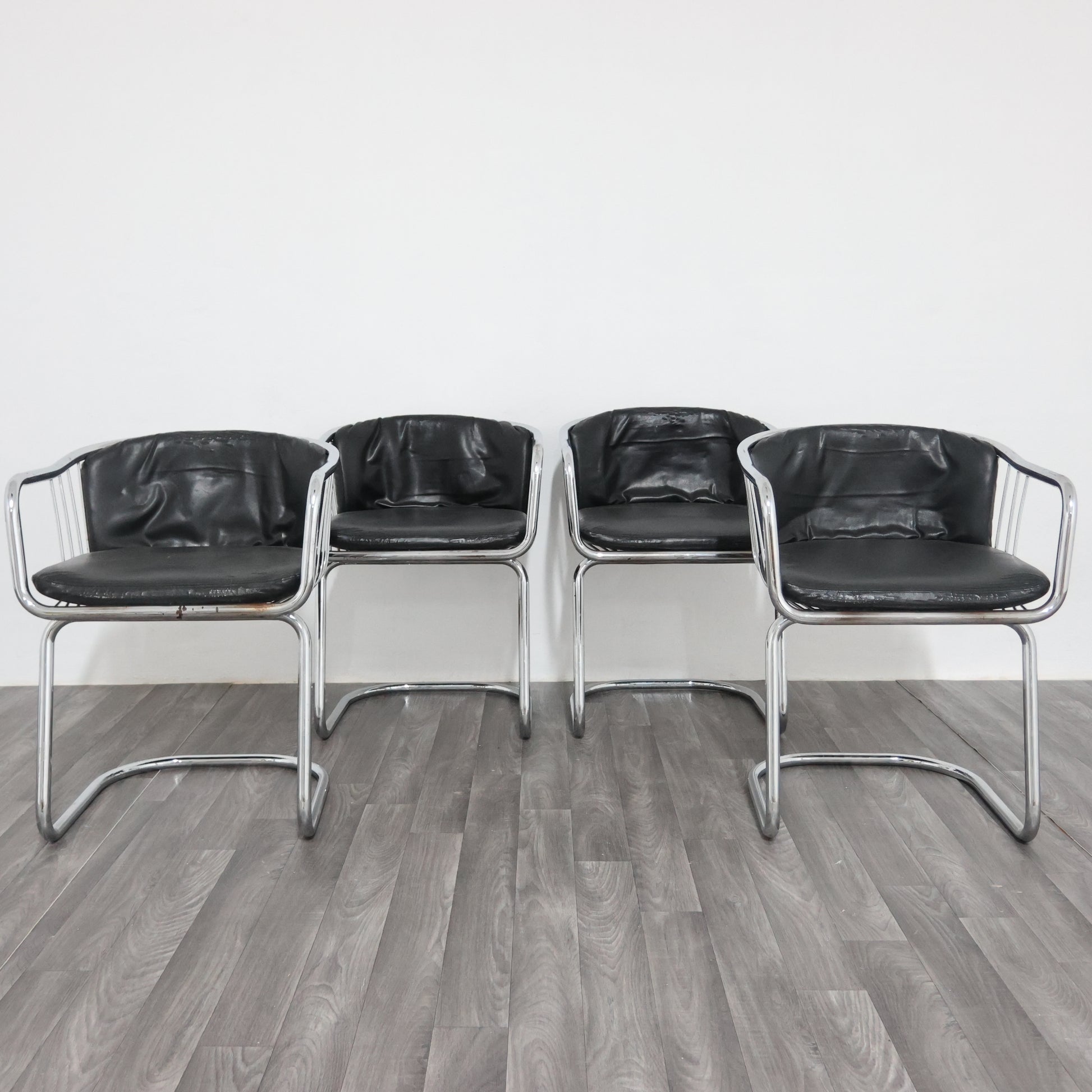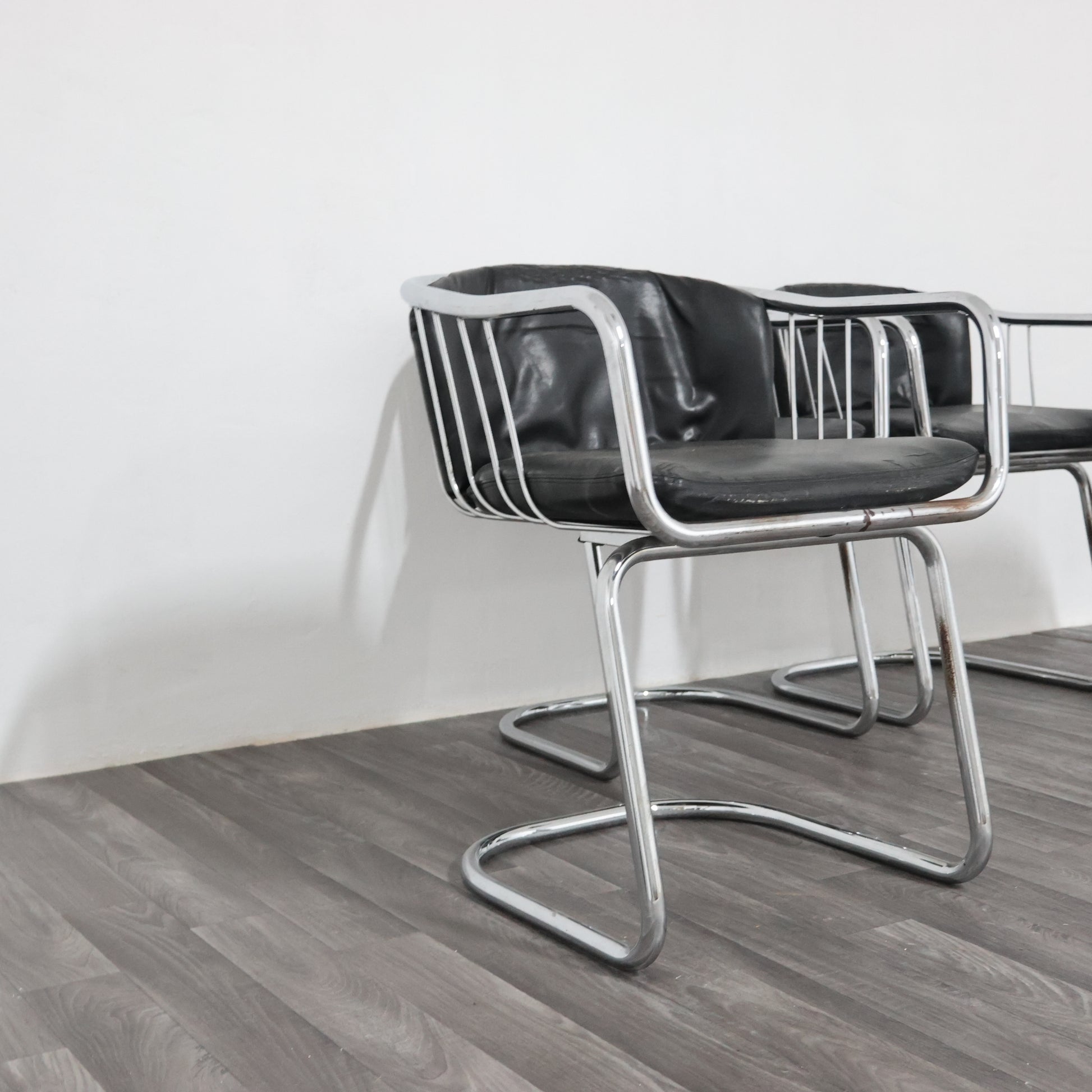 Elegante set di quattro poltroncine disegnate da Gastone Rinaldi negli anni ’70, esempio iconico del modernariato italiano. La struttura è realizzata in tubolare d’acciaio cromato, dalle linee fluide e dinamiche, con un design che unisce leggerezza e solidità.