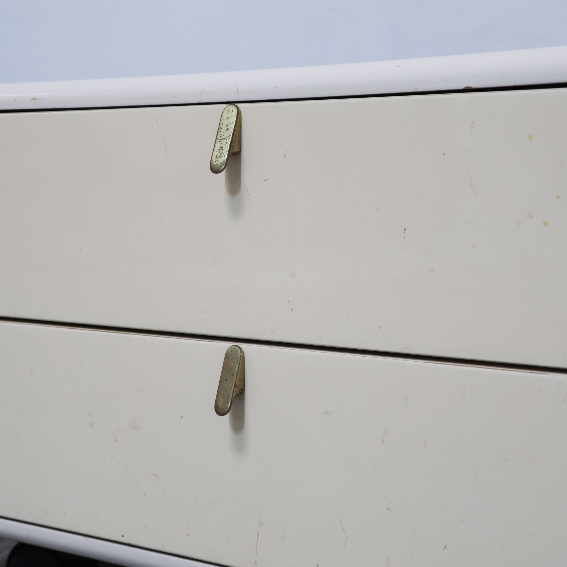 Questi comodini, realizzati in legno laccato color avorio, con maniglie e base in elegante ottone.
