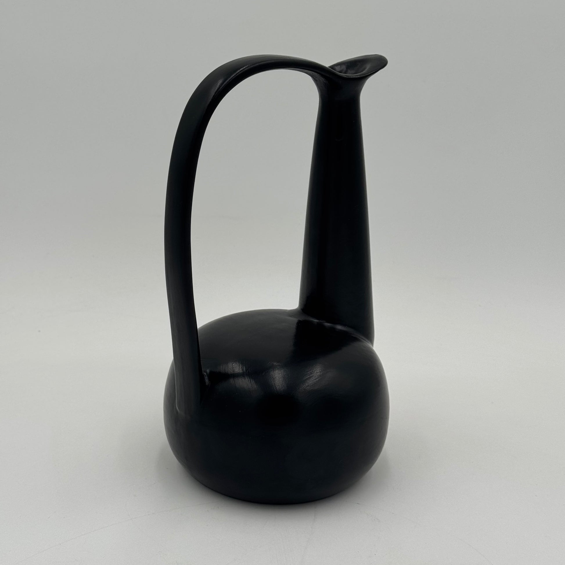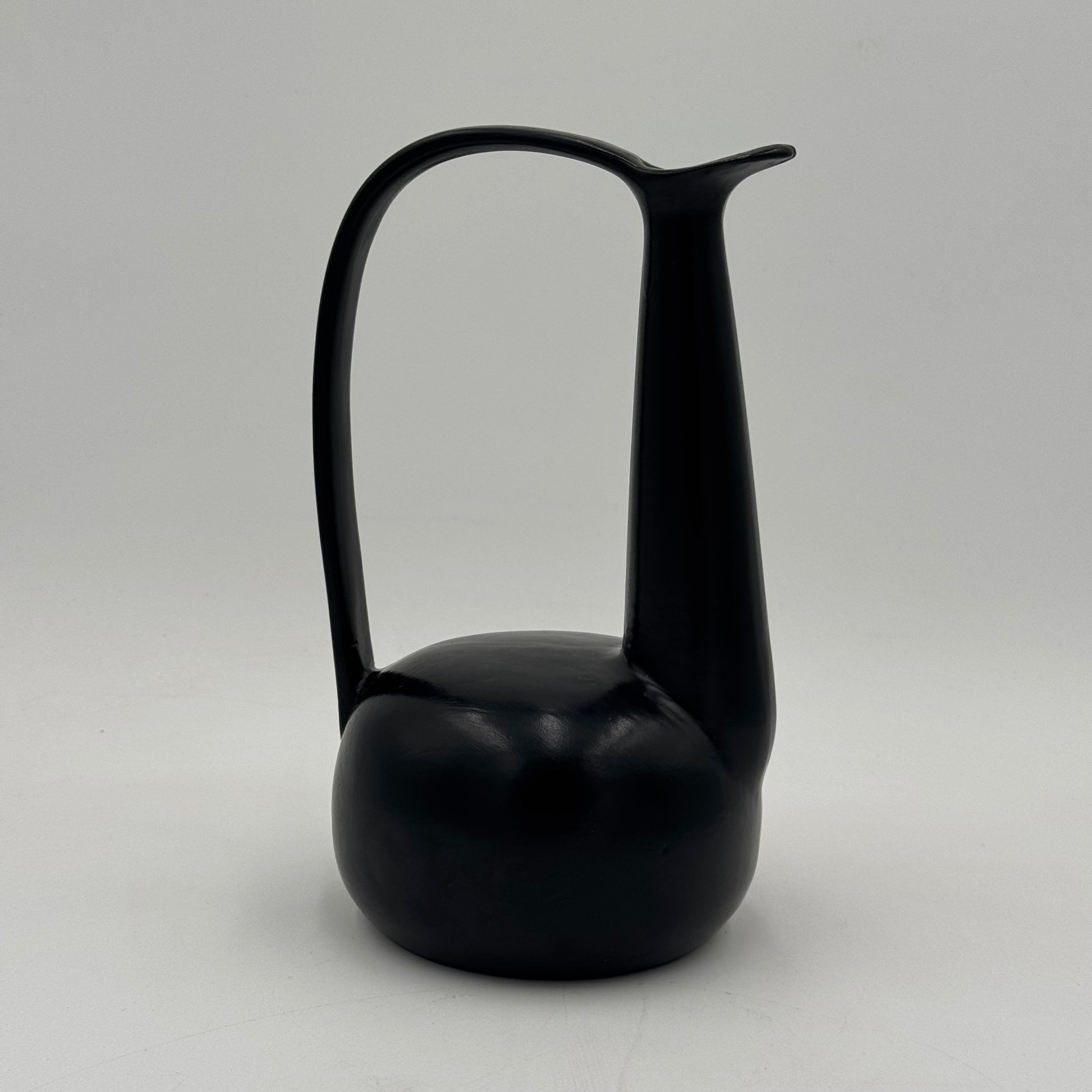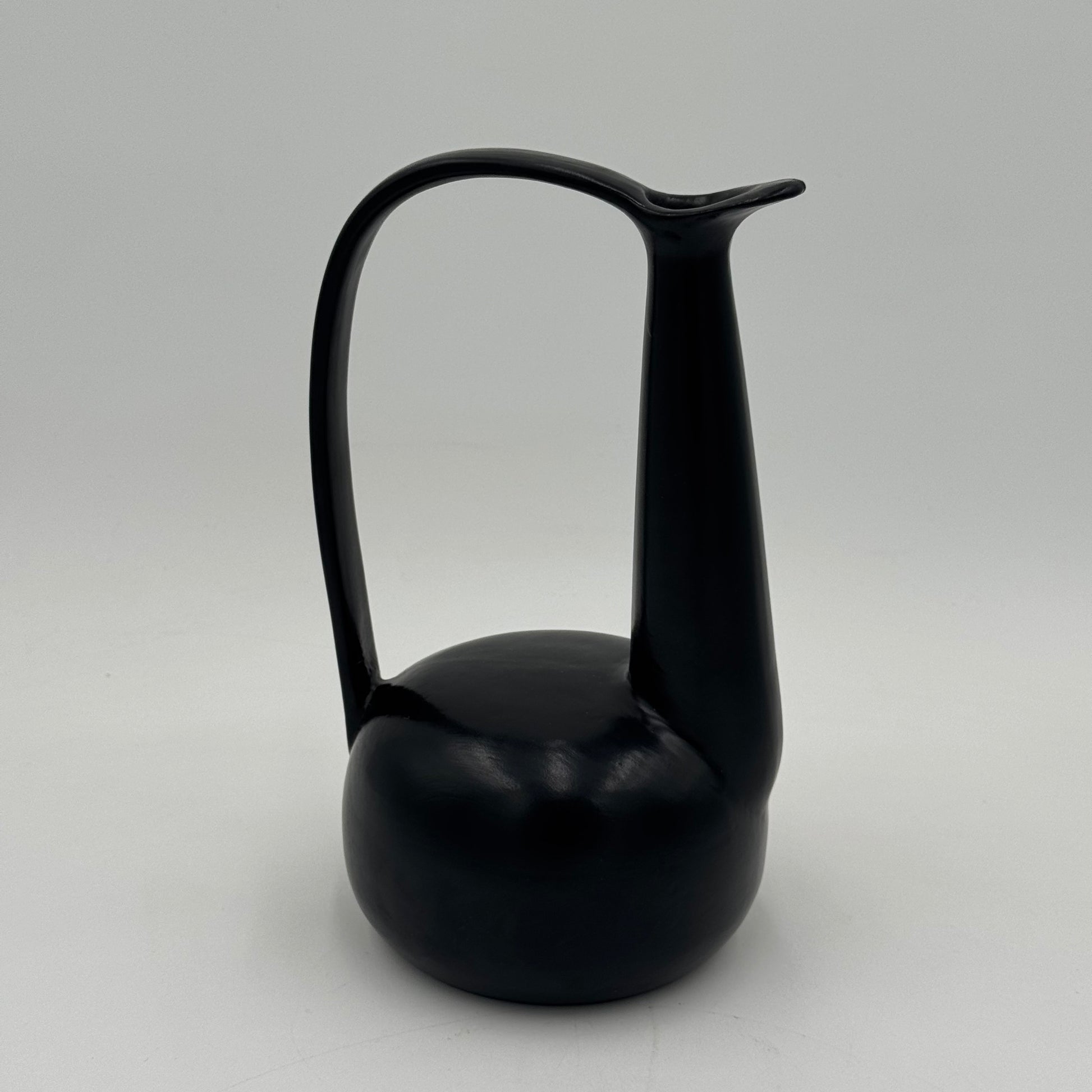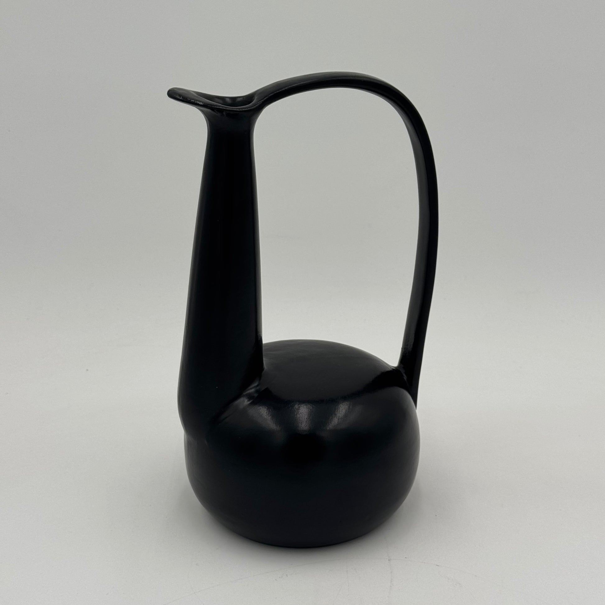 Raro vaso in ceramica nera bucchero, disegnato da Gio Ponti in collaborazione con Carlo Alberto Rossi negli anni Quaranta. L’opera si distingue per la sua linea scultorea e dinamica, con un manico ad arco pronunciato e un corpo levigato dalle superfici sinuose, tipiche della ricerca formale pontiana di quegli anni.