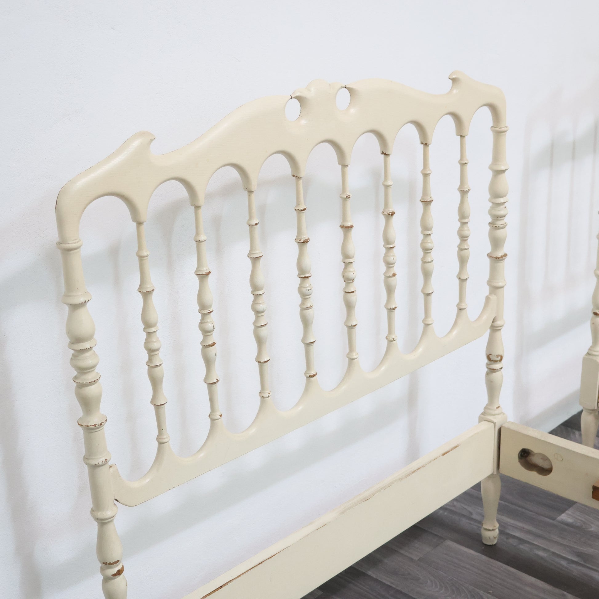Elegante letto singolo in legno laccato avorio, attribuito al celebre designer ligure Giuseppe Gaetano Descalzi, ideatore delle iconiche sedie Chiavarine. Realizzato negli anni ’50, questo pezzo conserva tutta la grazia e la leggerezza tipica della scuola di Chiavari: linee tornite, proporzioni armoniose e un’eleganza senza tempo.