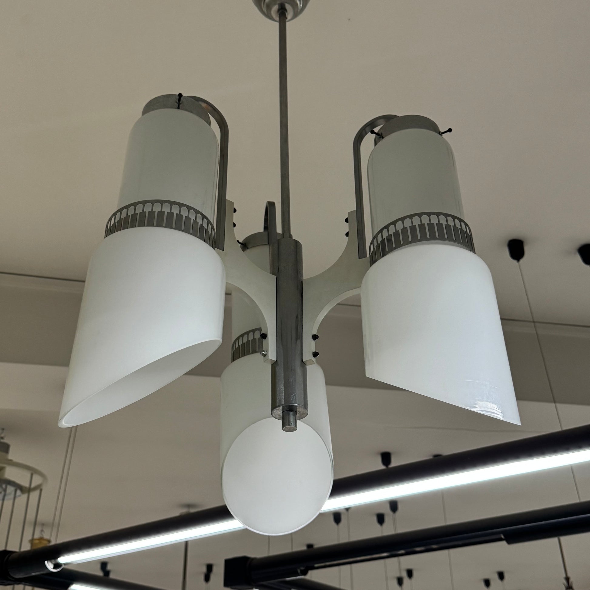 Struttura interamente in acciaio composta da tre braccia, diffusori interamente in vetro di colore bianco. L’articolo è in ottime condizioni conservative, presenti soltanto lievi segni del tempo dovuti all’utilizzo e all’età maggiormente sulla struttura. I vetri sono perfettamente integri.