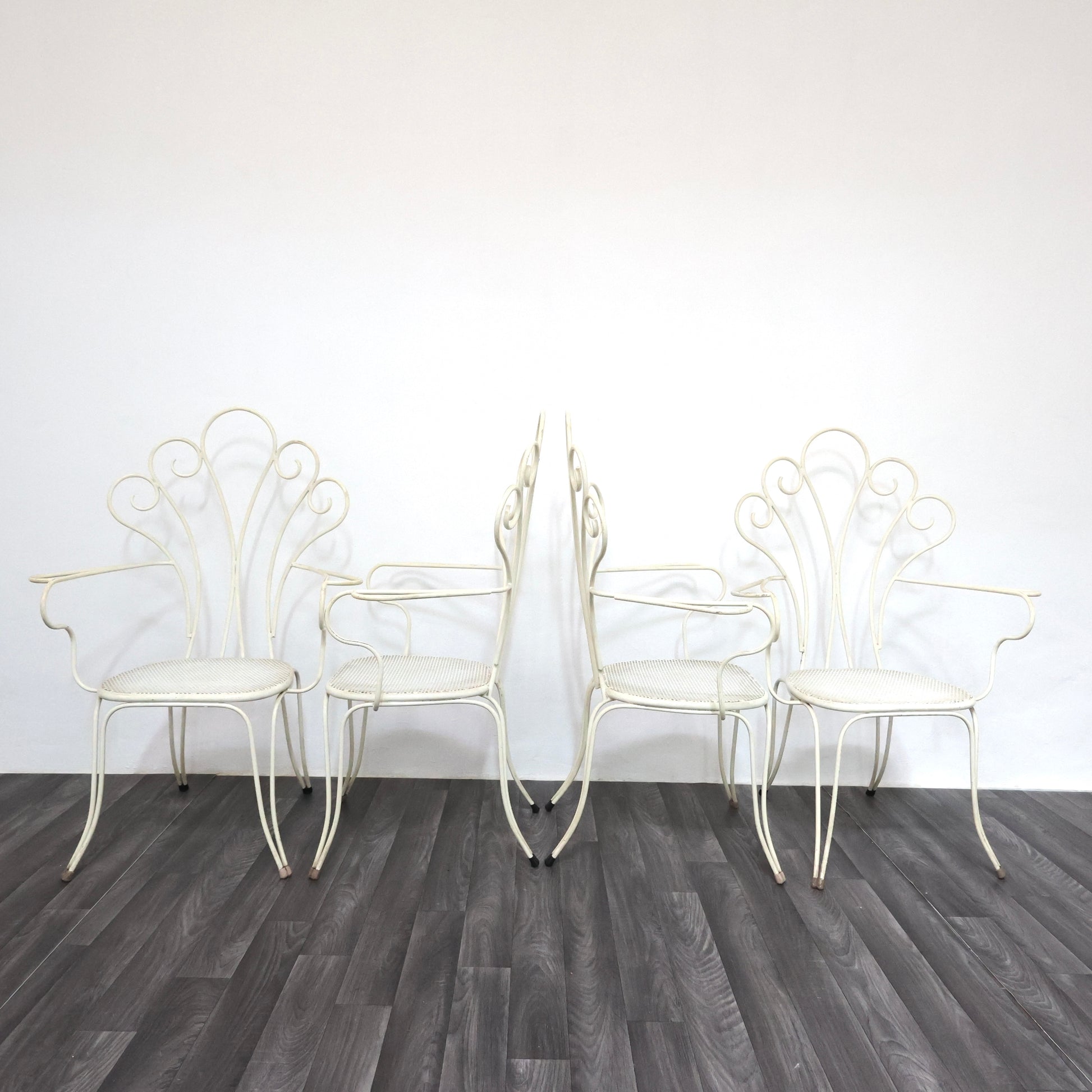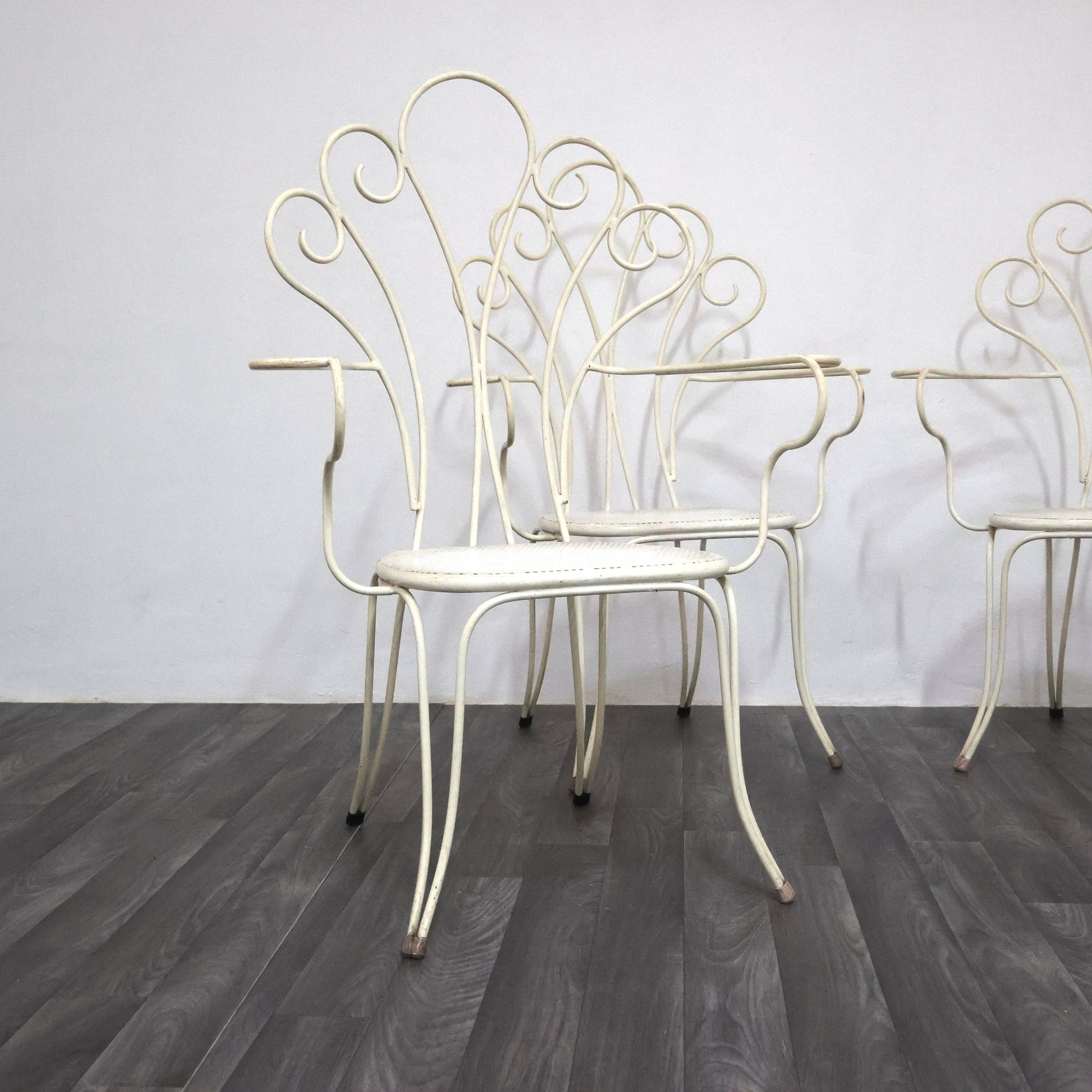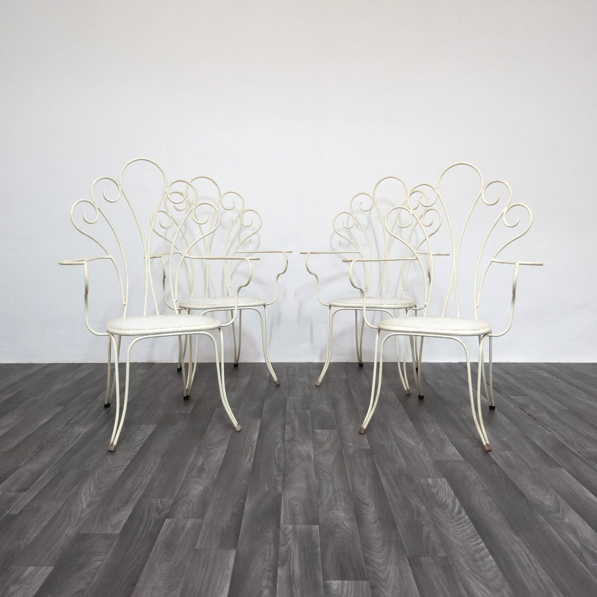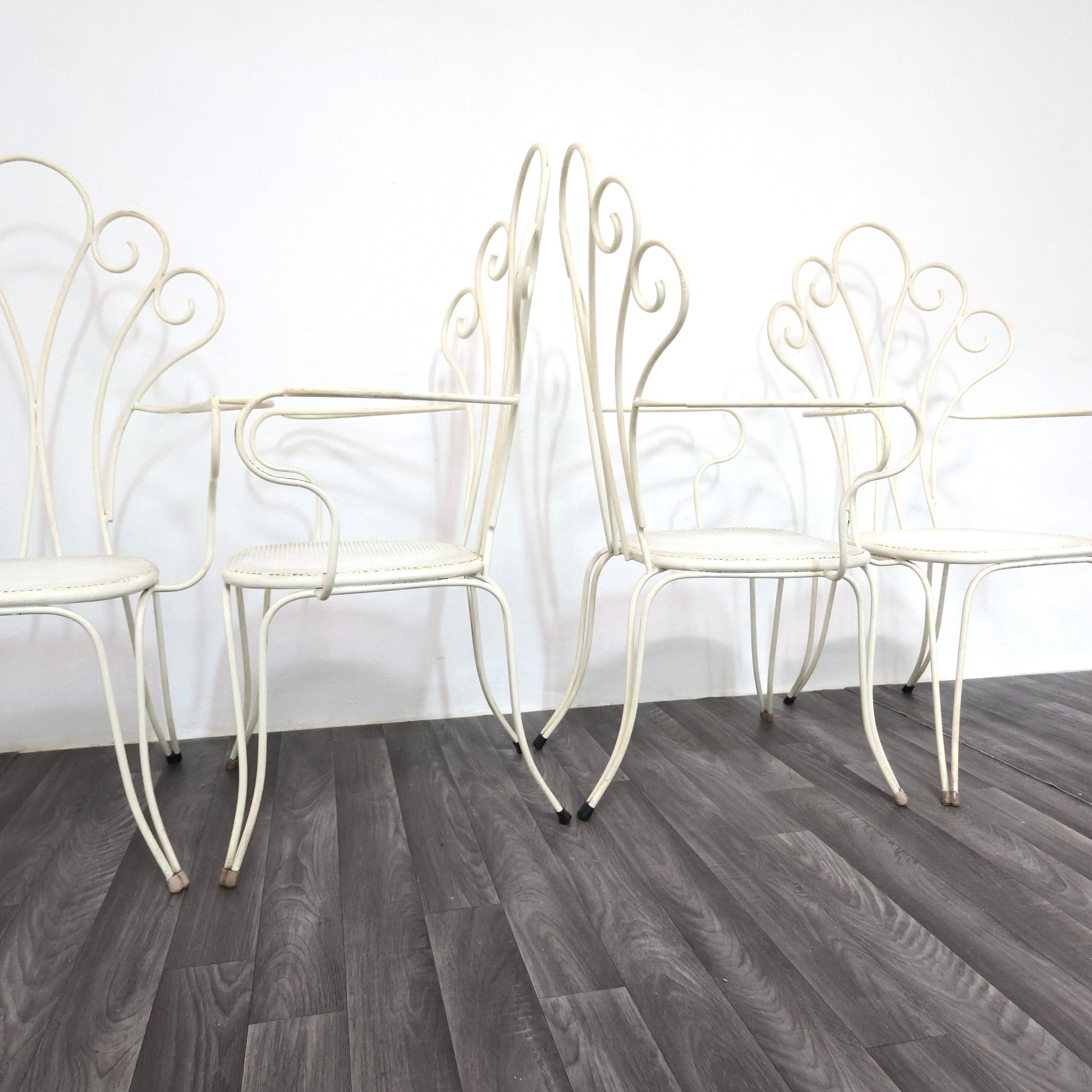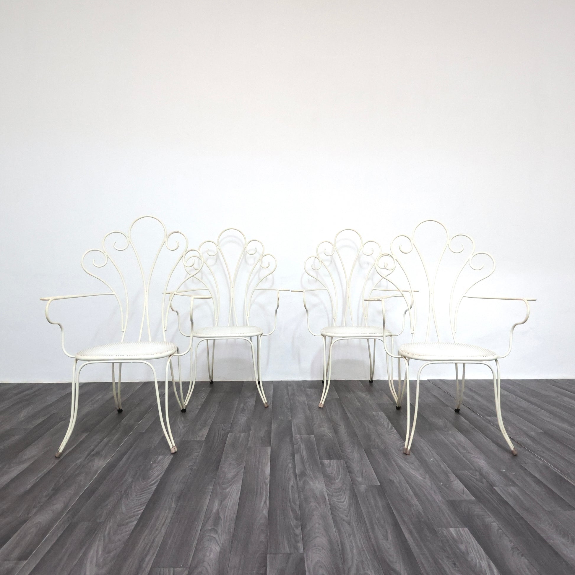 Elegante set di 4 sedie da giardino attribuite a Lio Carminati, realizzate in ferro battuto smaltato bianco. Un raffinato esempio di design anni ’50, caratterizzato da linee sinuose e leggere che richiamano motivi floreali e naturali, tipici dello stile modernariato italiano.