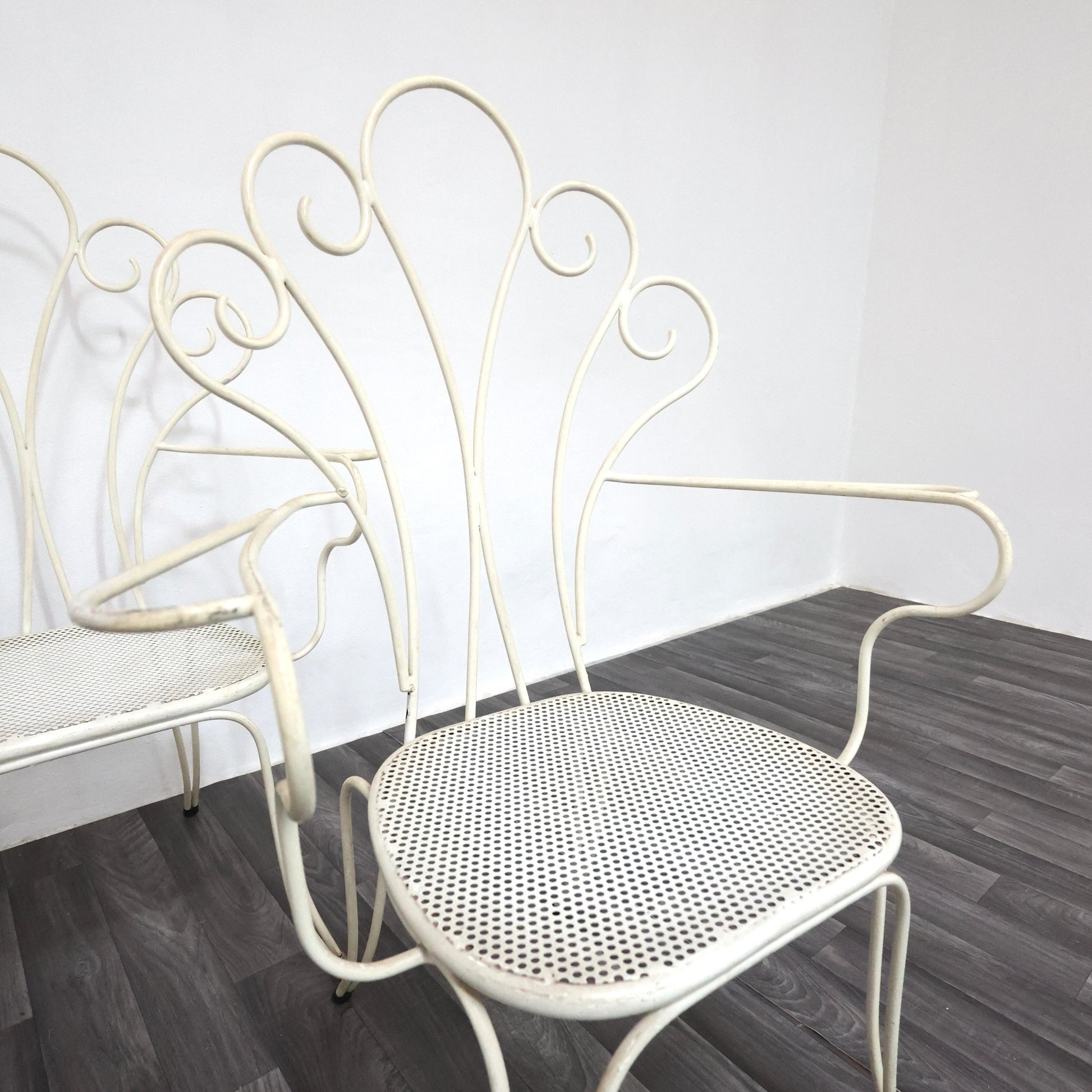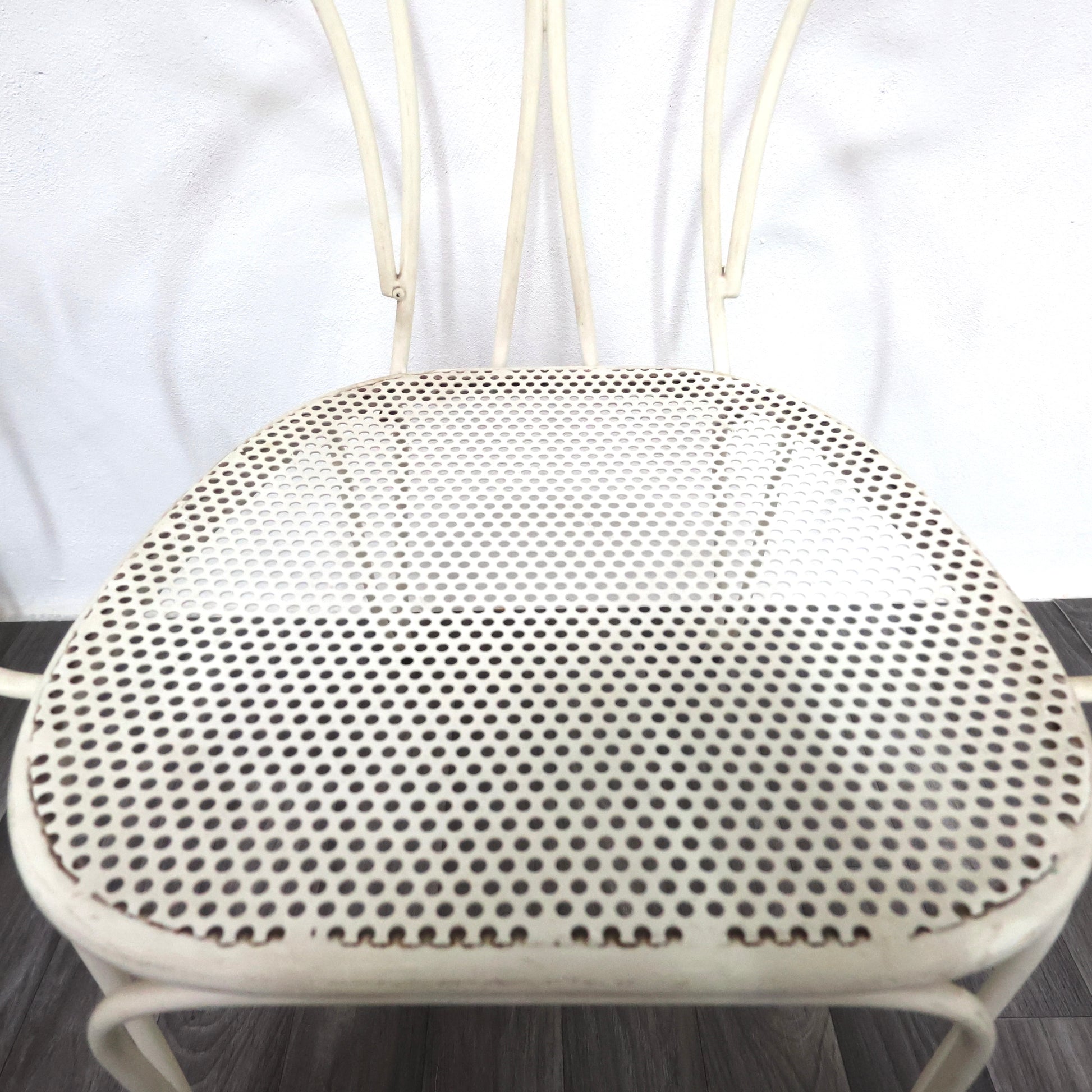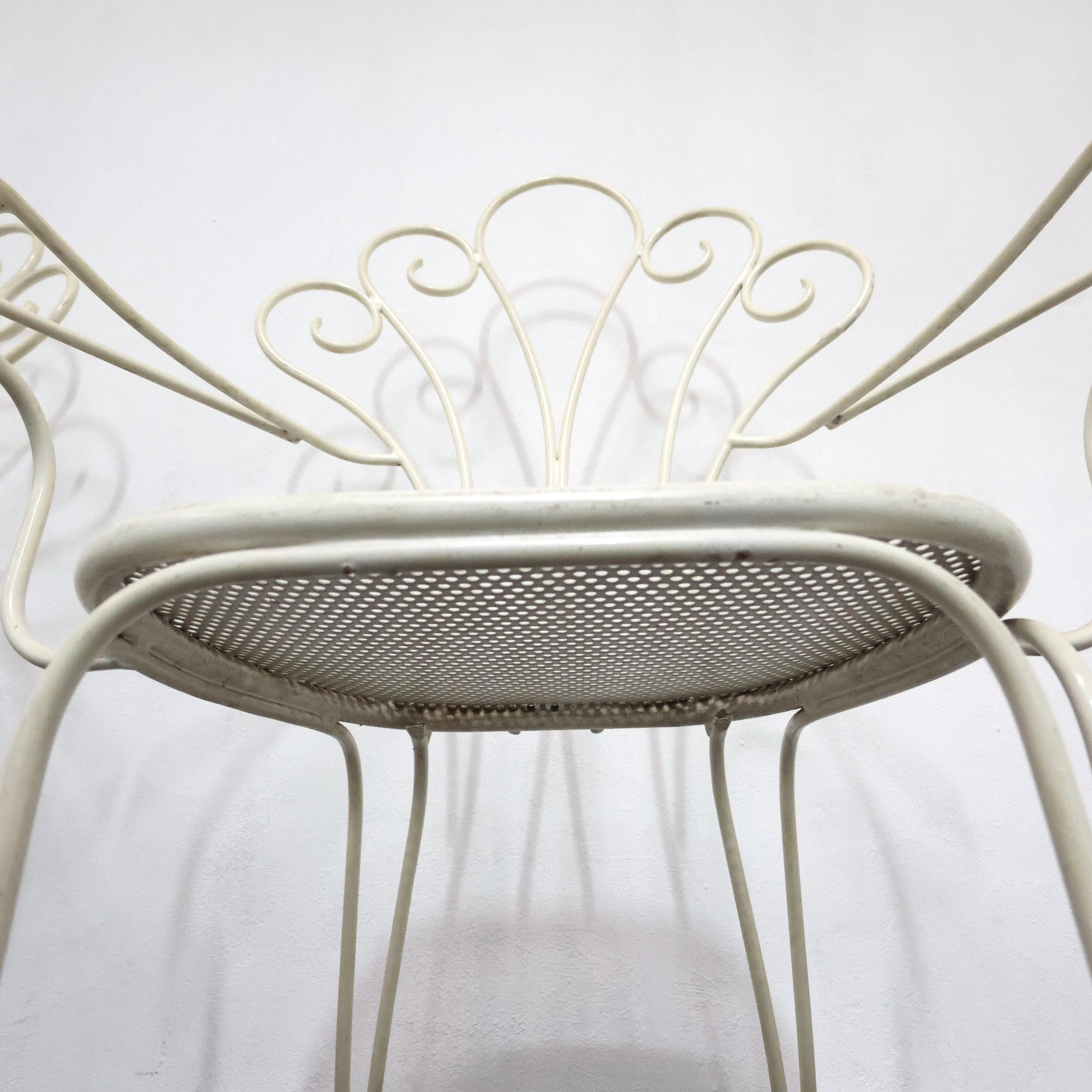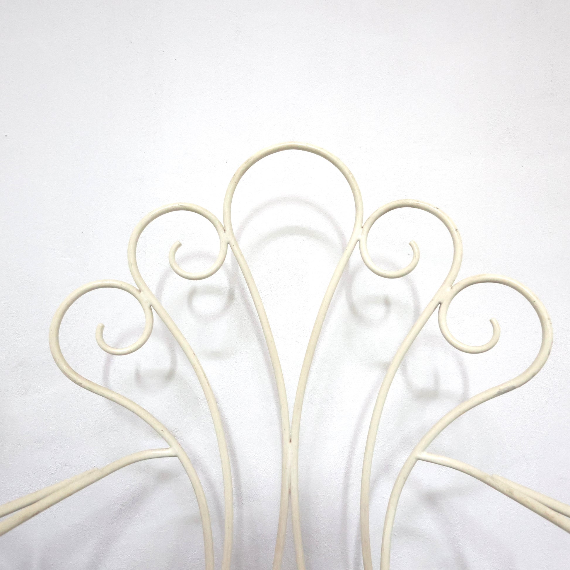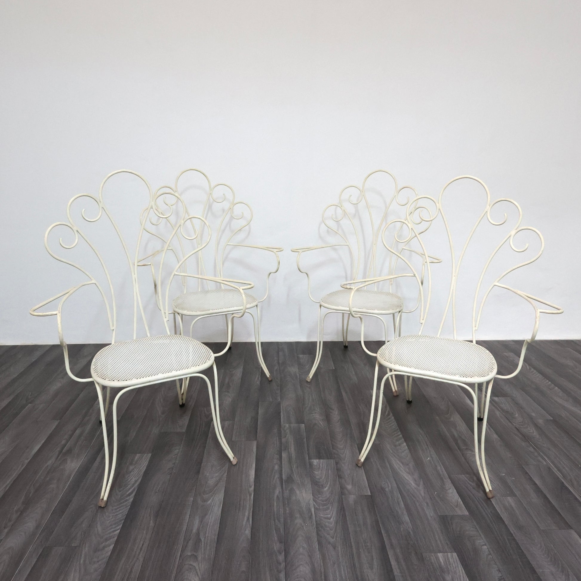 Elegante set di 4 sedie da giardino attribuite a Lio Carminati, realizzate in ferro battuto smaltato bianco. Un raffinato esempio di design anni ’50, caratterizzato da linee sinuose e leggere che richiamano motivi floreali e naturali, tipici dello stile modernariato italiano.