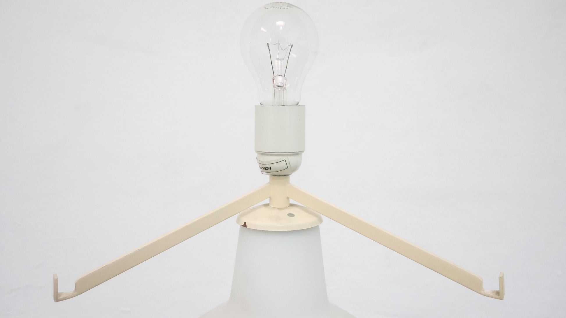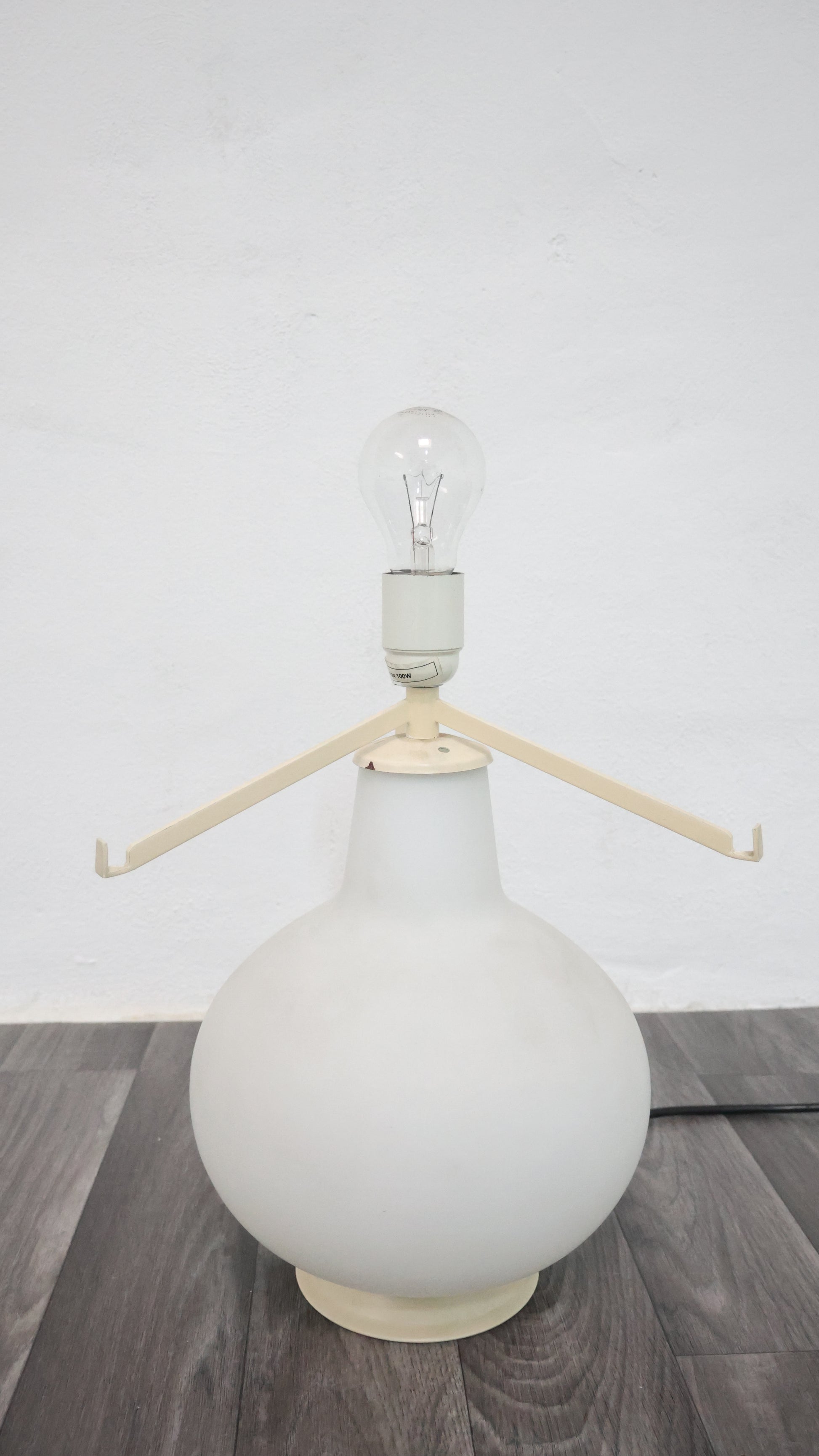 Elegante lampada da tavolo in vetro satinato e metallo, modello iconico disegnato da Max Ingrand per Fontana Arte, simbolo del design italiano del Novecento.