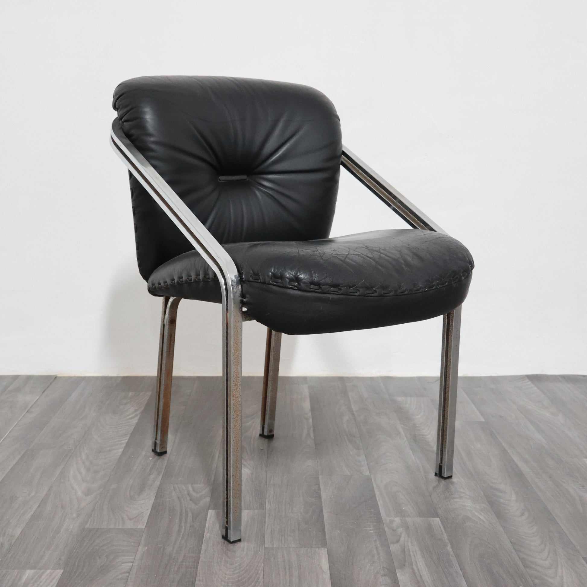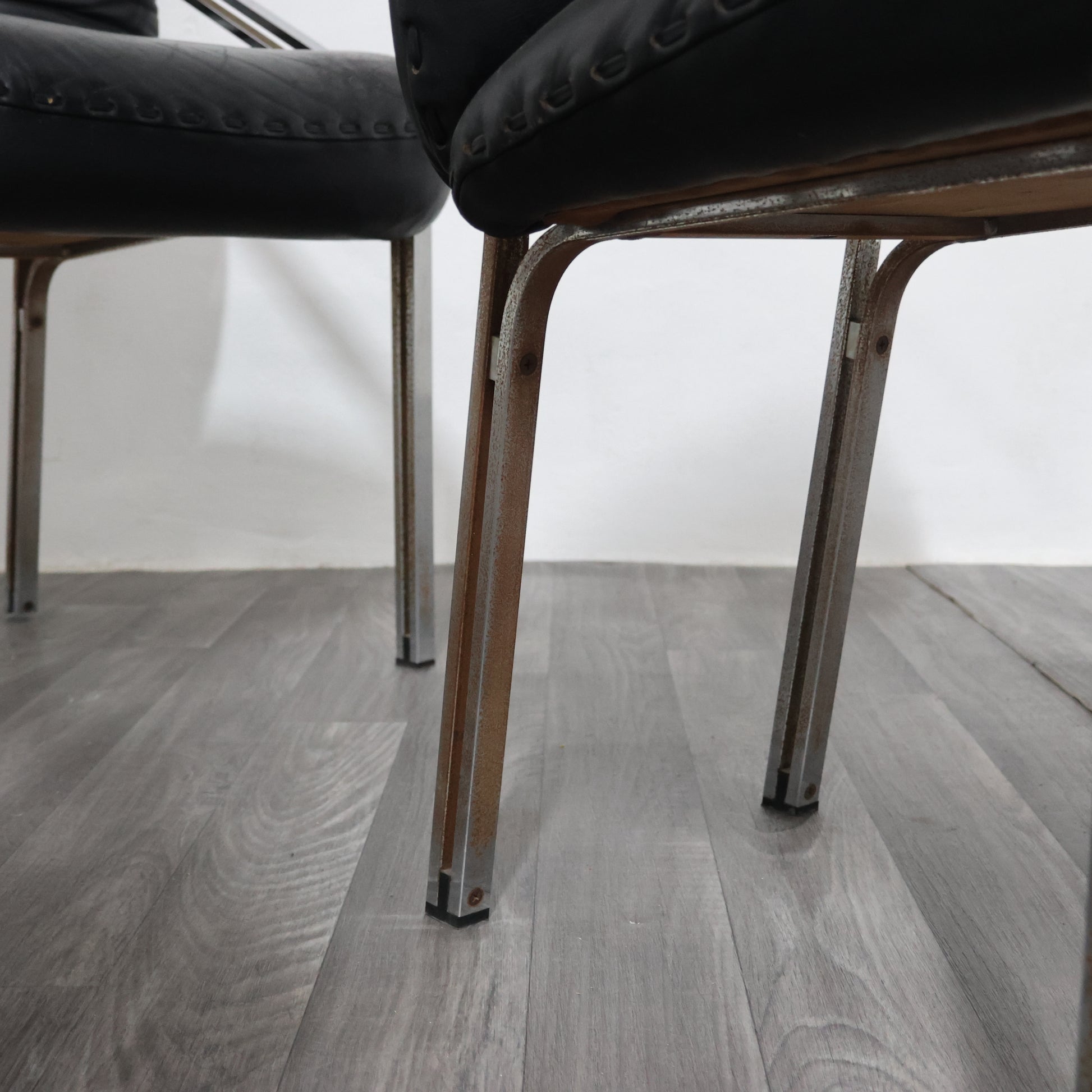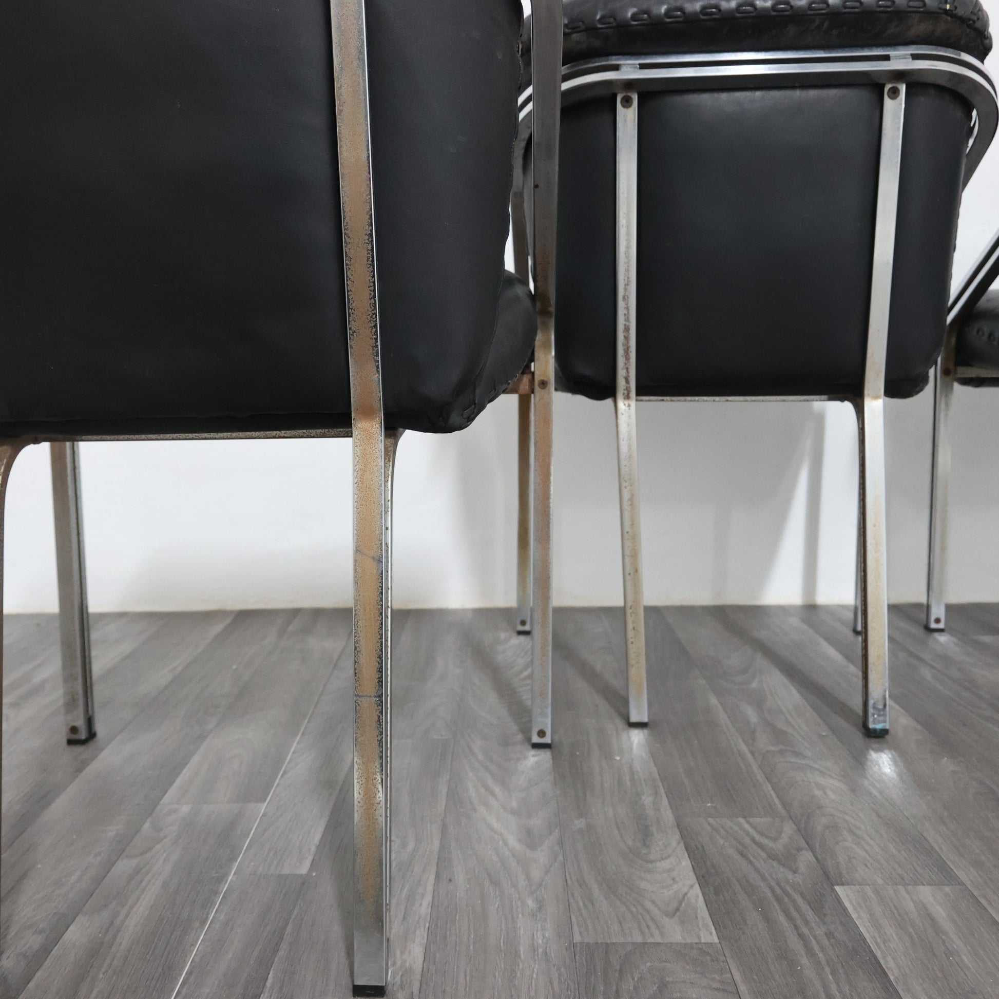 Elegante set da pranzo firmato Mobil Girgi, composto da quattro poltroncine con struttura in acciaio cromato e rivestimento in pelle nera.