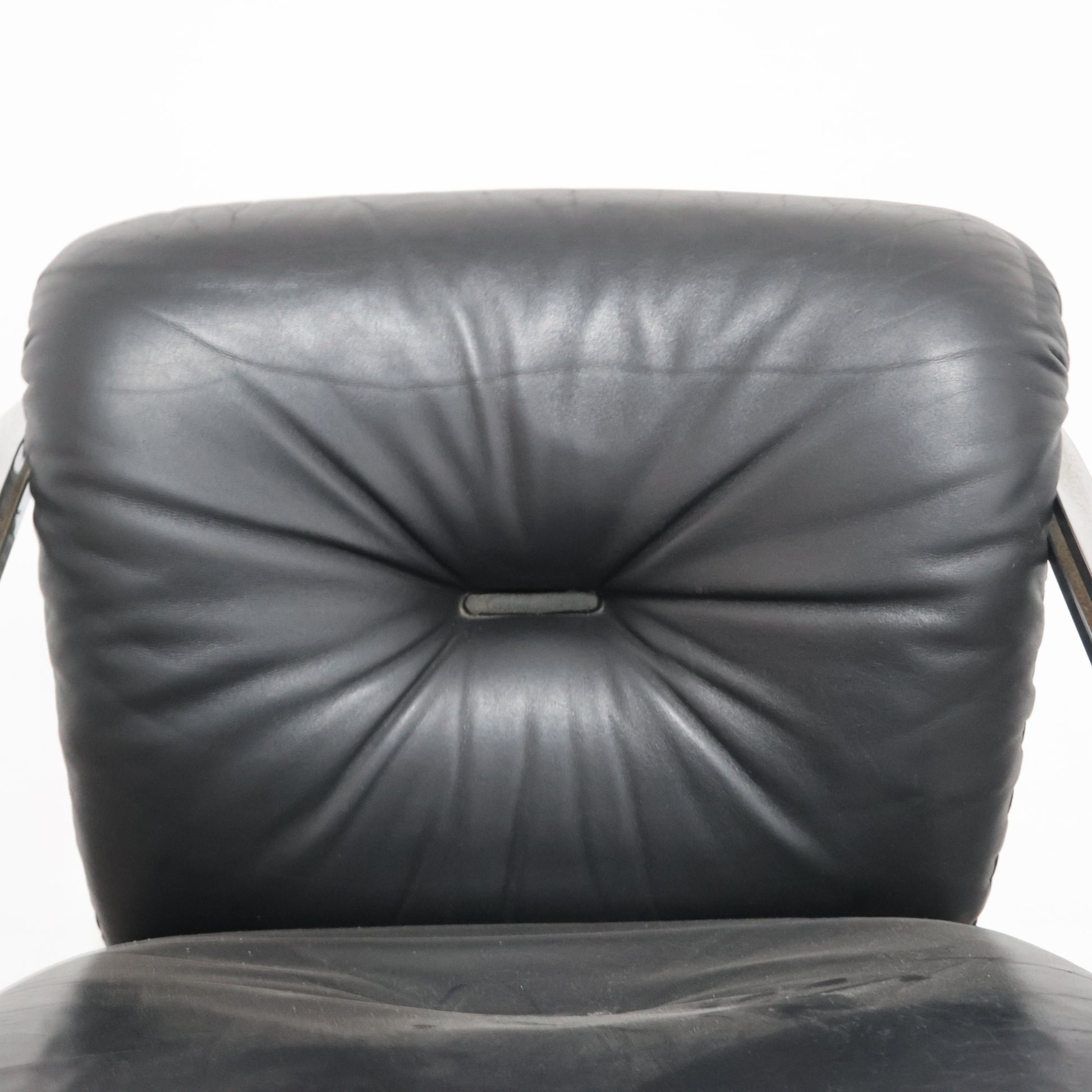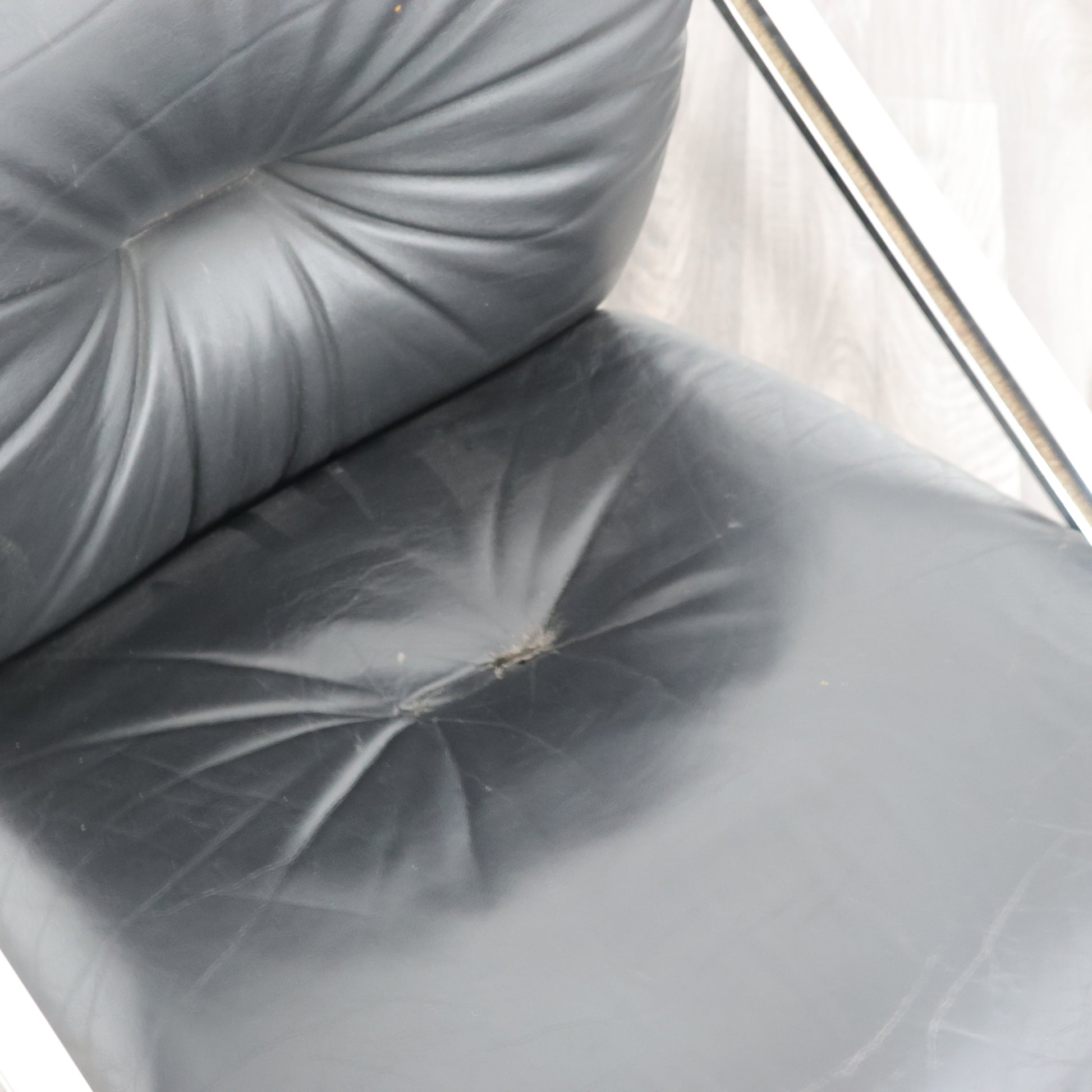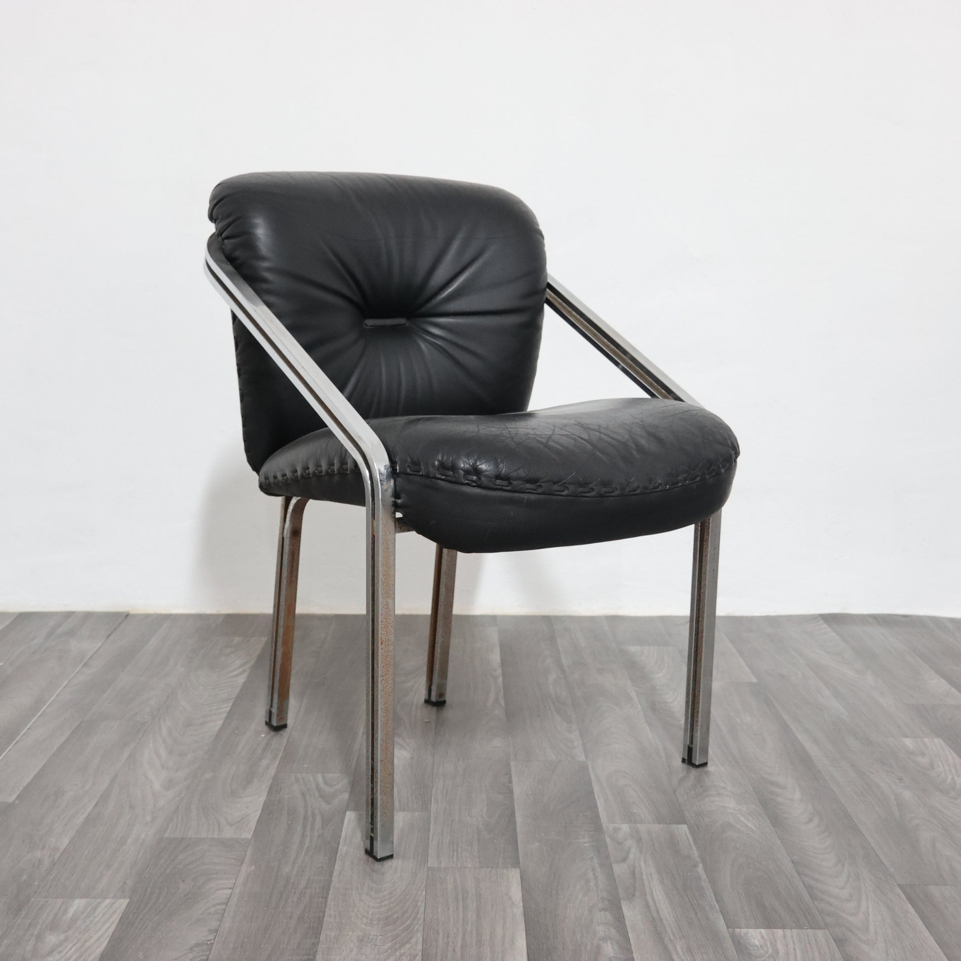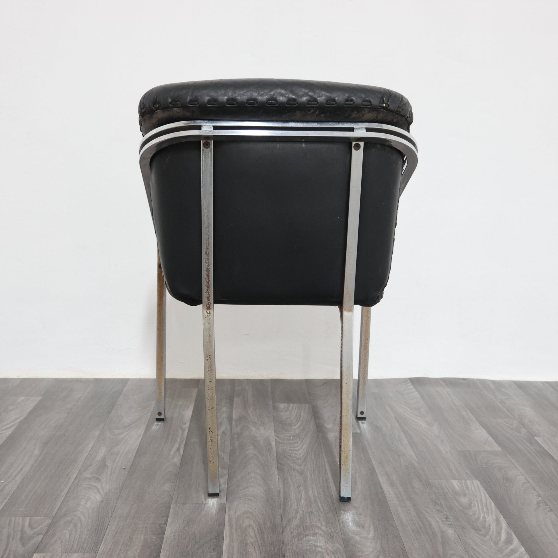 Elegante set da pranzo firmato Mobil Girgi, composto da quattro poltroncine con struttura in acciaio cromato e rivestimento in pelle nera.