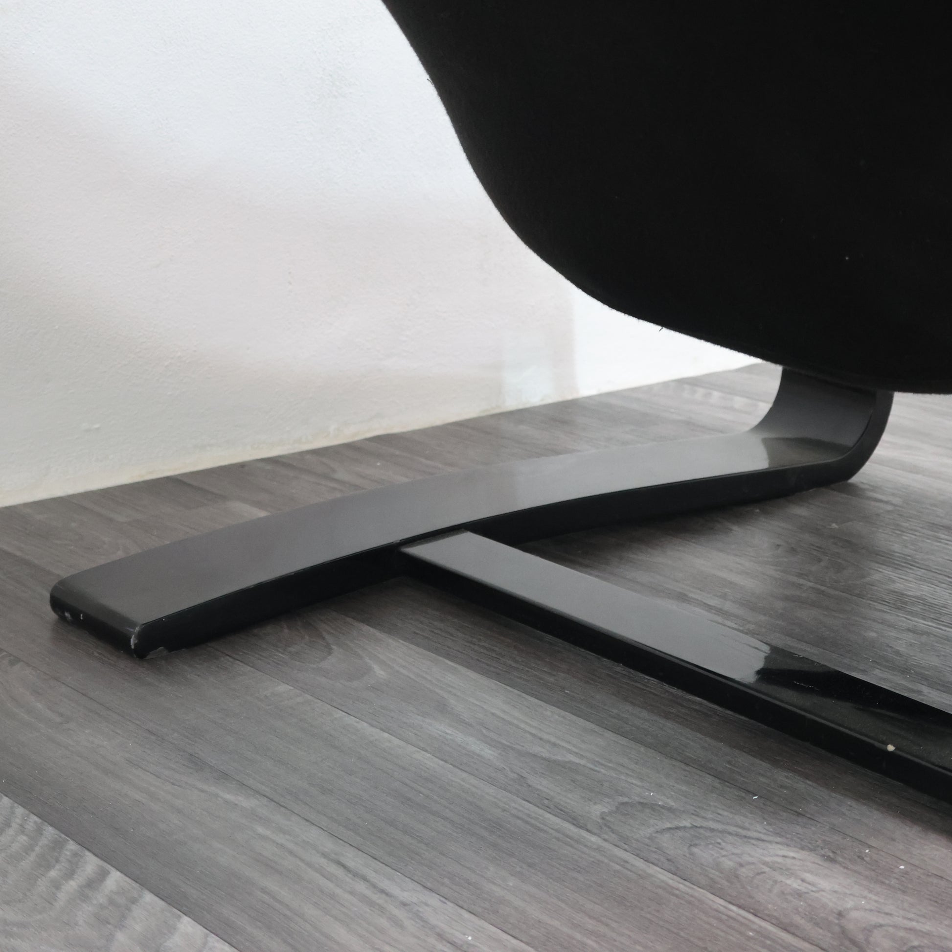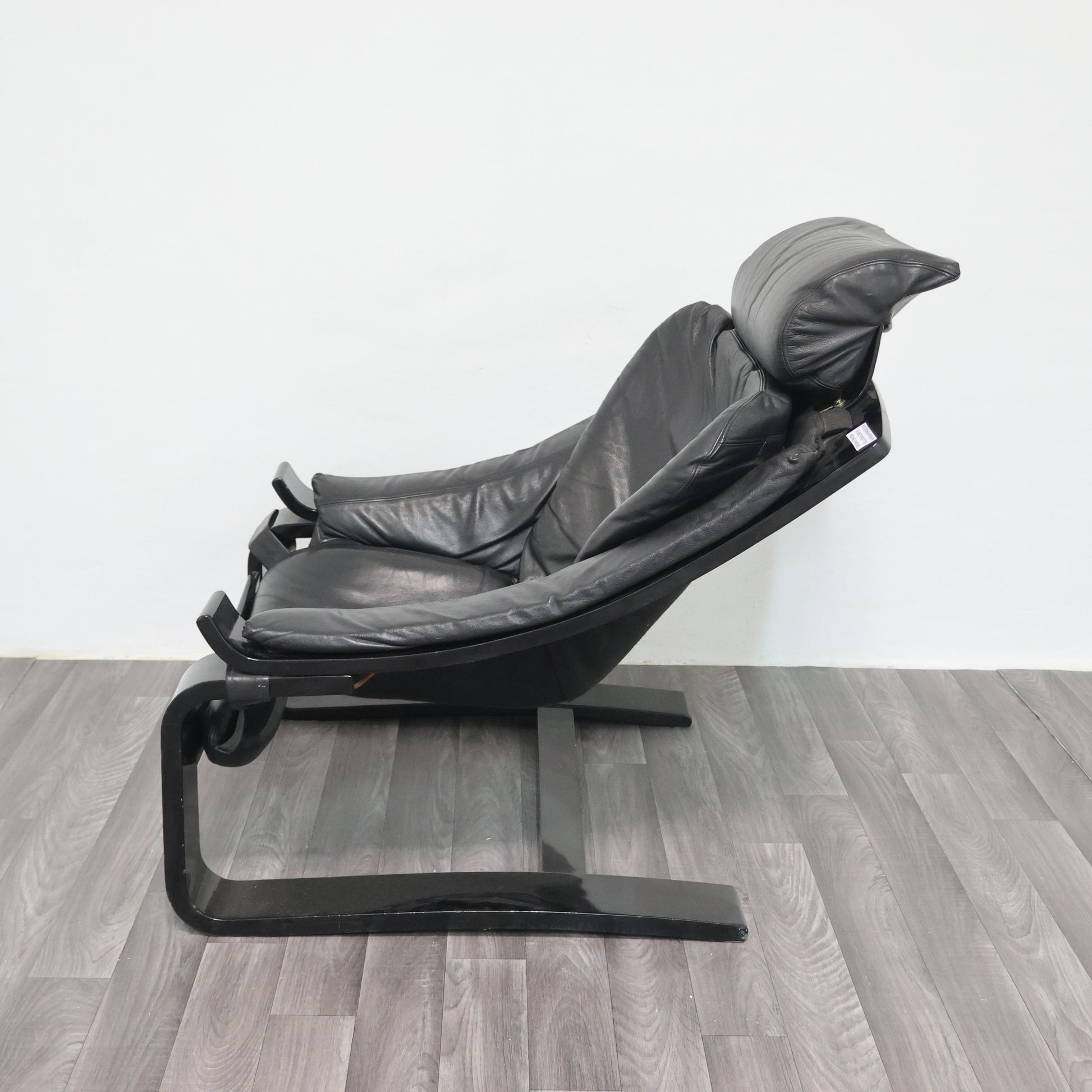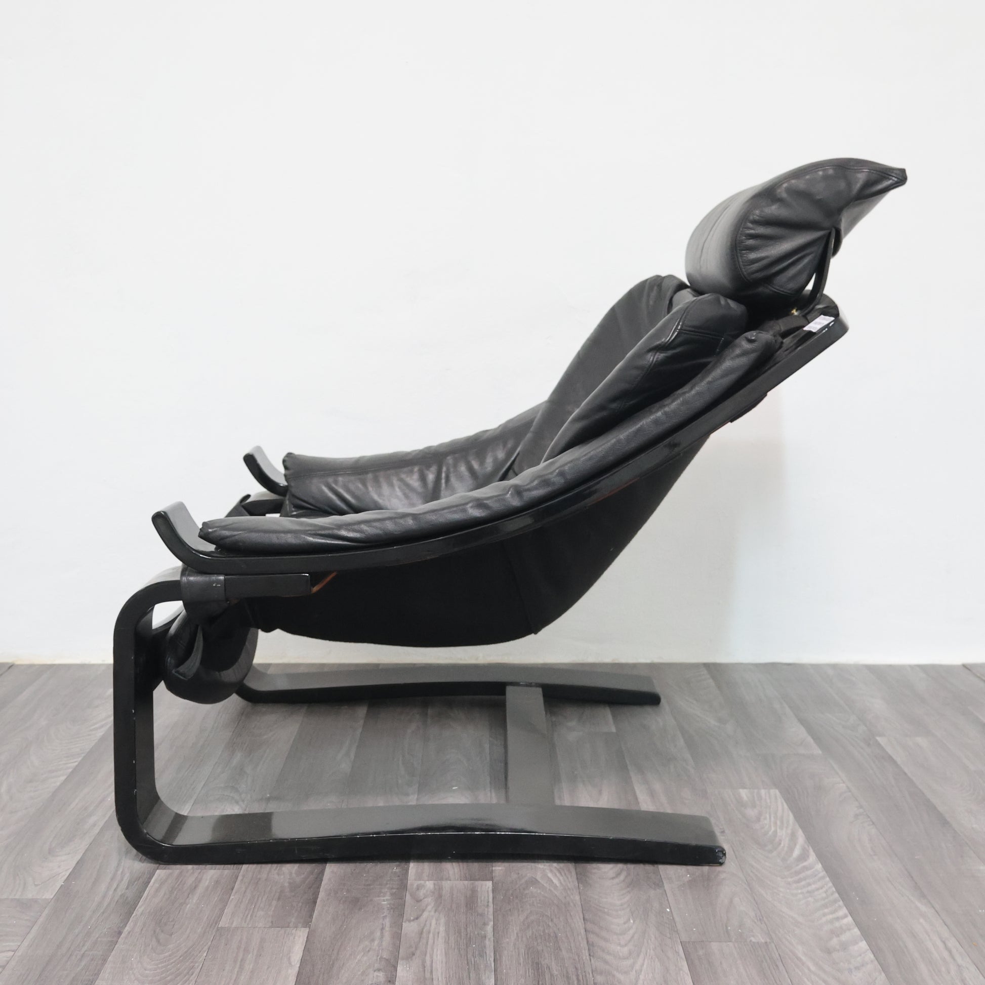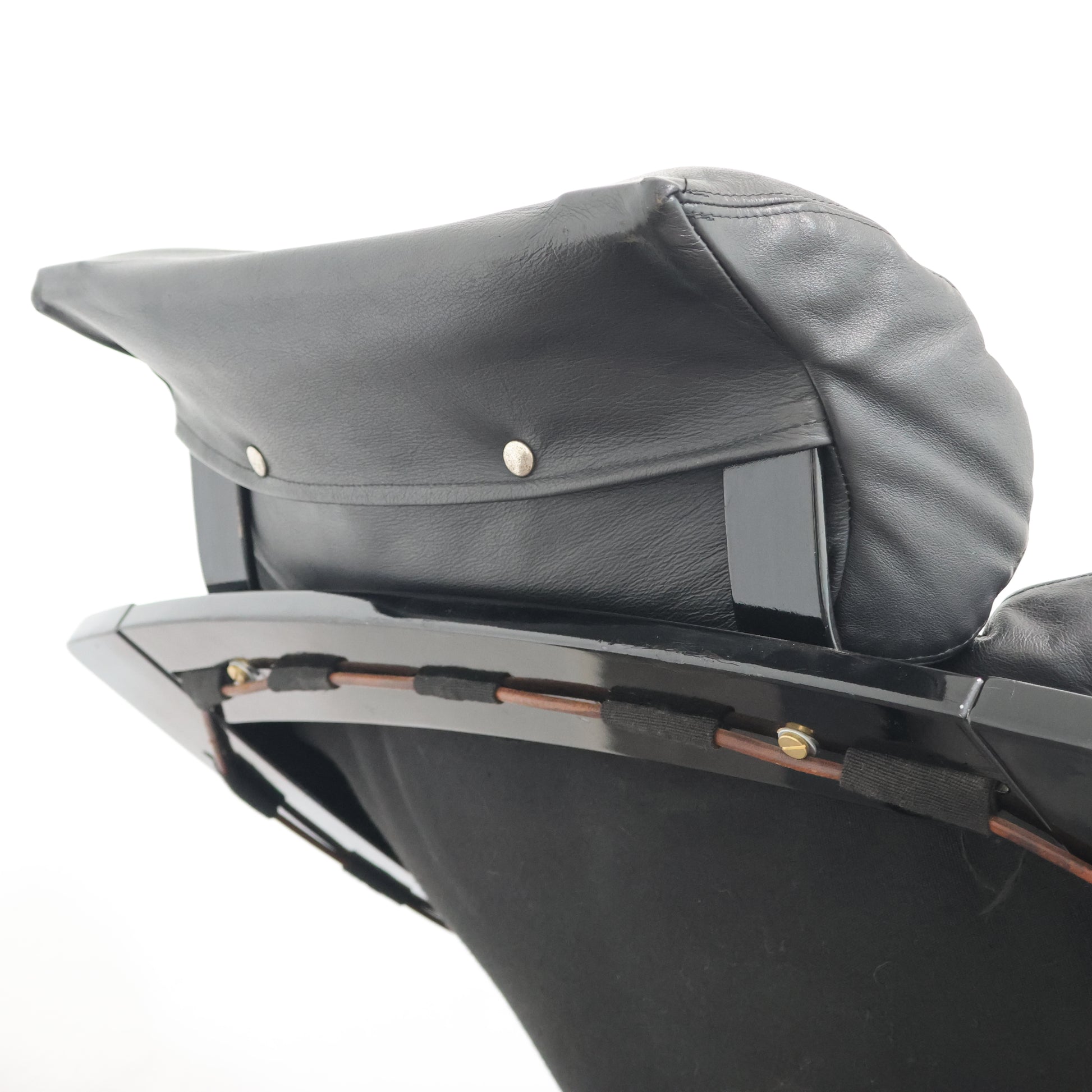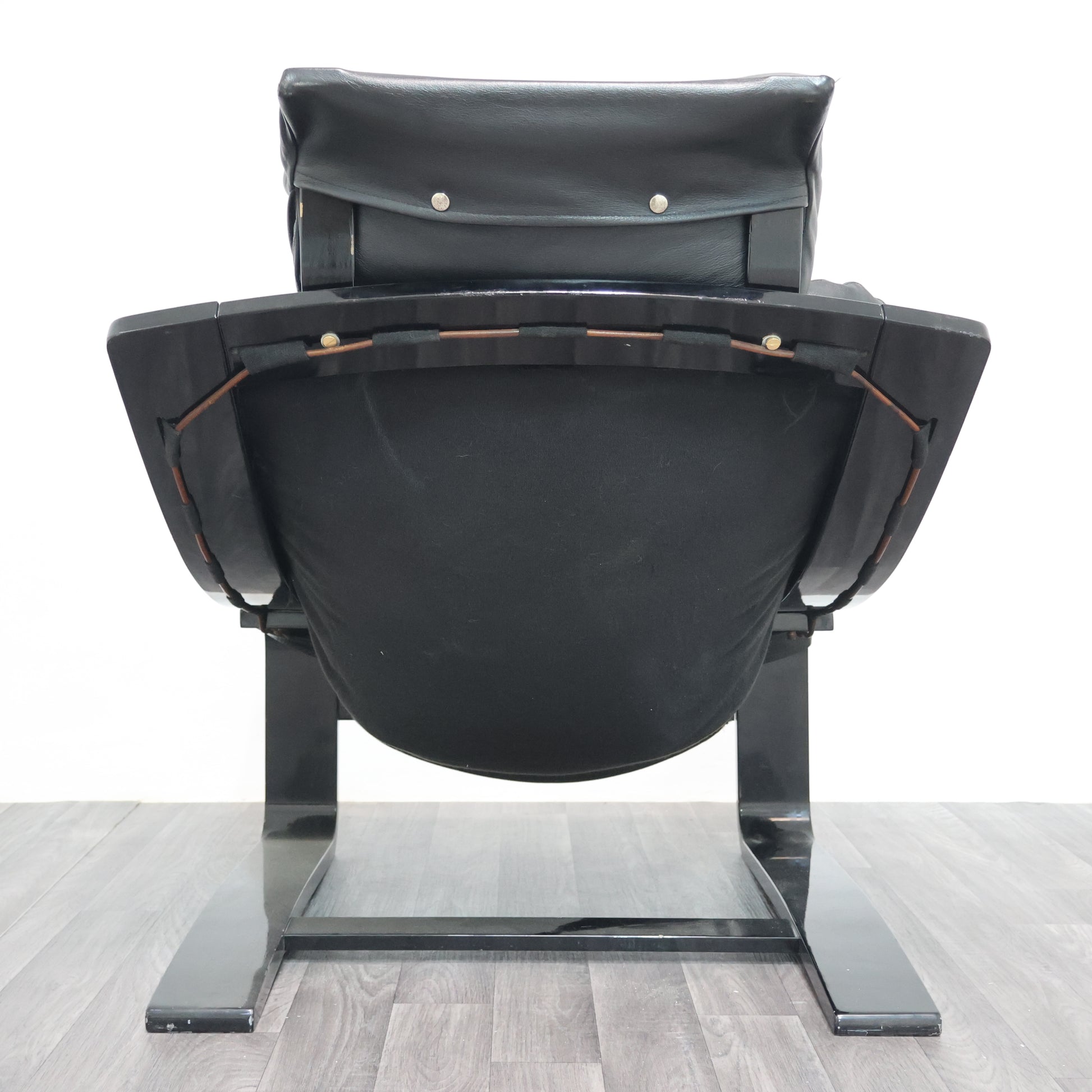 Struttura in legno laccato curvato nero, seduta, schienale e cuscino di vera pelle.