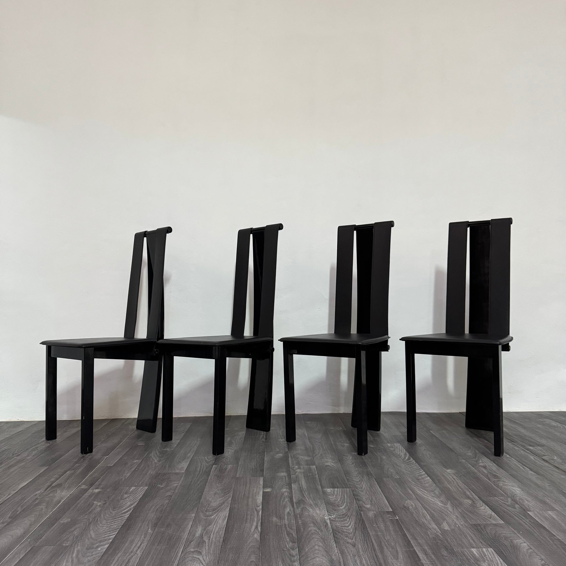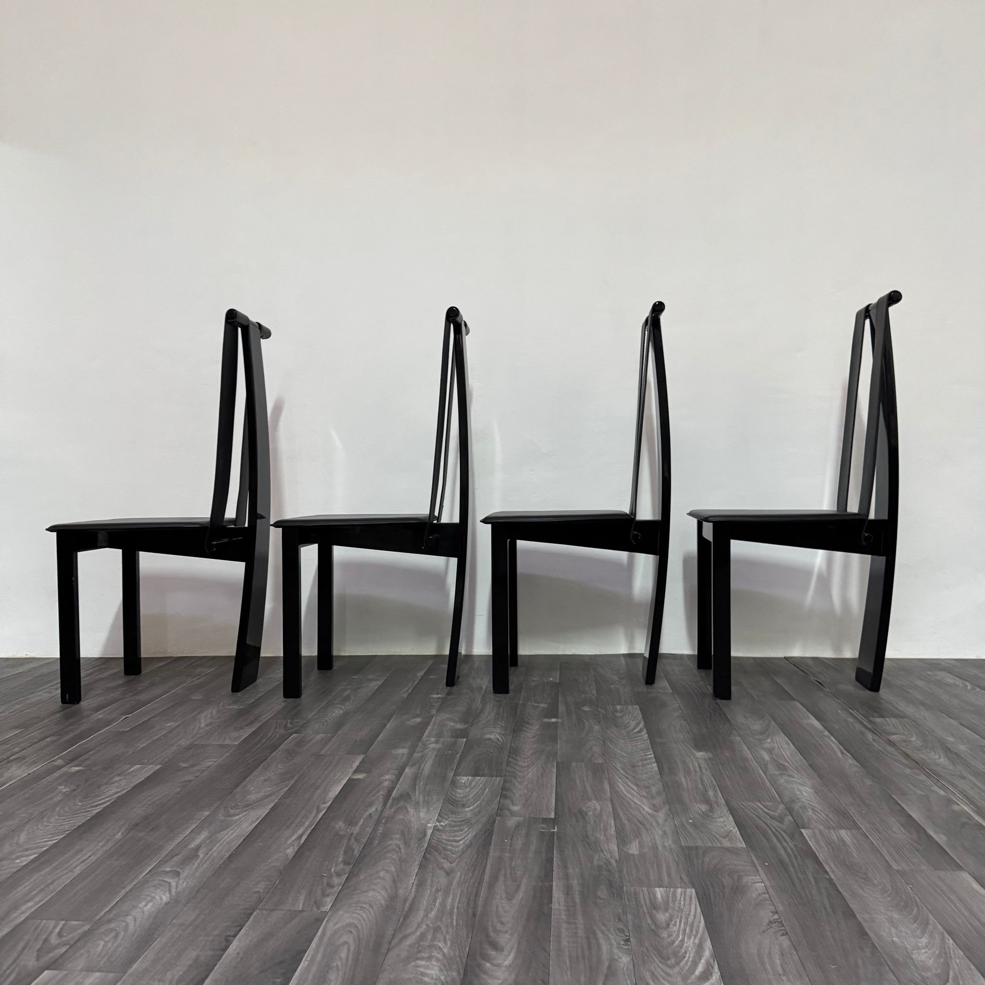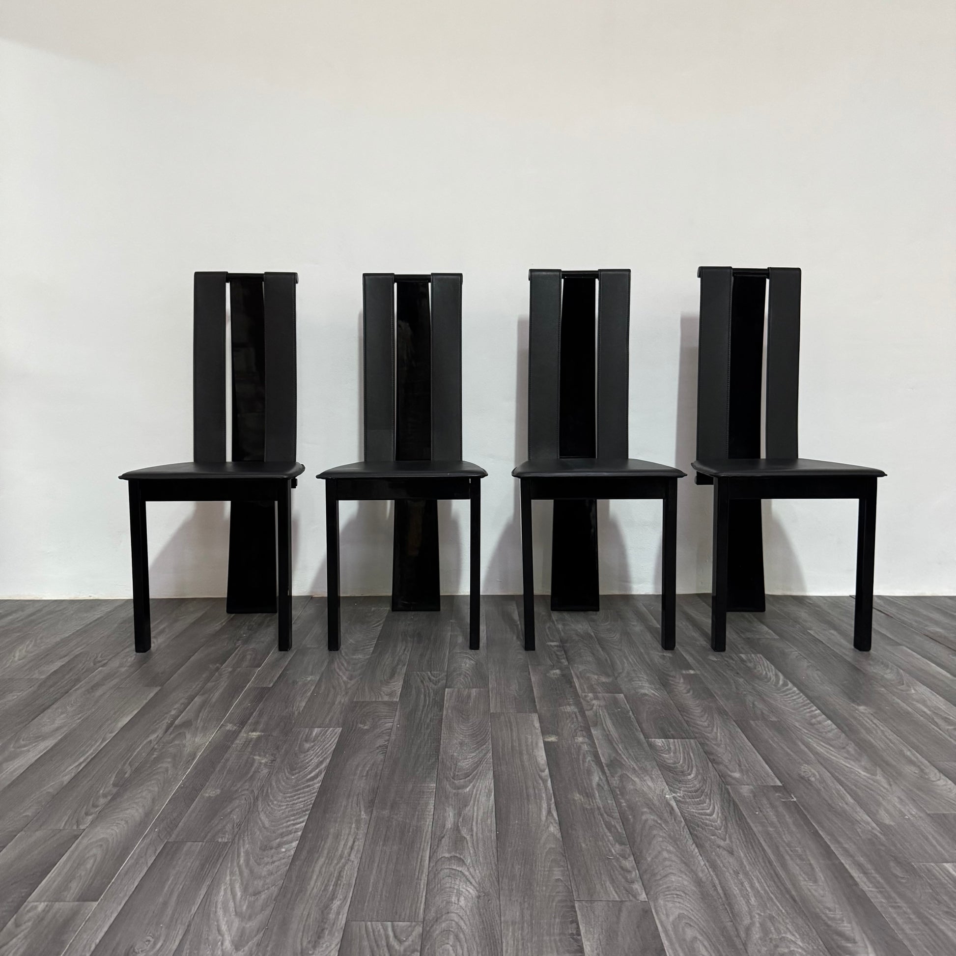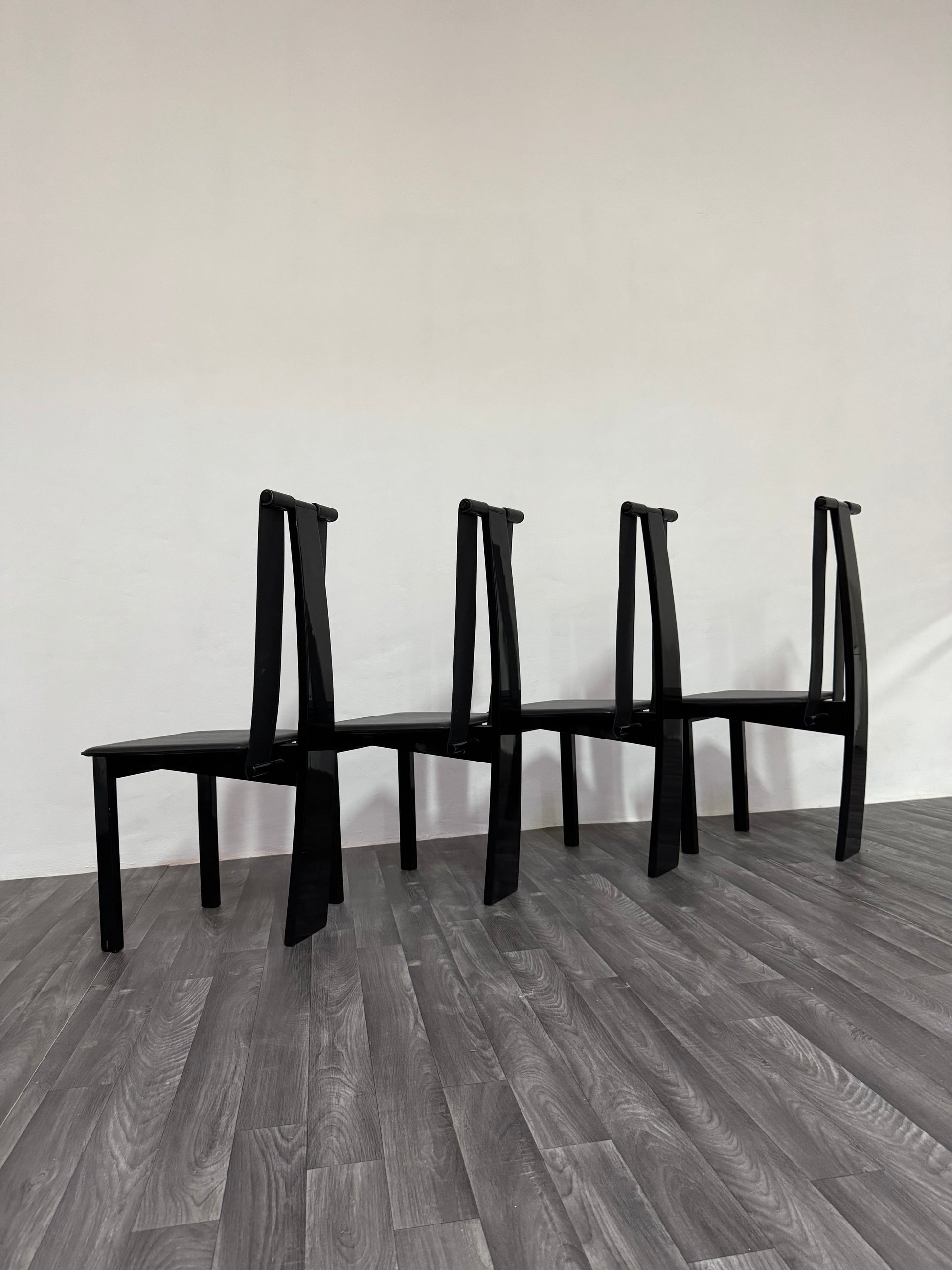 Elegante set di quattro sedie postmoderne originali degli anni ’80, caratterizzate da linee essenziali e un’estetica scultorea tipica del periodo. Il design minimale ma deciso le rende perfette per ambienti contemporanei, industriali o modernariato.
