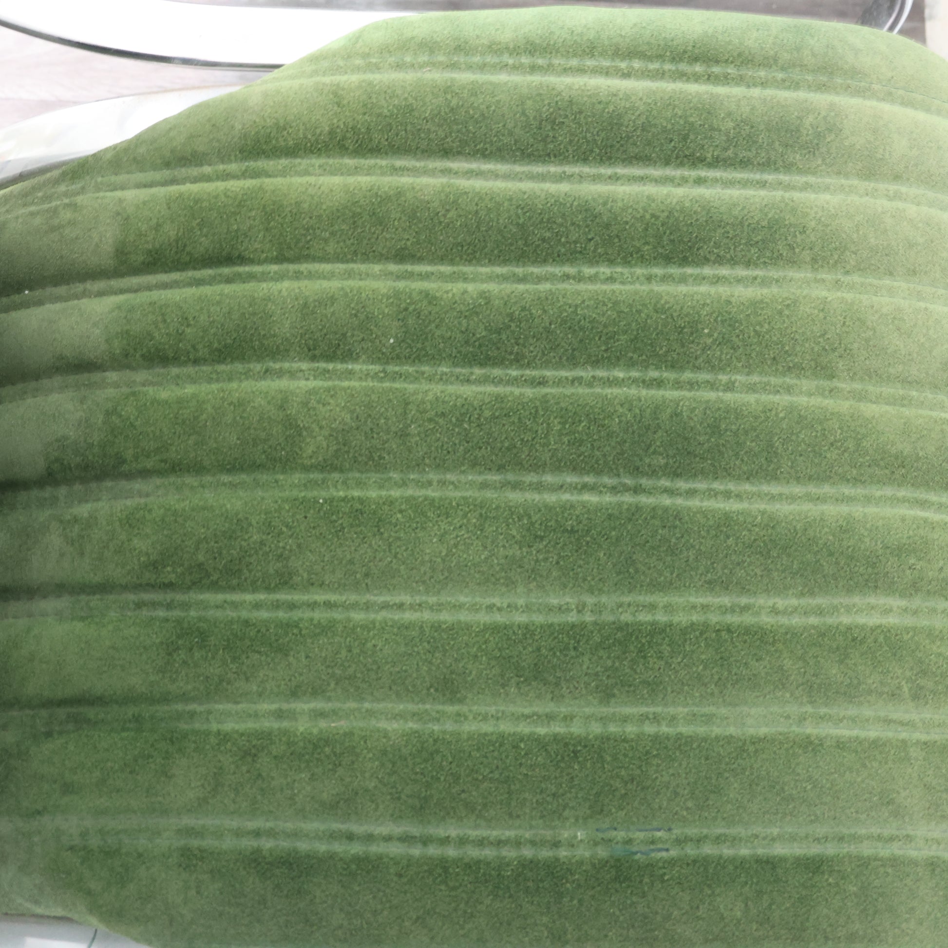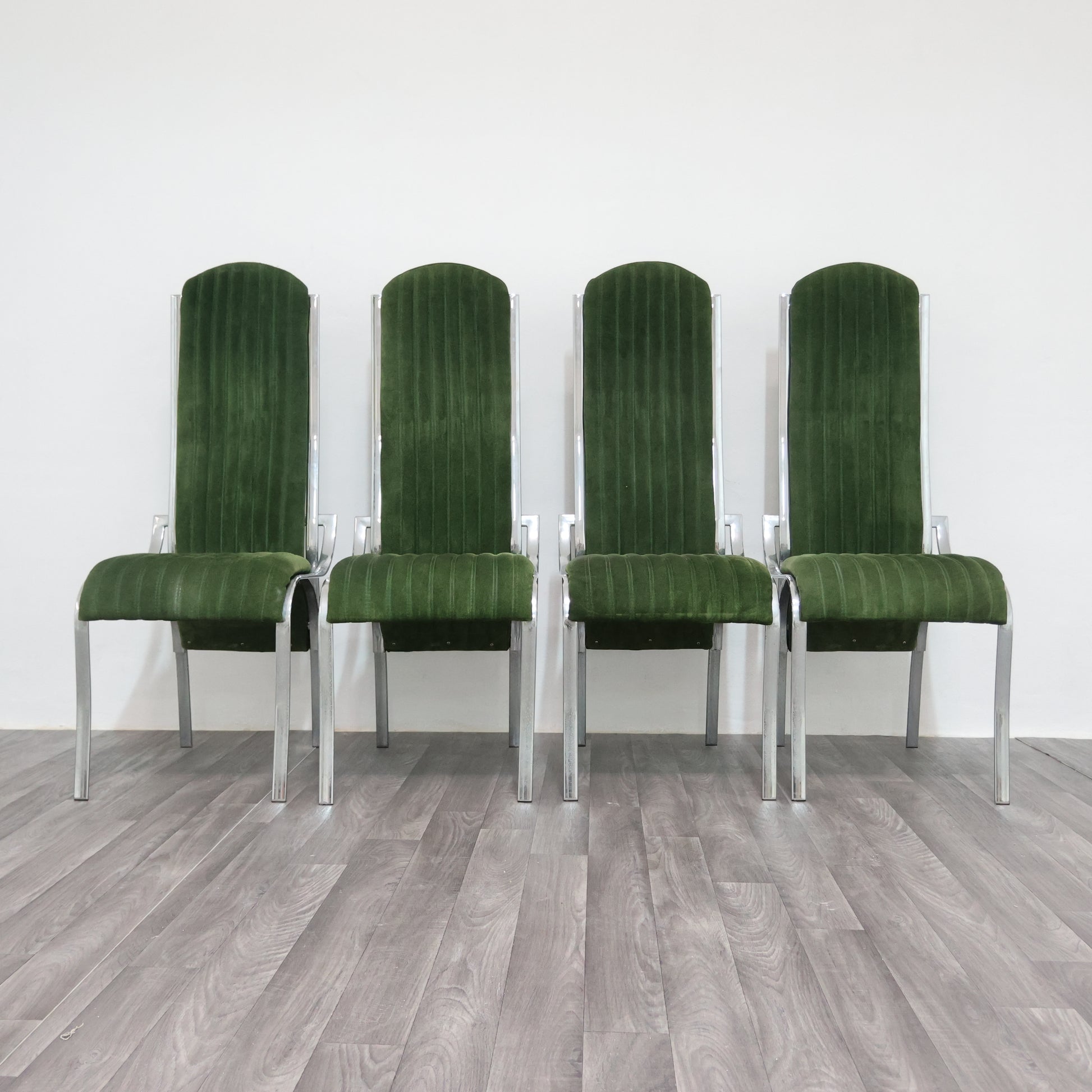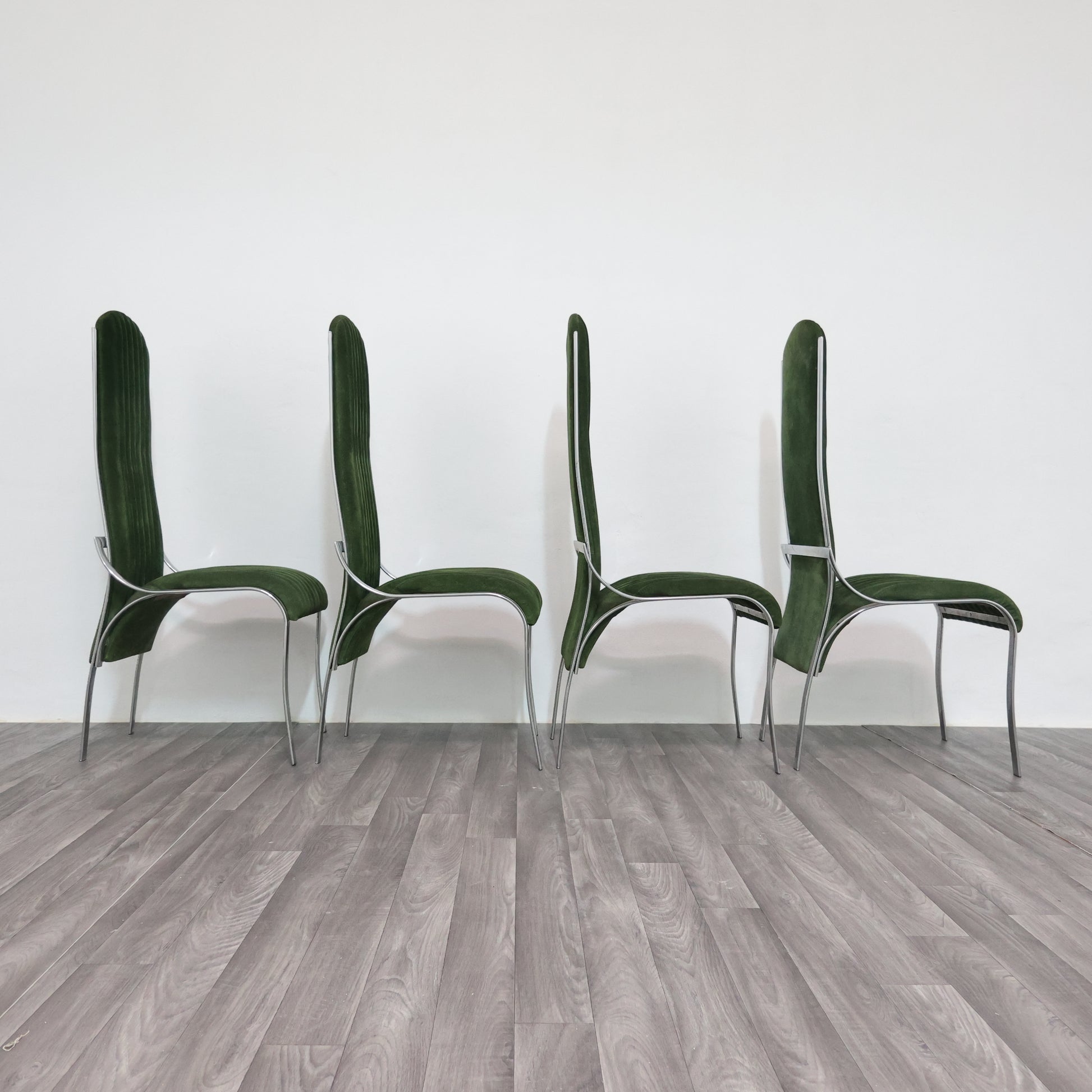 Set di 4 Sedie da Pranzo in Acciaio Cromato e Alcantara Verde – Anni ’70 Questo straordinario set di sedie da pranzo, risalente agli anni ’70, rappresenta un perfetto equilibrio tra design scultoreo e comfort avvolgente. La struttura in acciaio cromato, sinuosa ed elegante, dona leggerezza visiva pur mantenendo grande solidità. Le sedute e gli schienali alti, completamente rivestiti in alcantara verde con cuciture verticali, offrono una texture vellutata e un’impronta decisamente glamour. Le linee curve e l’estetica audace richiamano le influenze futuristiche tipiche del design Space Age, rendendole ideali sia per ambienti moderni che per interni eclettici con carattere vintage. Caratteristiche: • Epoca: Anni ’70 • Materiali: Struttura in acciaio cromato, rivestimento in alcantara verde • Condizioni: Ottime, lievi segni del tempo compatibili con l’età • Stile: Space Age / Modernismo Italiano Perfette per valorizzare una sala da pranzo, uno studio creativo o uno showroom. Un pezzo da collezione che non passa inosservato. Altezza 117 cm Larghezza 44 cm Profondità 55 cm Spedizione internazionale disponibile ma i costi e i tempi variano e vengono calcolati a seconda della destinazione |