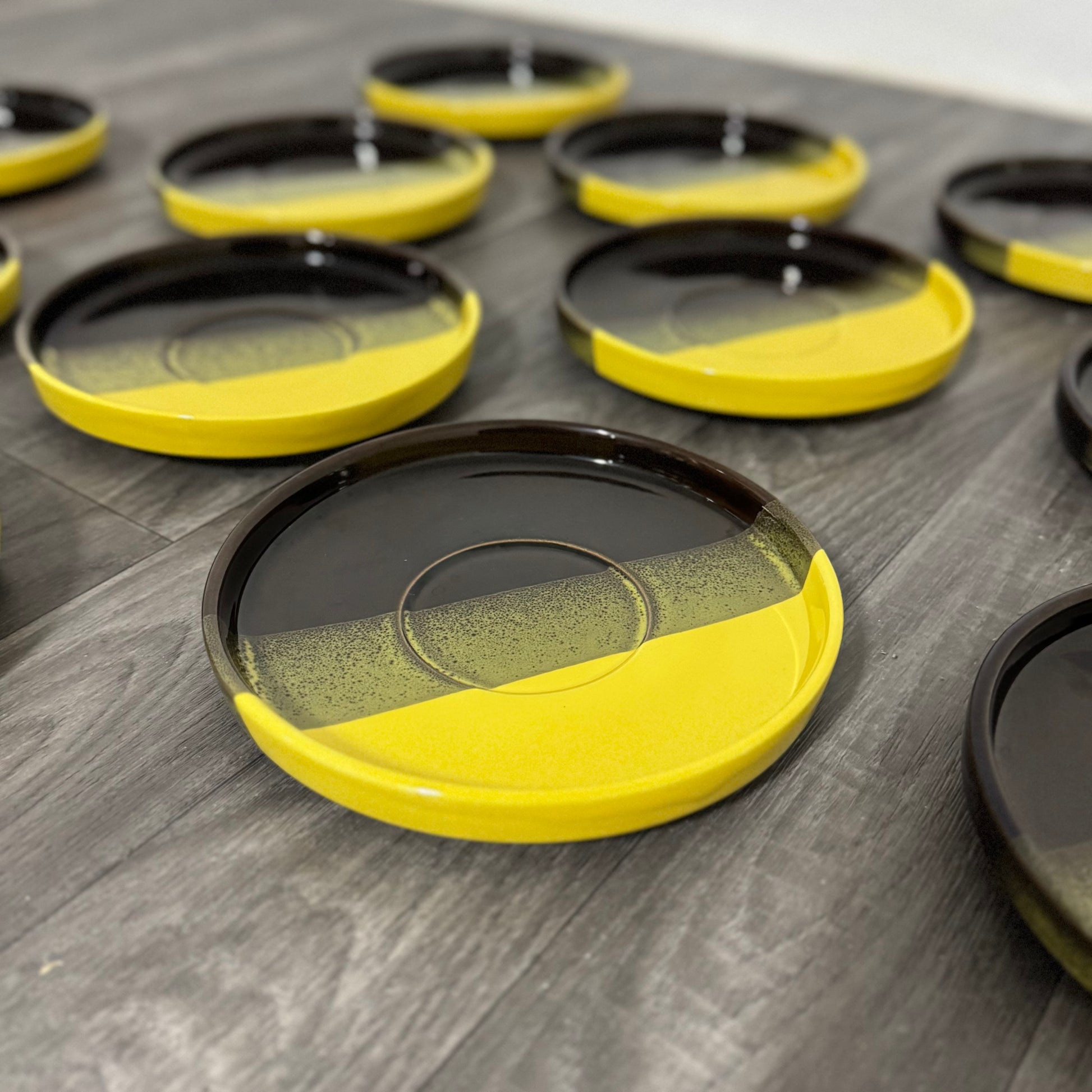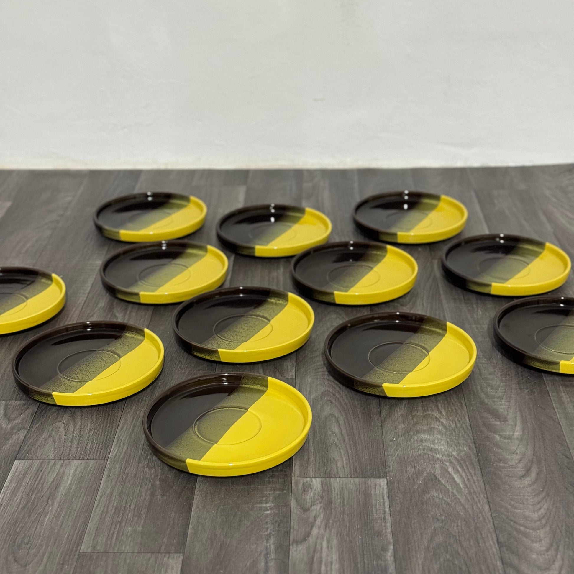 Ogni piatto presenta una decorazione tricolore in giallo vivo e marrone lucido, con una transizione sfumata che ne esalta la forma circolare e l’estetica futuristica tipica dell’epoca. Il risultato è un equilibrio perfetto tra funzionalità e stile decorativo, ideale per aggiungere un tocco rétro e pop alla tavola contemporanea.