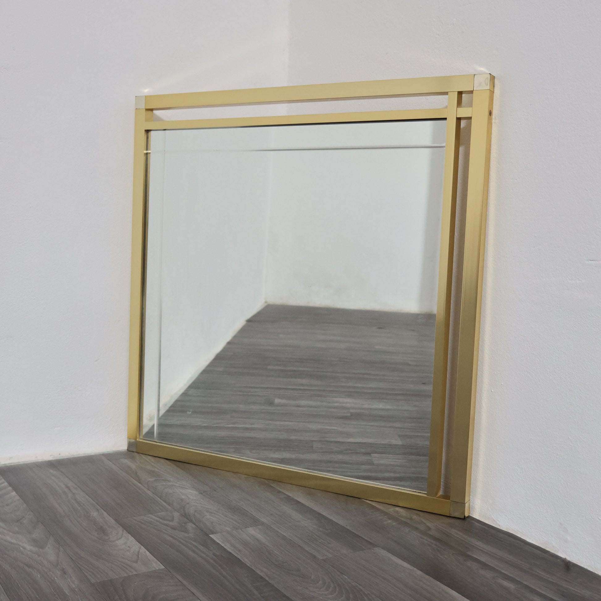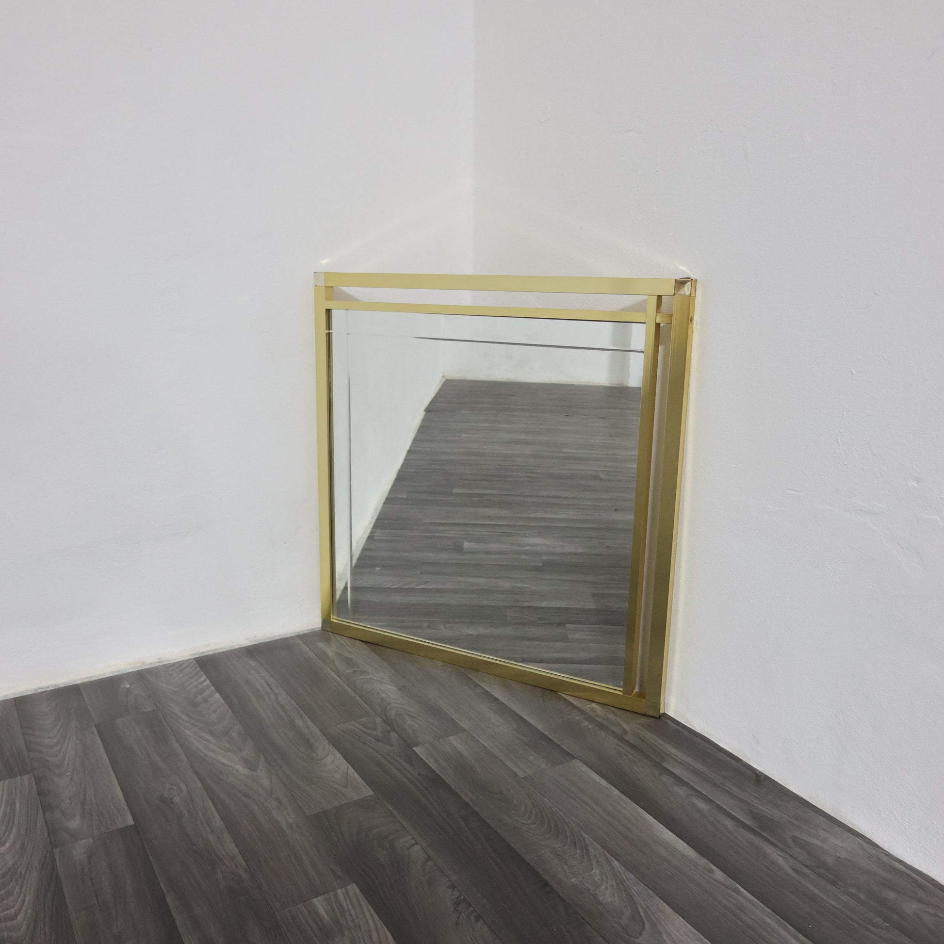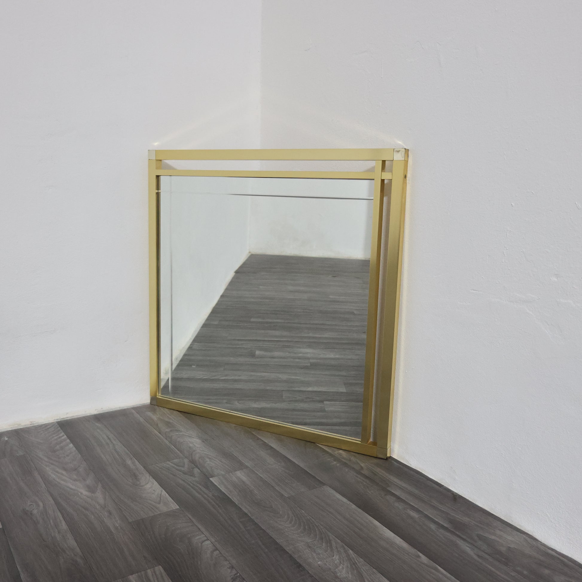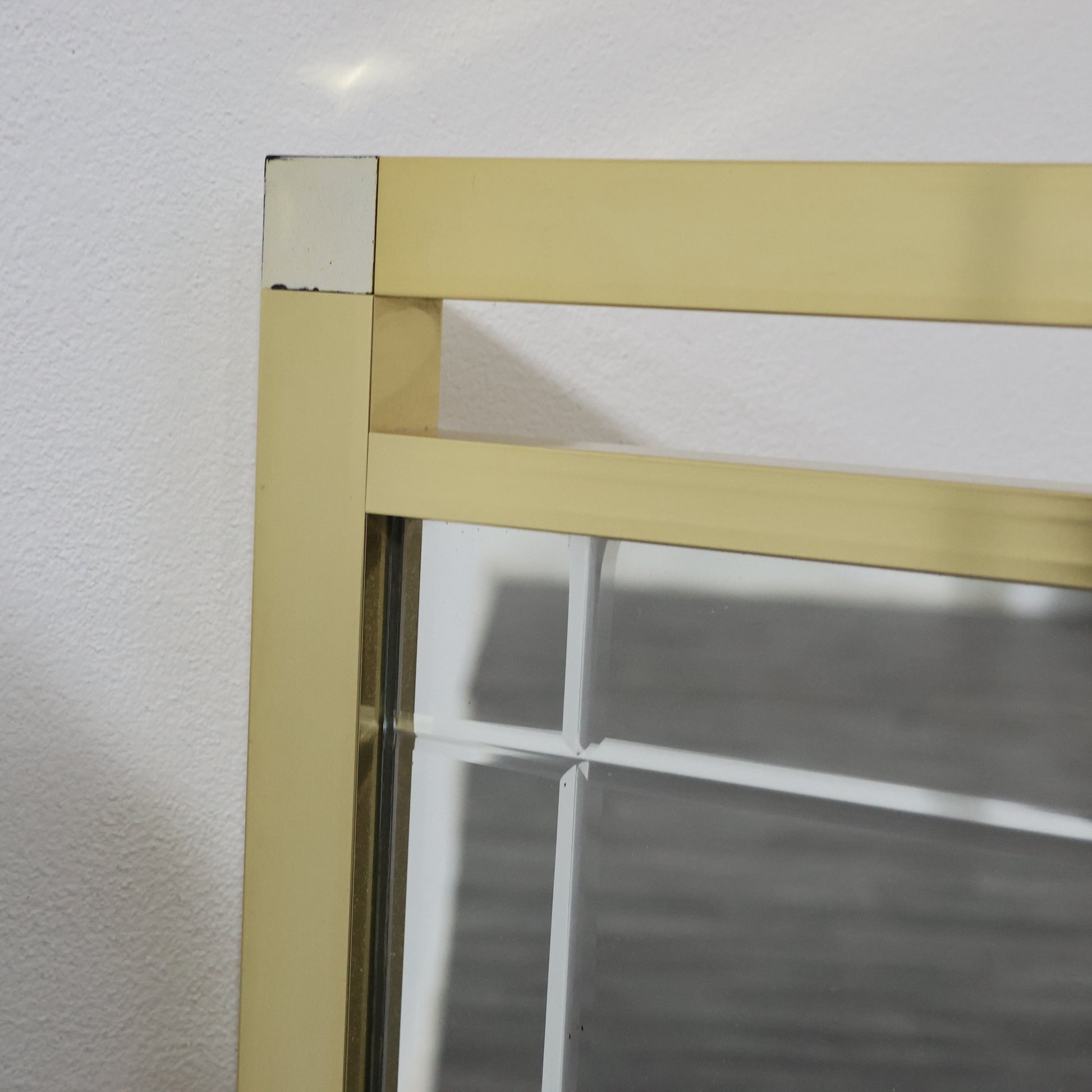 Elegante specchio da parete in stile Hollywood Regency, risalente agli anni ’70. Il pezzo presenta una raffinata cornice in metallo con finitura dorata, caratterizzata da linee pulite e forme geometriche tipiche del design decorativo dell’epoca.