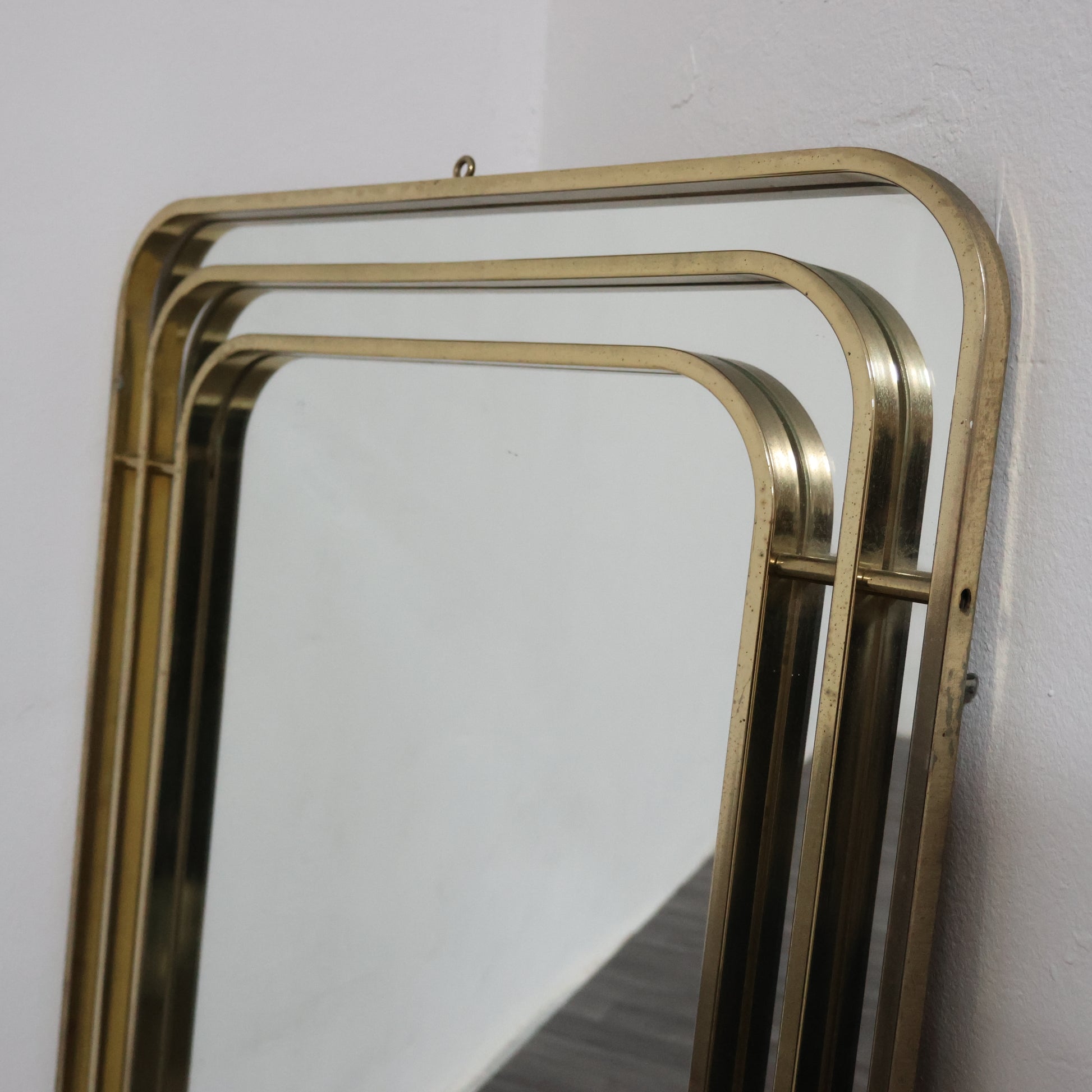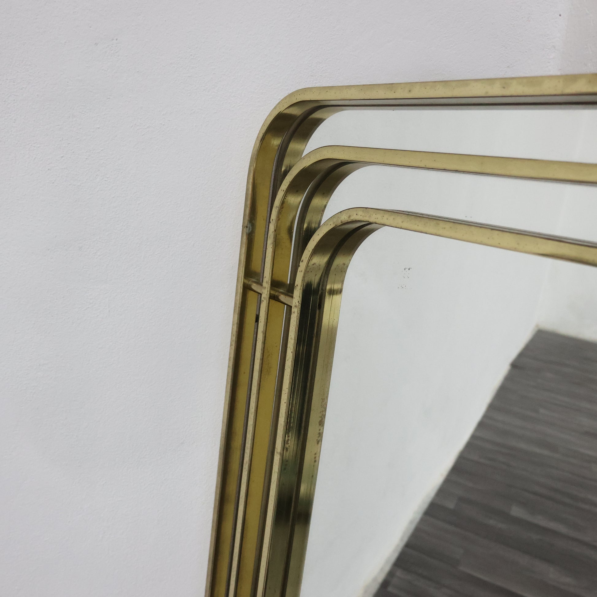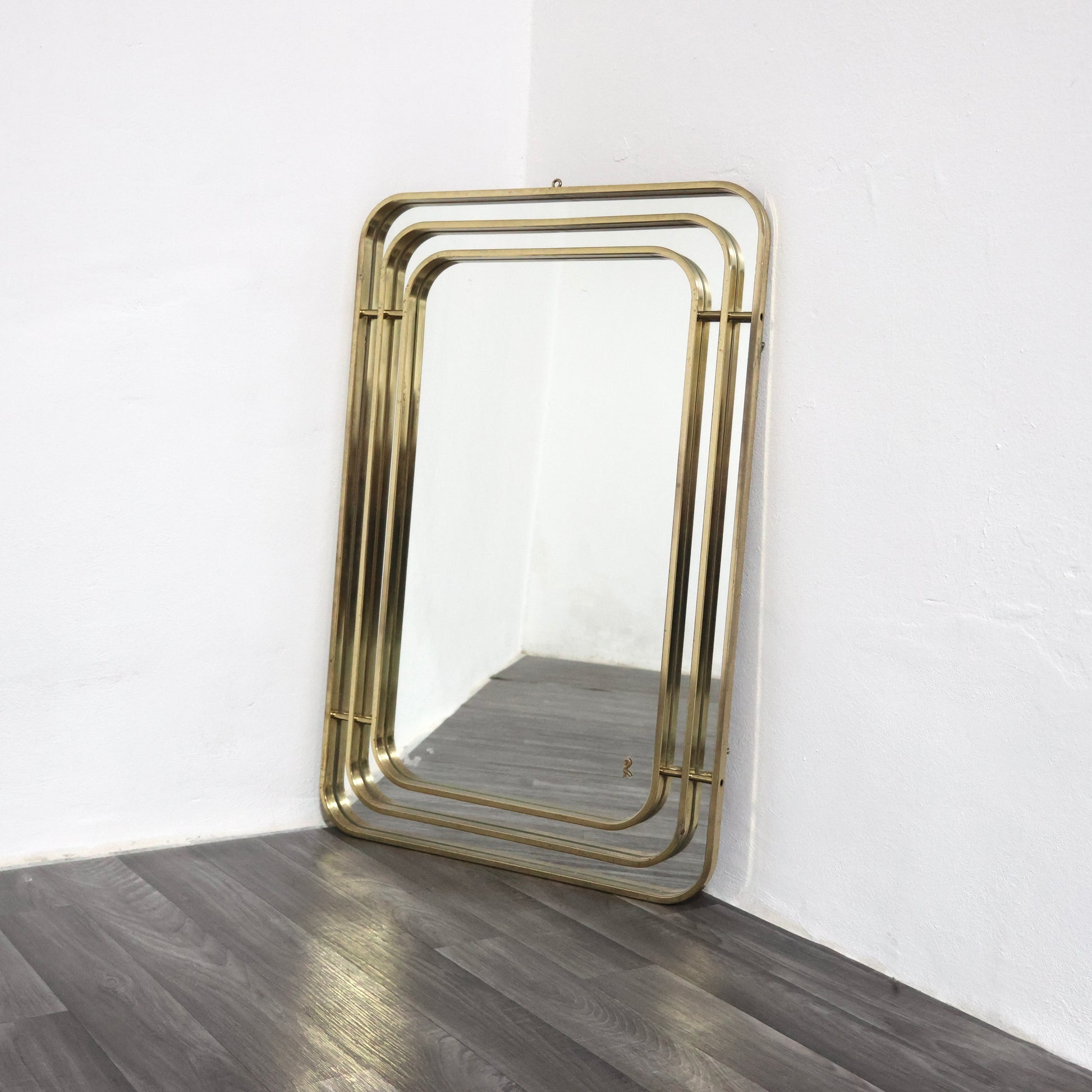 Elegante specchio da parete in stile Hollywood Regency, ispirato alle iconiche creazioni di Romeo Rega. Il design anni ’70 si distingue per la struttura geometrica e raffinata, caratterizzata da cornice in ottone con triplo profilo arrotondato, che conferisce profondità e un tocco di lusso tipico dell’epoca.