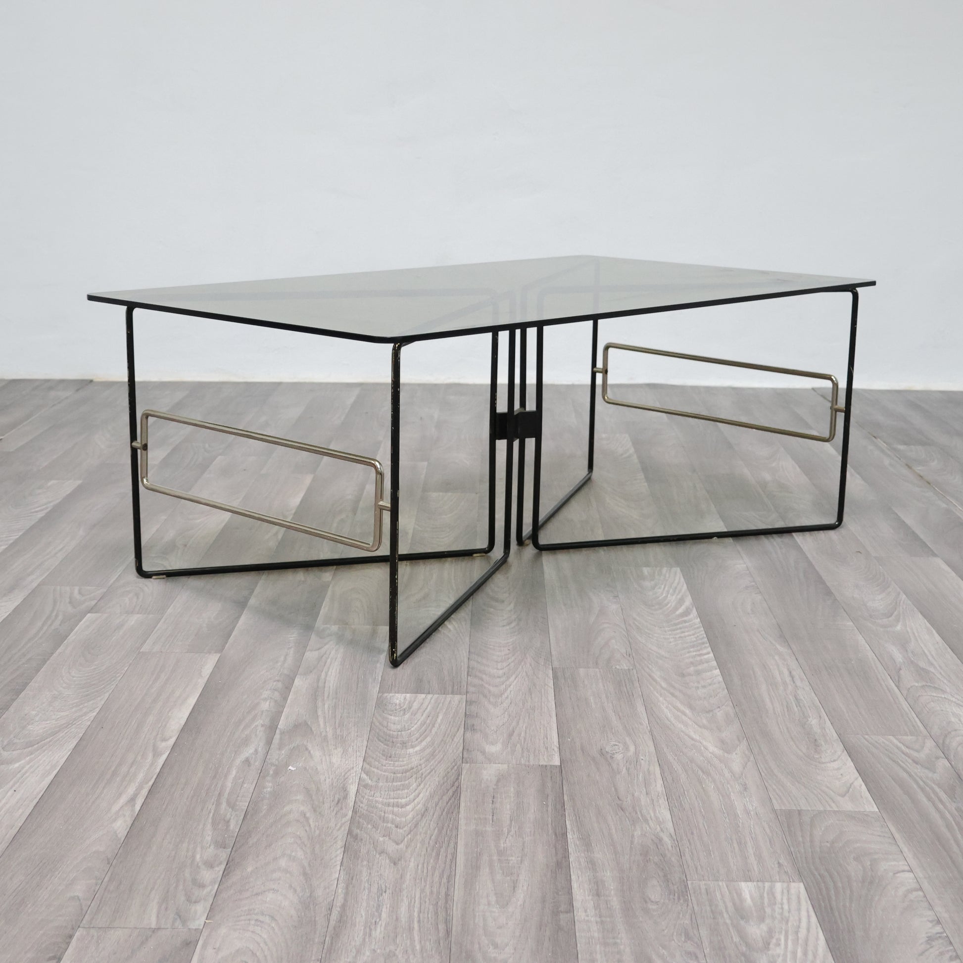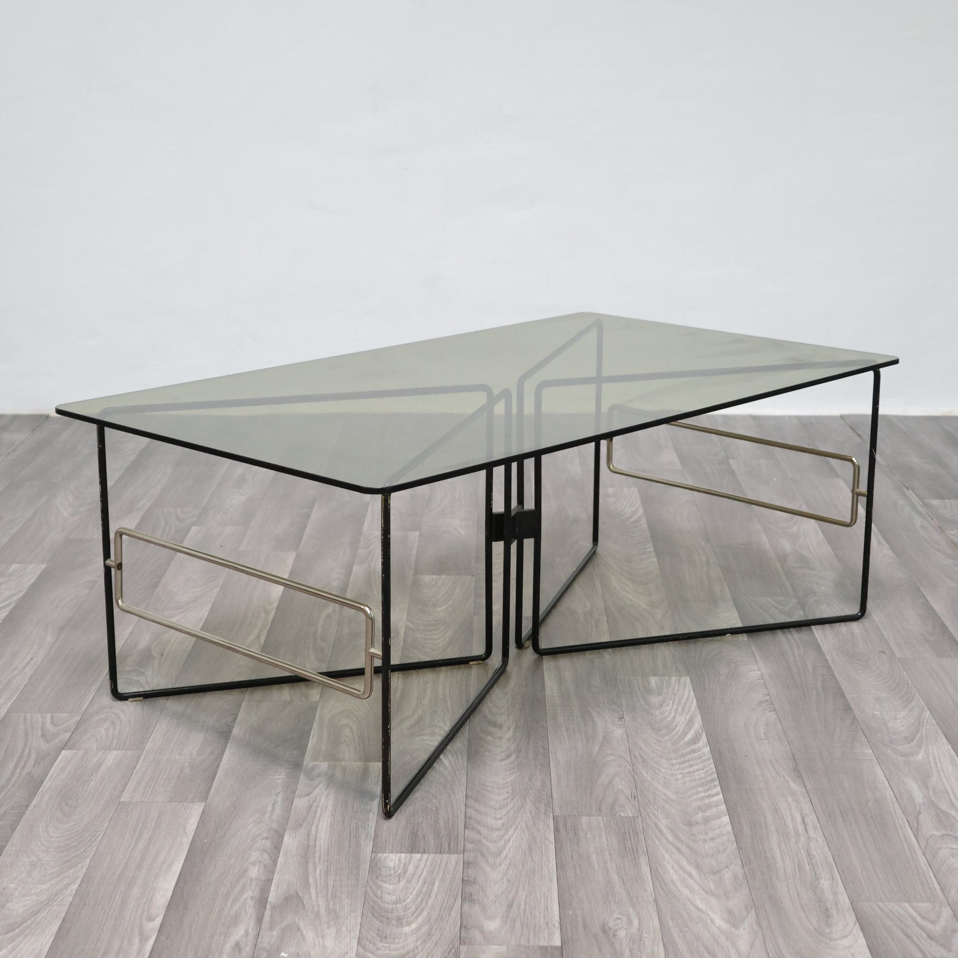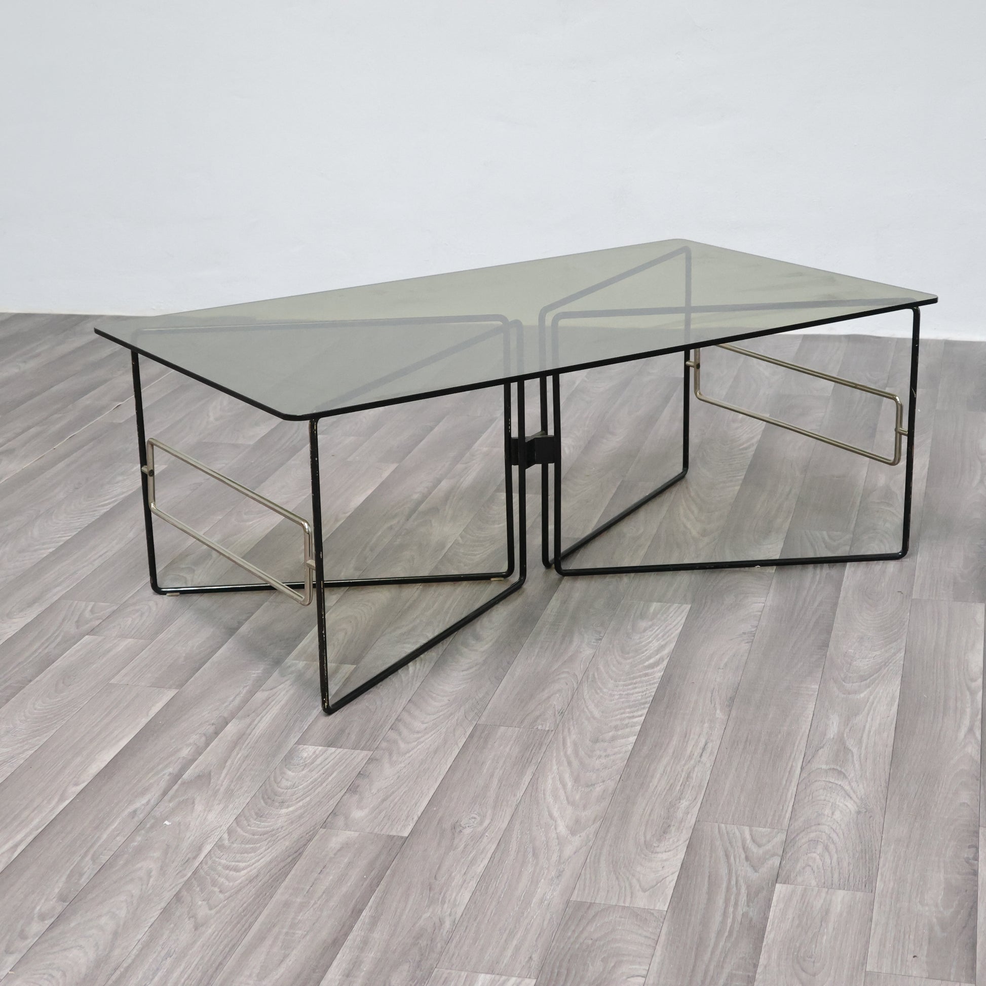 Elegante tavolino da caffè degli anni ’70, caratterizzato da un raffinato design geometrico tipico del modernariato. La struttura in metallo verniciato nero presenta linee sottili e giochi di forme incrociate, con dettagli metallici cromati che aggiungono un tocco di ricercata eleganza.
