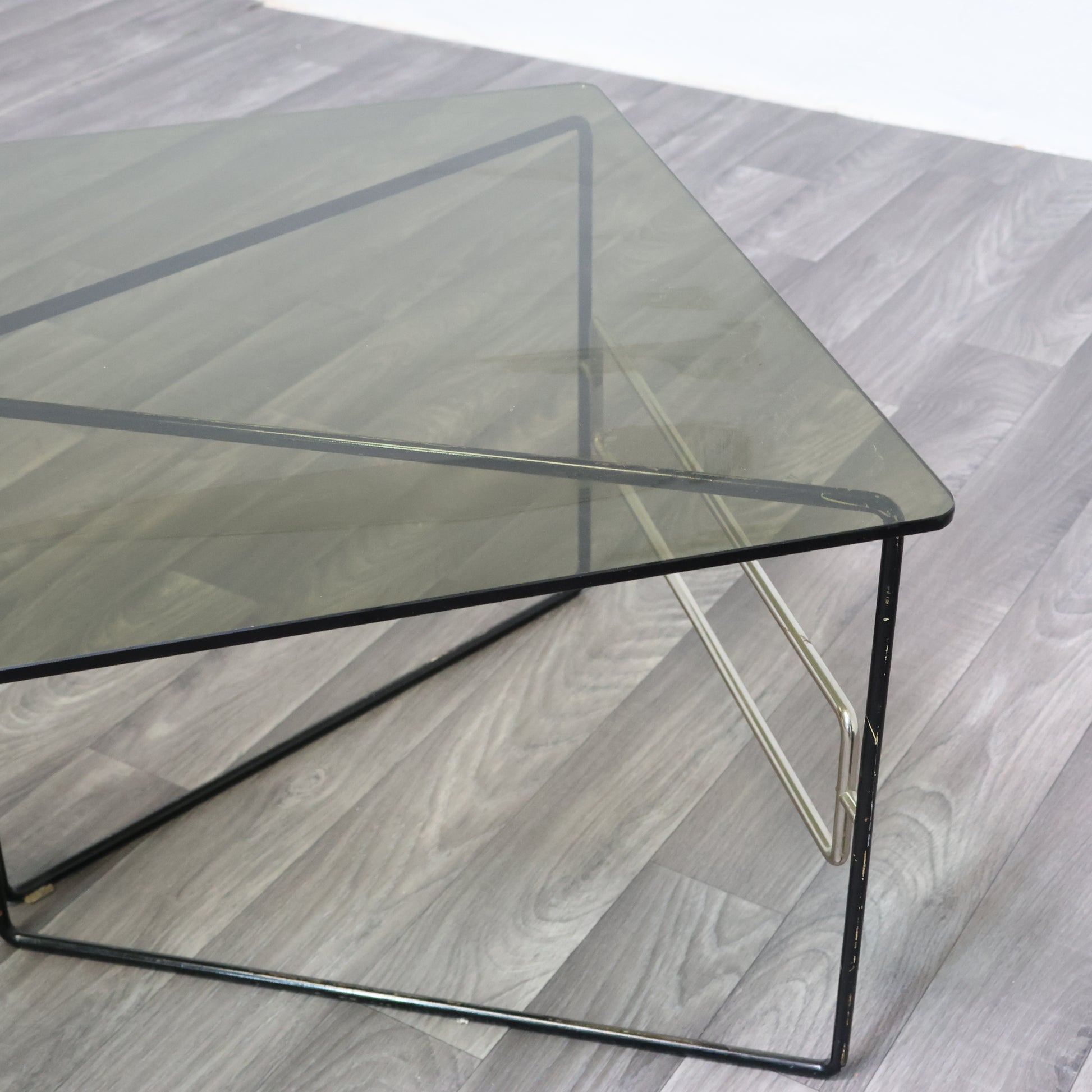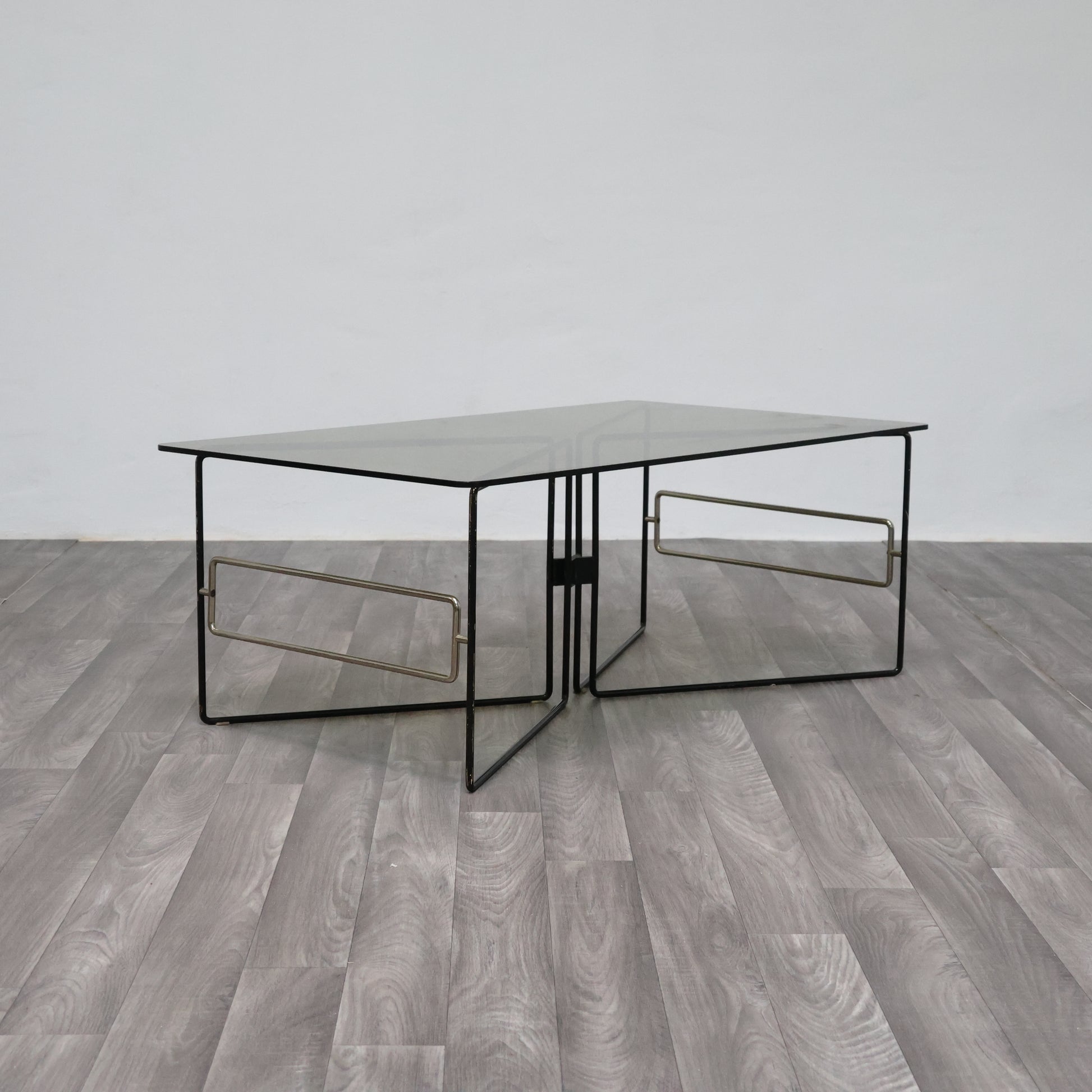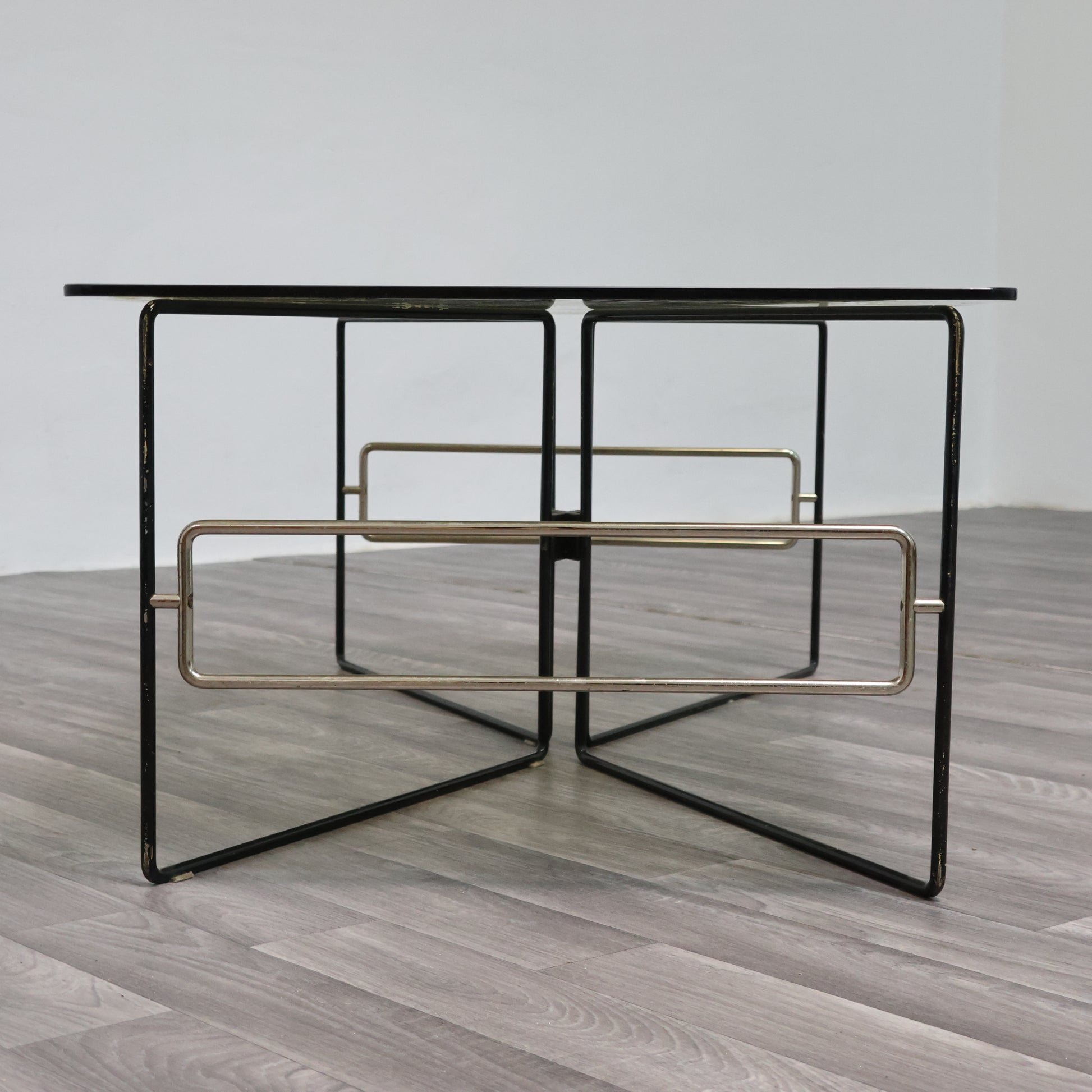 Elegante tavolino da caffè degli anni ’70, caratterizzato da un raffinato design geometrico tipico del modernariato. La struttura in metallo verniciato nero presenta linee sottili e giochi di forme incrociate, con dettagli metallici cromati che aggiungono un tocco di ricercata eleganza.