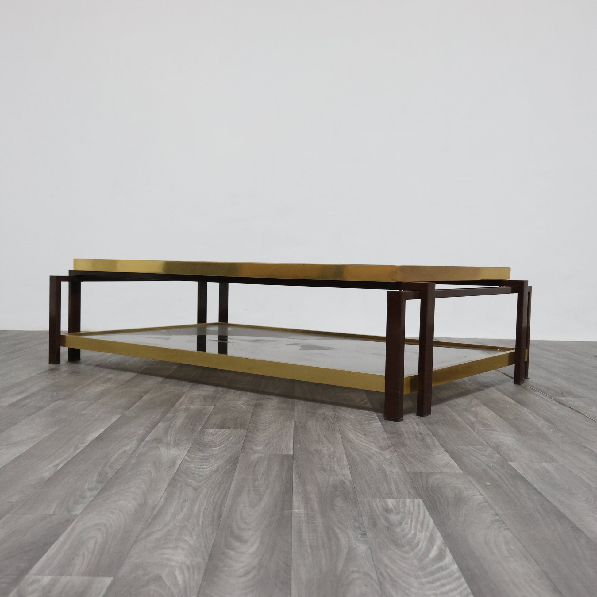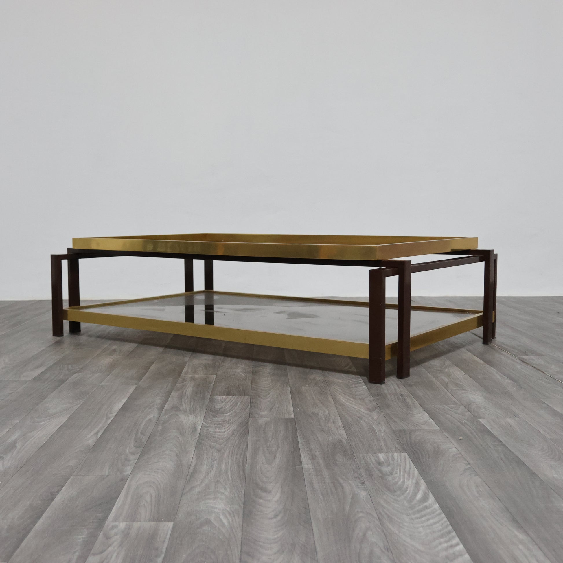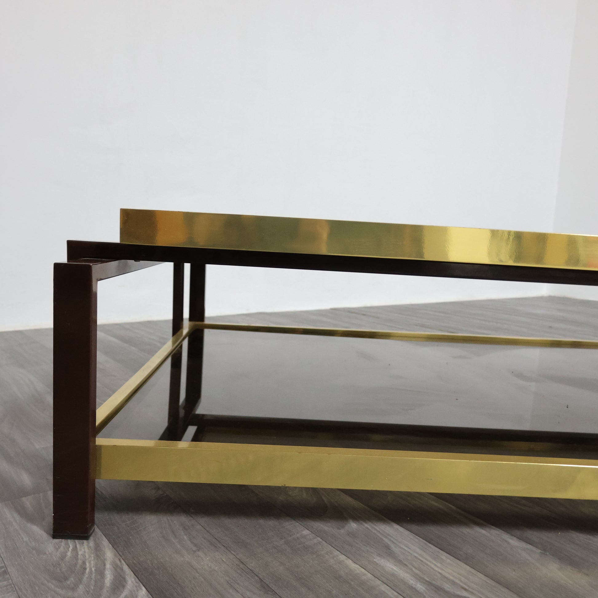 Iconico tavolo da salotto risalente agli anni ’70 in stile Hollywood Regency, caratterizzato da una sofisticata struttura geometrica in metallo laccato marrone e dorato. Il design pulito ed elegante si distingue per l’armoniosa combinazione di materiali: vetro trasparente e cornici dorate lucide che conferiscono luce e raffinatezza all’arredo.