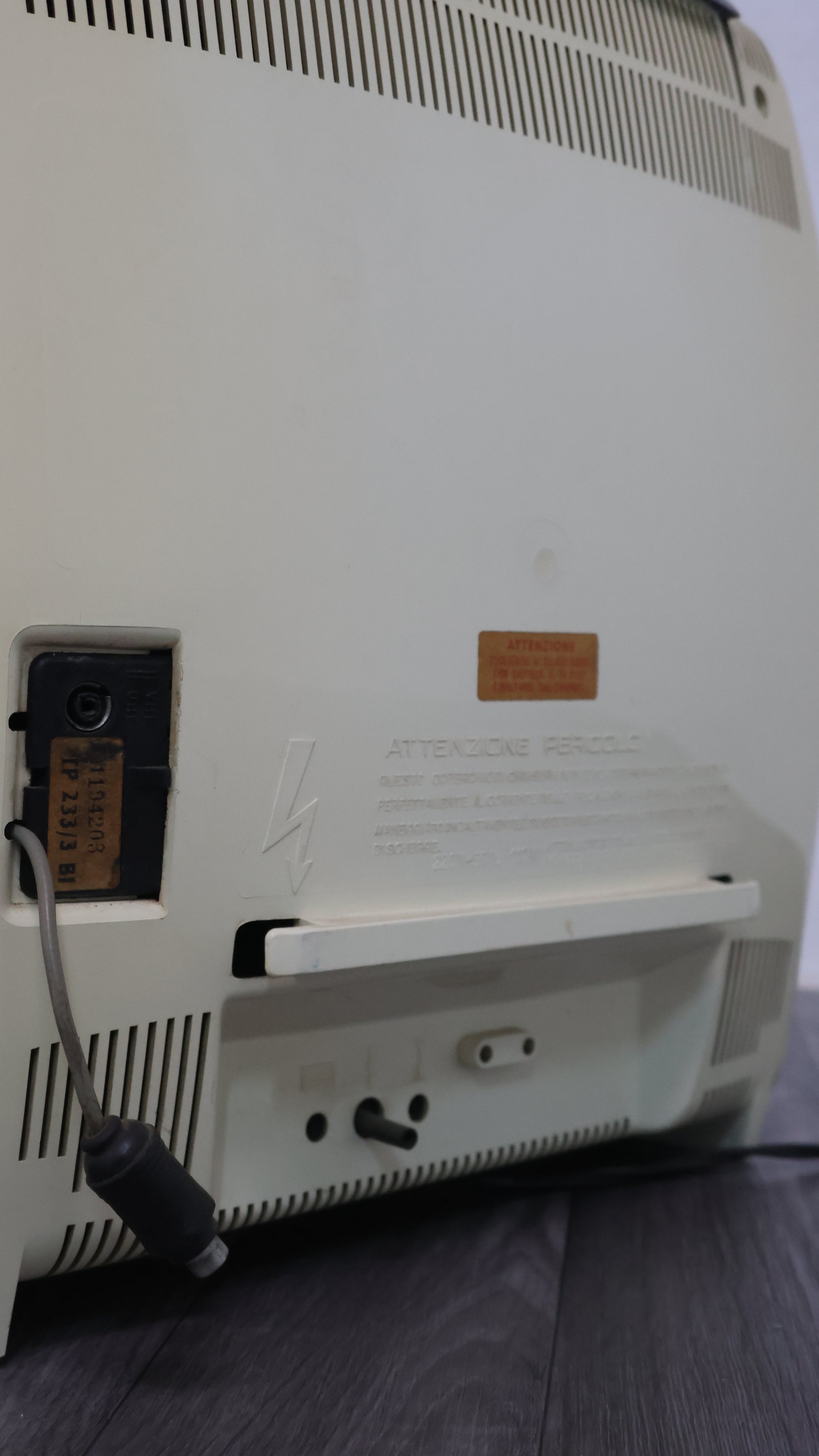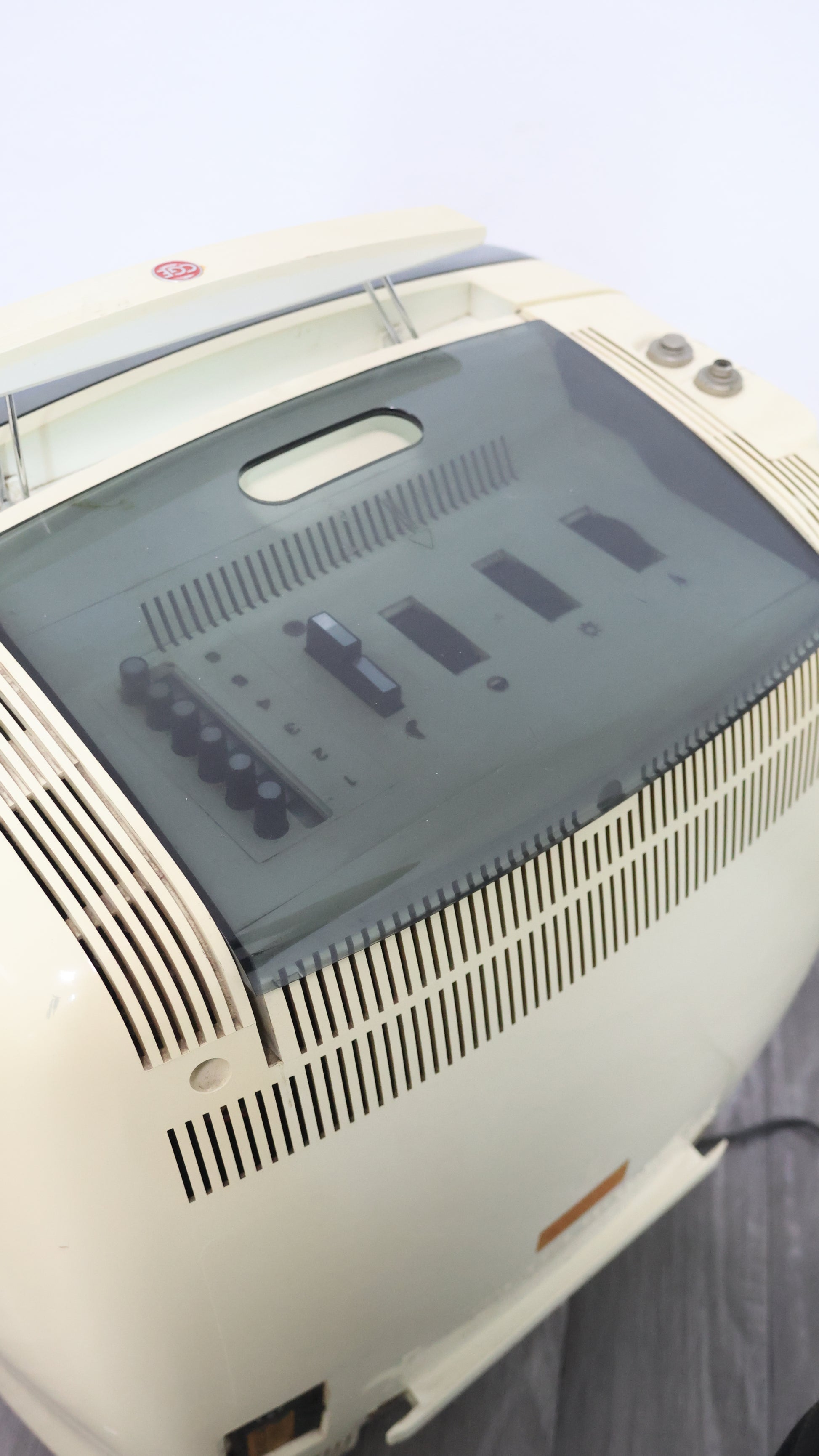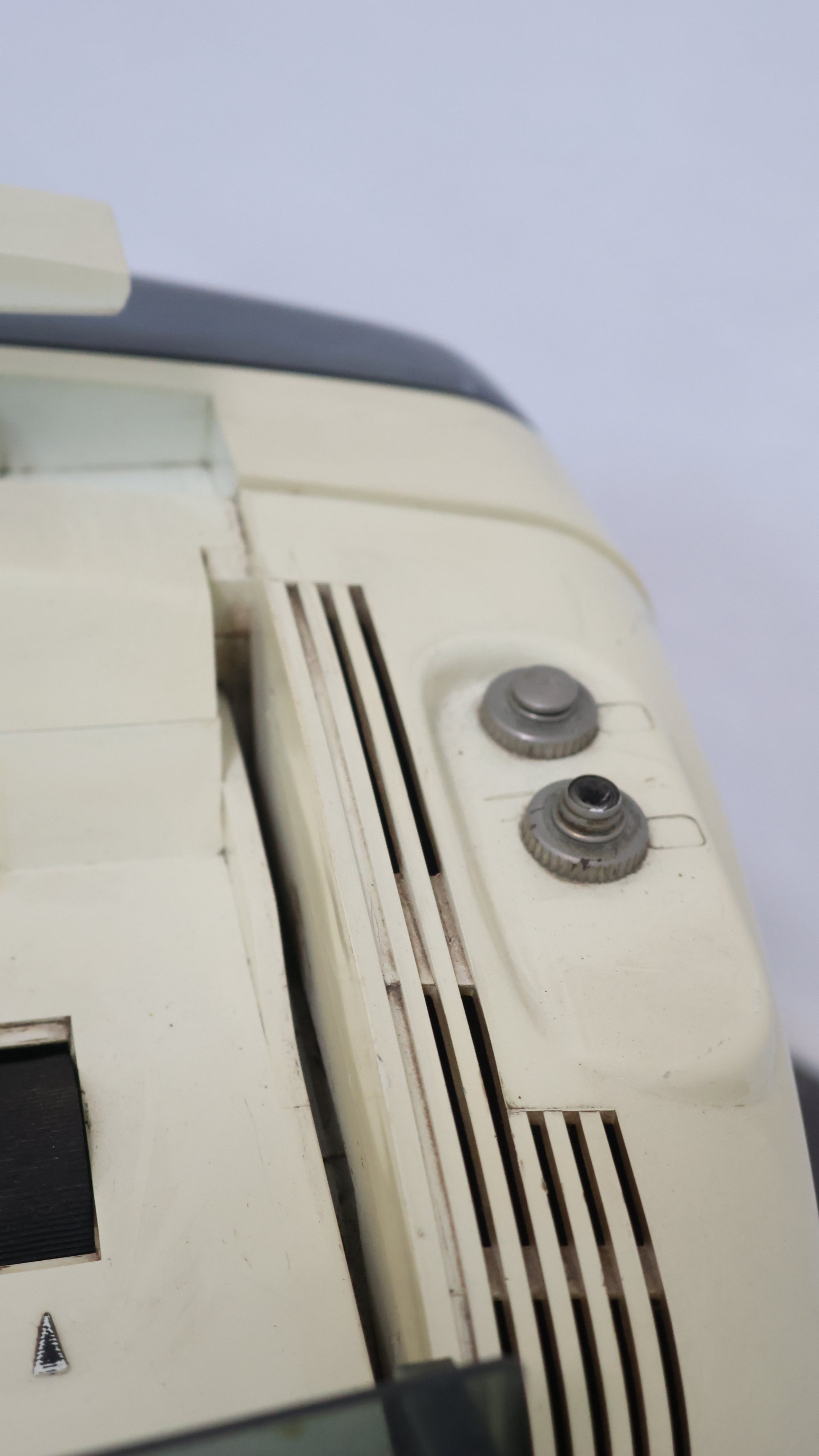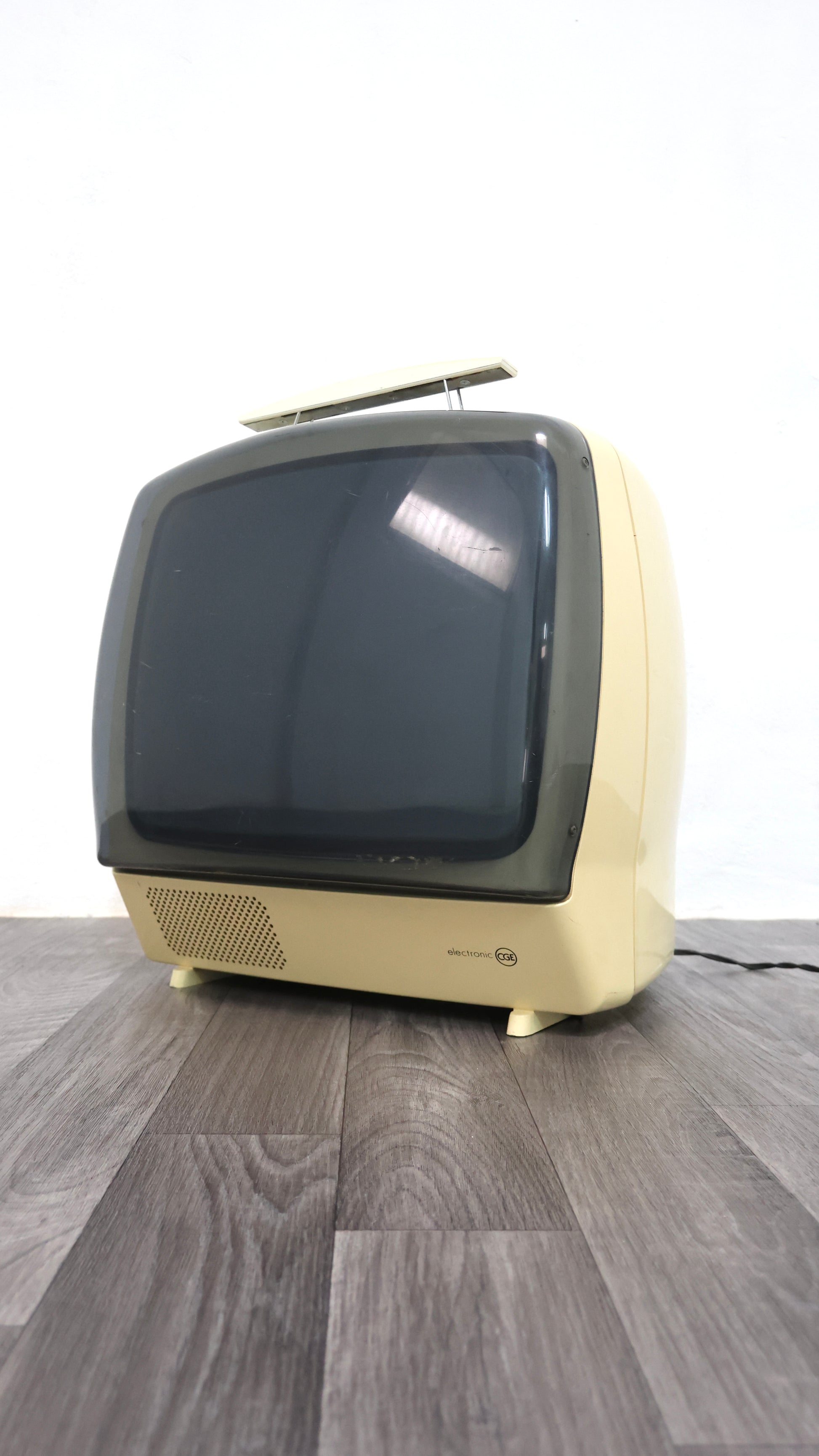 Il corpo in plastica avorio con schermo bombato e dettagli in plexiglass fumé riflette perfettamente le linee futuristiche del periodo, quando tecnologia e design si fondevano per creare oggetti tanto funzionali quanto scenografici. L’antenna telescopica e il pannello comandi superiore conferiscono al pezzo un carattere autentico e d’epoca.